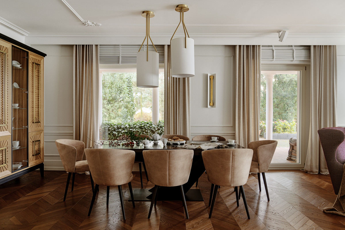 Na drugim końcu holu zaaranżowano jadalnię z salonem i wyjściem na ogród. To prawdziwie rodzinna przestrzeń z dużym stołem, wygodnymi, rozłożystymi sofami i nastrojowym oświetleniem. Na uwagę zasługuje też kominek – oryginalny element zachowany z poprzedniego wystroju, który świetnie wpisuje się w nową wizję przestrzeni. Na ścianie obok wyeksponowano ulubione obrazy właściciela – zbierane przez lata pejzaże, które współgrają z pracami trójmiejskiego malarza Tomasza Kołodziejczyka oraz Julity Malinowskiej. Charakteru aranżacji dodają również wykonane na zamówienie meble: dwie komody i witryna. Zostały zaprojektowane przez pracownię Magdaleny Bielickiej w taki sposób, by subtelnie połączyć klasykę z nowoczesnością.