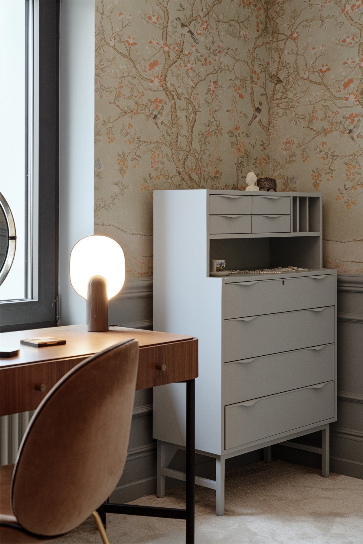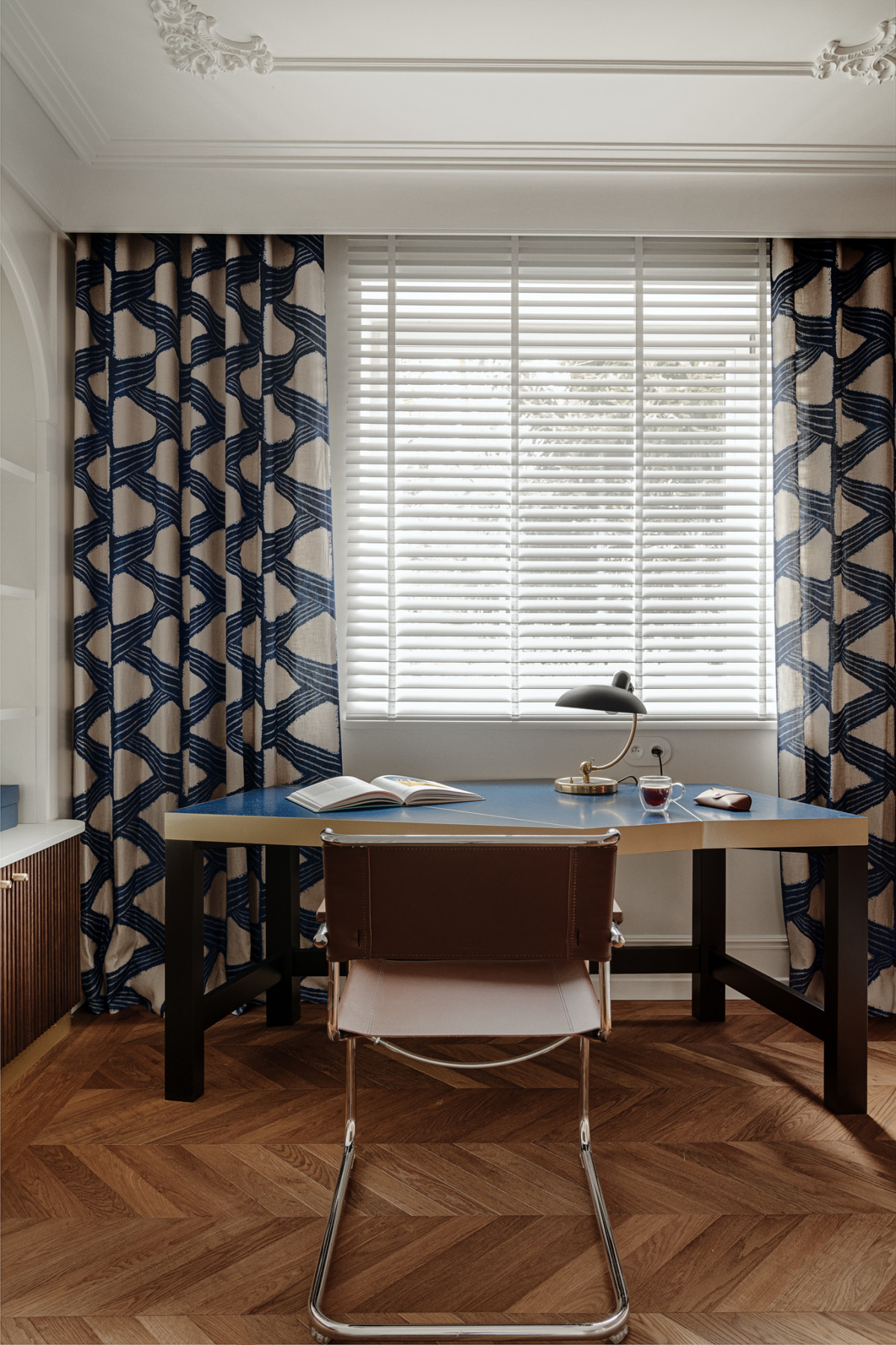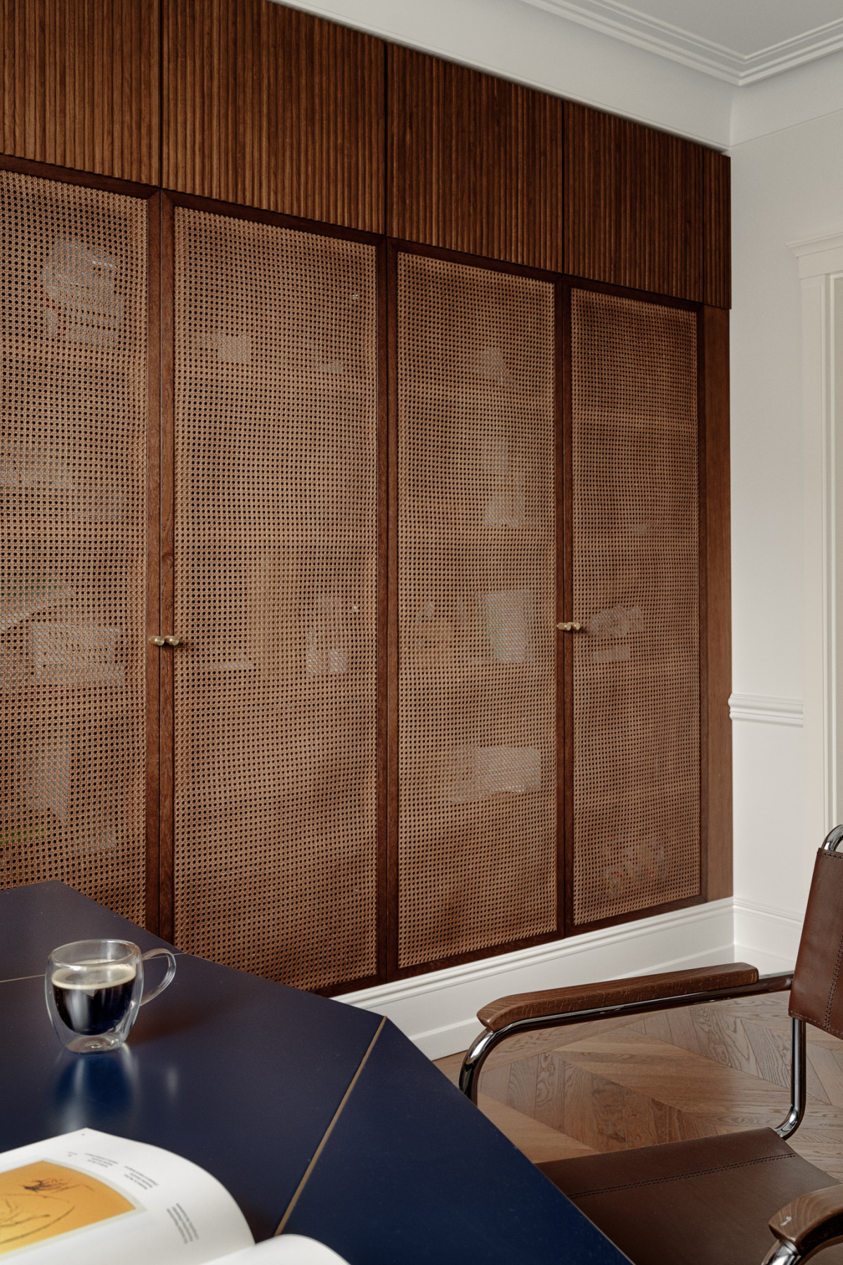 Na parterze znalazło się tez miejsce dla gabinetu. Tutaj ciepłe barwy i stonowane kolory służą skupieniu i pracy. Centralne miejsce zajmuje wykonane na zamówienie biurko oraz kultowy fotel Thonet S34. Wzrok przykuwa także pojemna szafa, której fronty wykonano z francuskiej rafii.