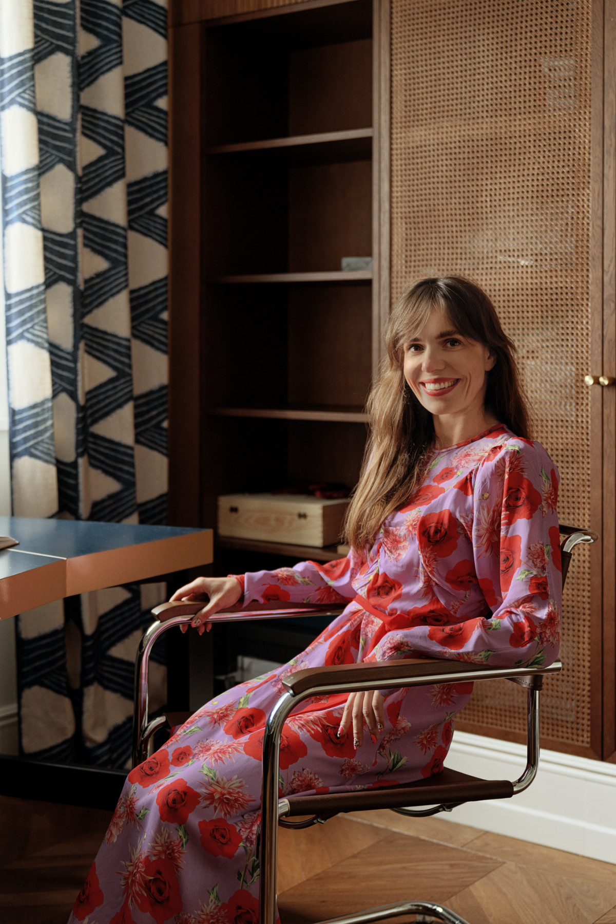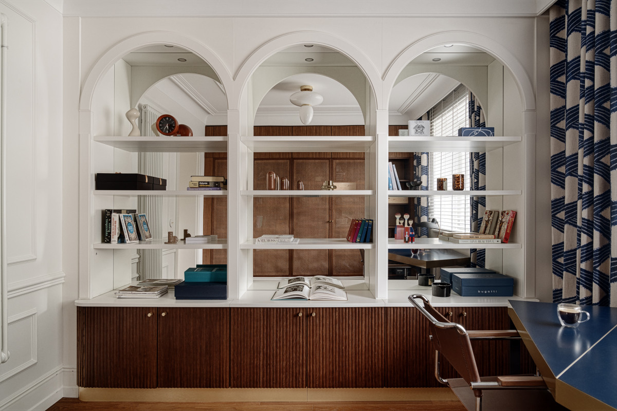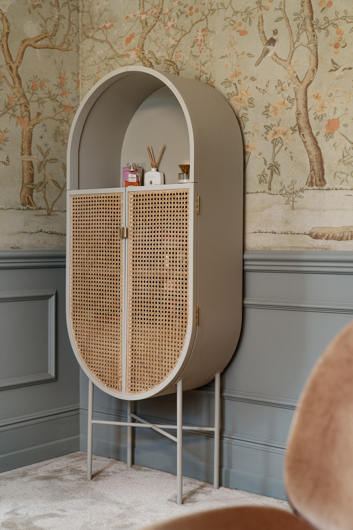 Na parterze znalazło się tez miejsce dla gabinetu. Tutaj ciepłe barwy i stonowane kolory służą skupieniu i pracy. Centralne miejsce zajmuje wykonane na zamówienie biurko oraz kultowy fotel Thonet S34. Wzrok przykuwa także pojemna szafa, której fronty wykonano z francuskiej rafii.