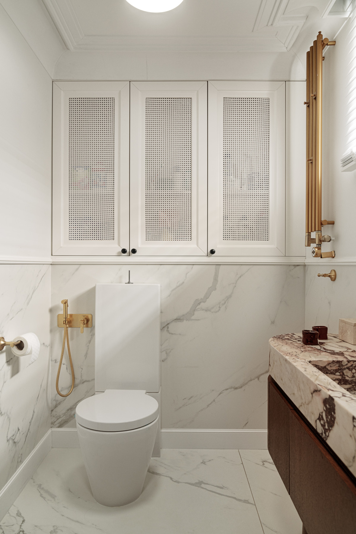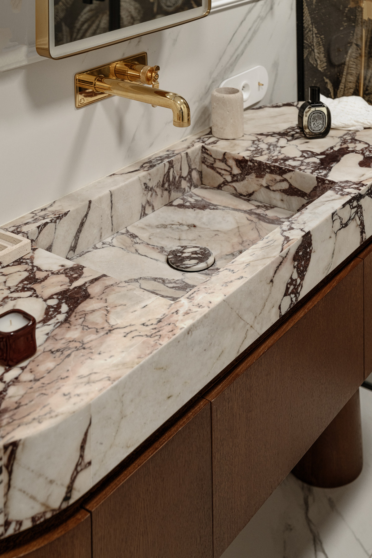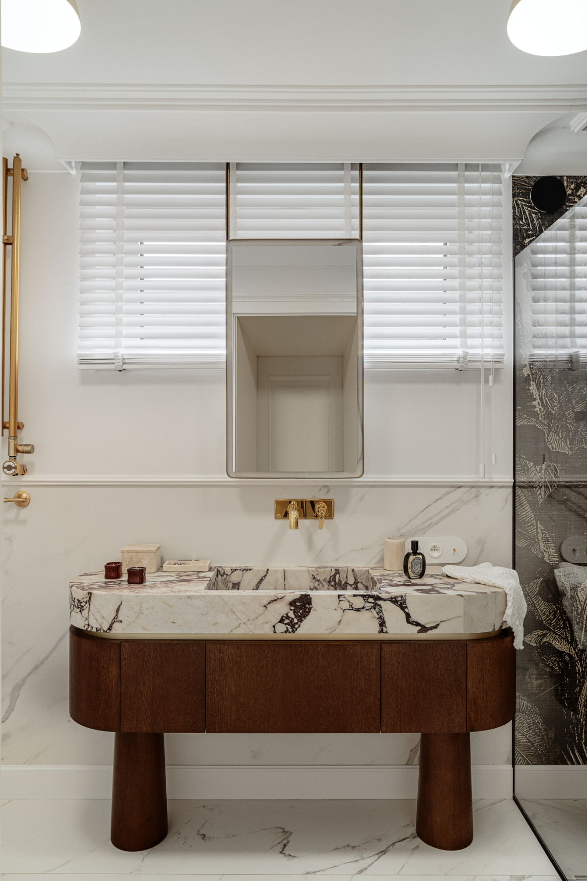Projektując łazienkę, starano się maksymalnie wykorzystać niewielkie okno jako źródło naturalnego światła. Pod nim ustawiono wykonaną na zamówienie komodę z umywalką i lustrem. Solidny mebel na grubych nóżkach, dźwigający umywalkę z kamienia Calacatta Viola gra w łazience pierwsze skrzypce.