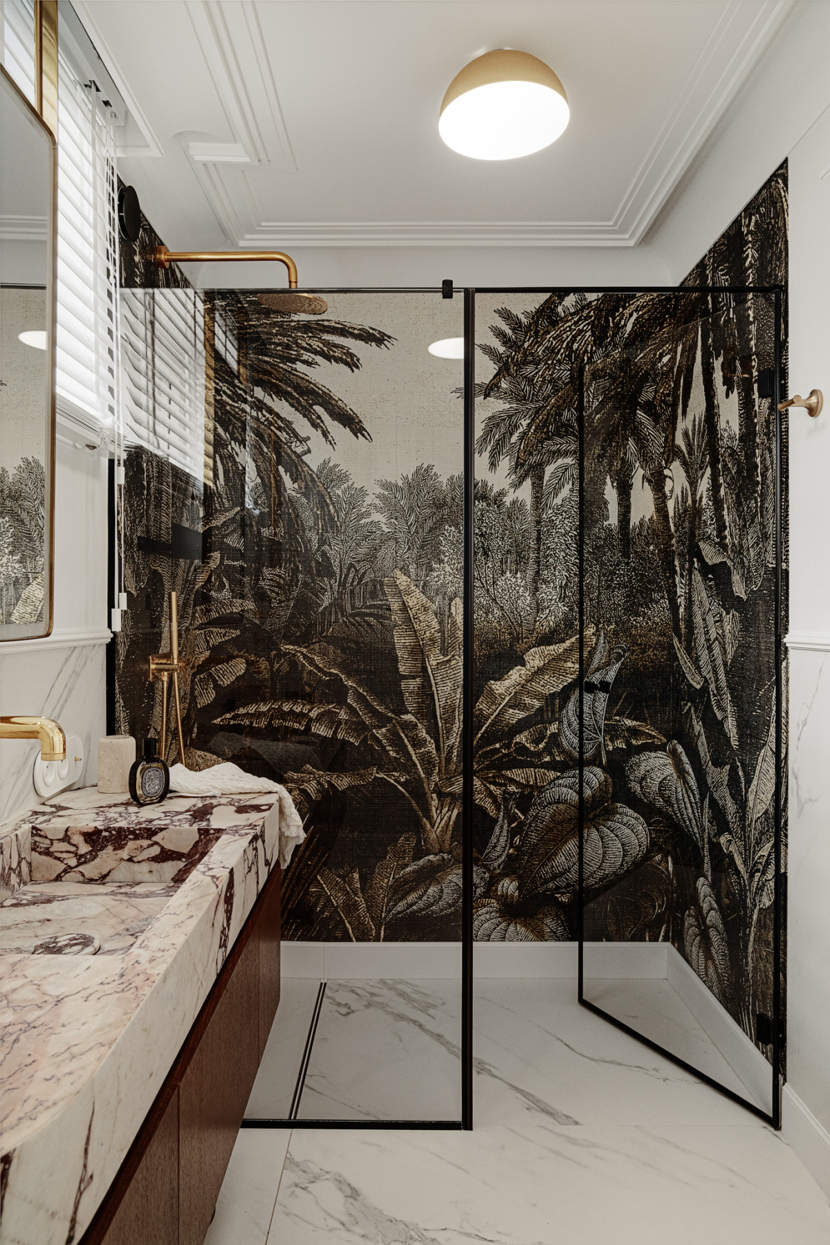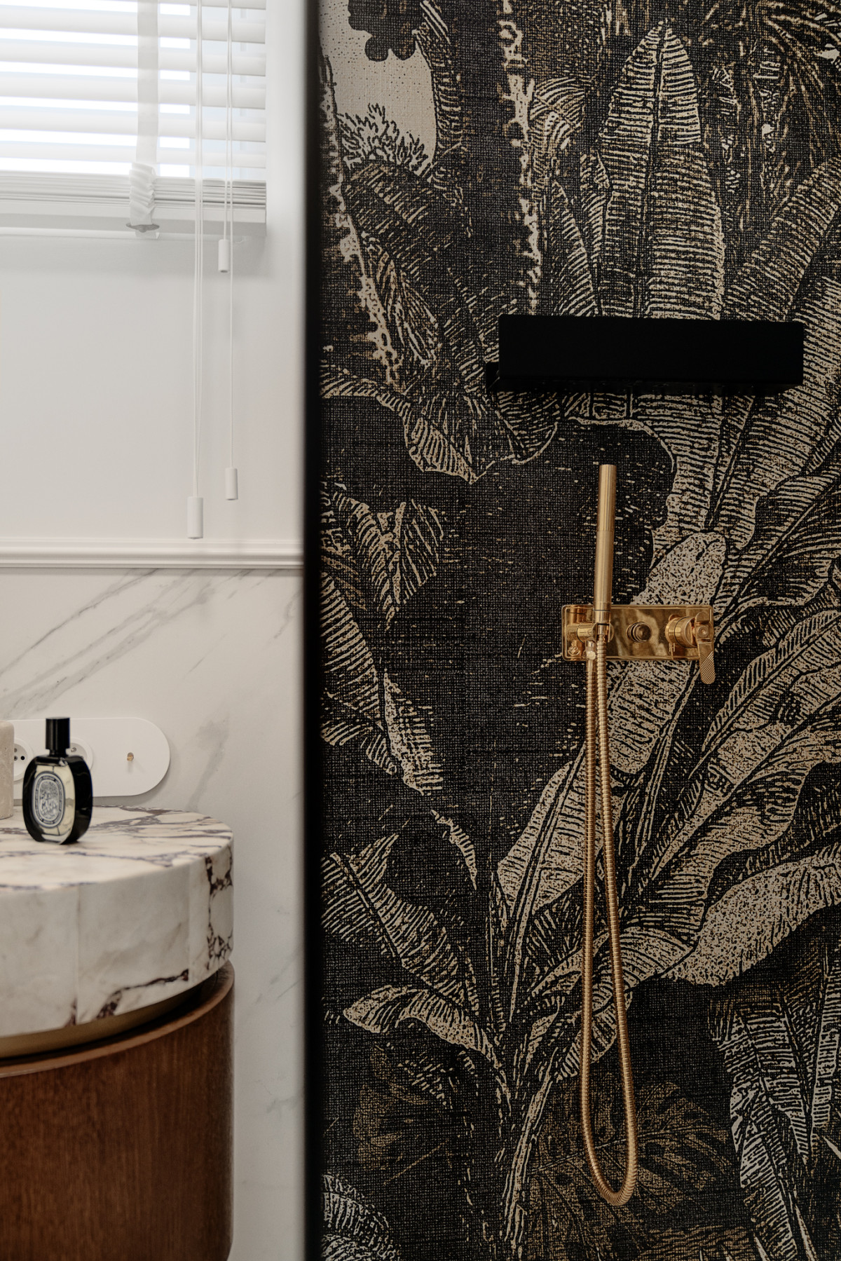W strefie prysznica zastosowano dekoracyjną tapetę o strukturze tkaniny, która ociepla przestrzeń i nadaje jej charakter eleganckiego salonu kąpielowego. Płytki z delikatnym rysunkiem oraz meble wykończone białą rafią tworzą naturalne tło dla wyrazistej tapety i kamiennego detalu.