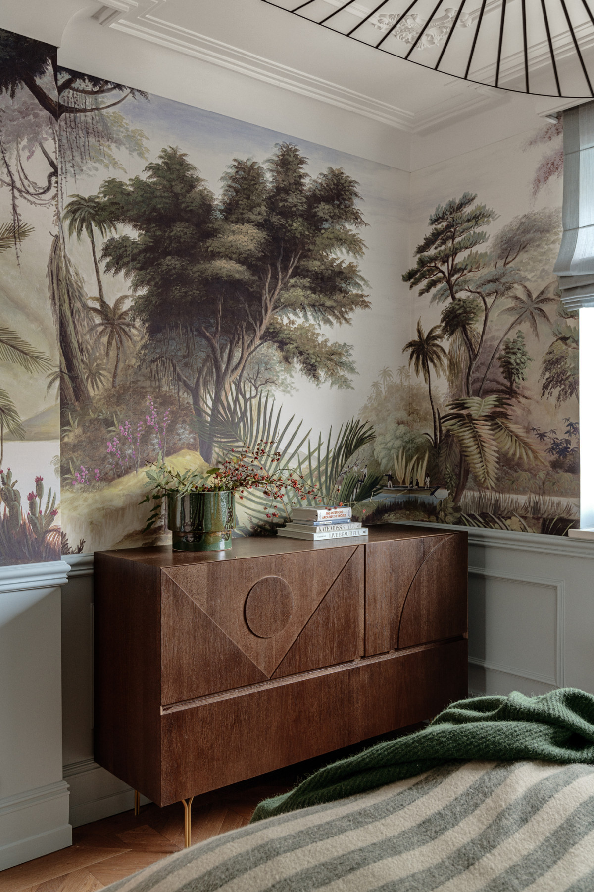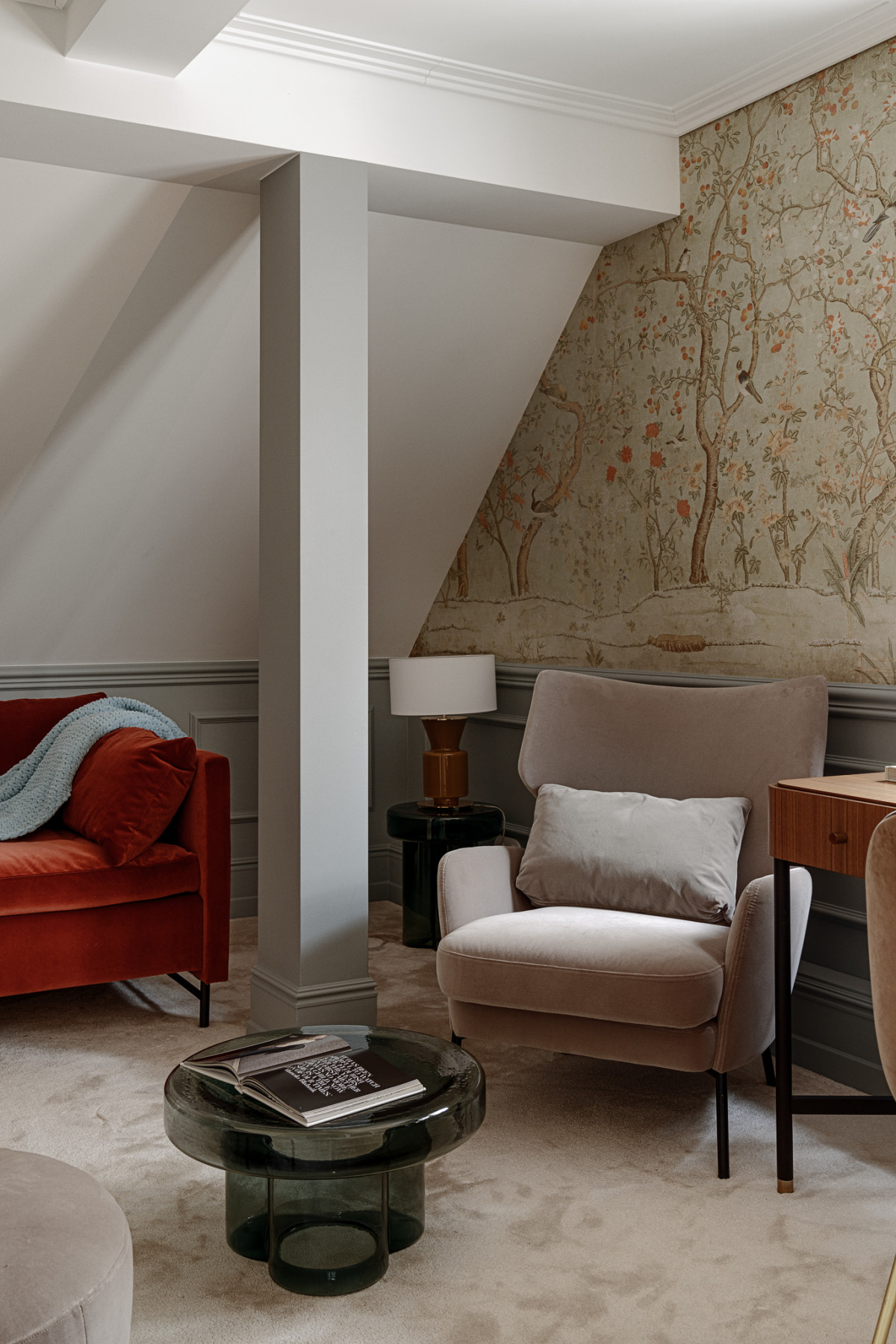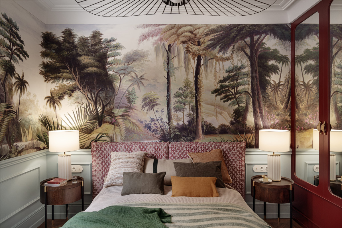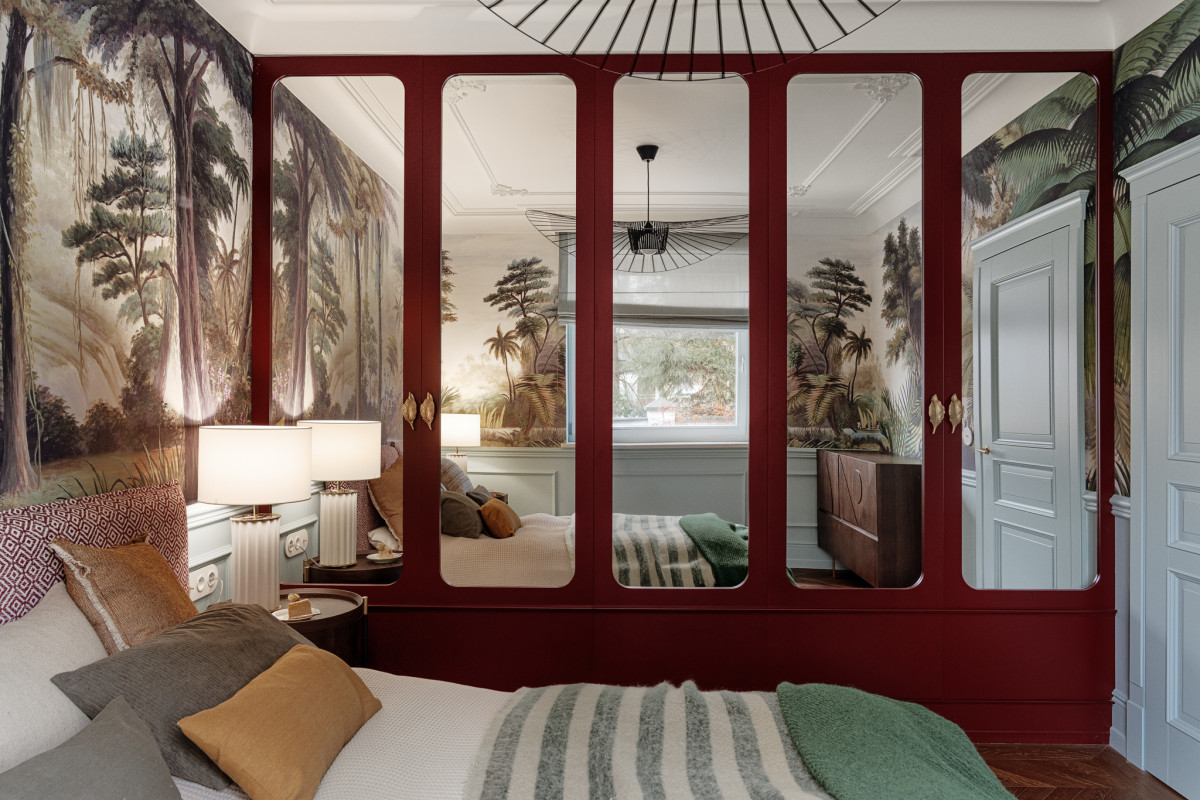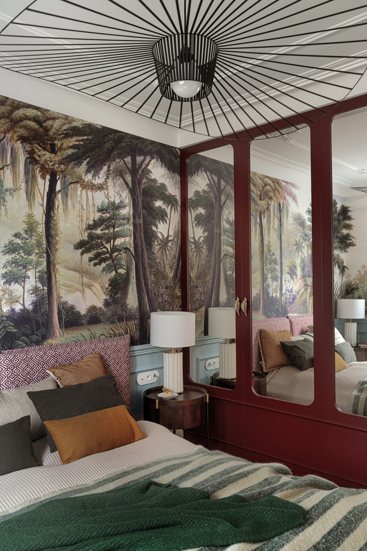 Inspiracją dla wystroju strefy prywatnej była natura. Otaczające dom drzewa przenikają do sypialni pod postacią stylowych tapet nawiązujących do malarstwa pejzażowego. Niczym korona drzew, nad łóżkiem w sypialni zawisła kultowa francuska lampa Vertigo. Z kolei szafa w kolorze czerwonego wina z obłymi taflami luster optycznie powiększa wnętrze.