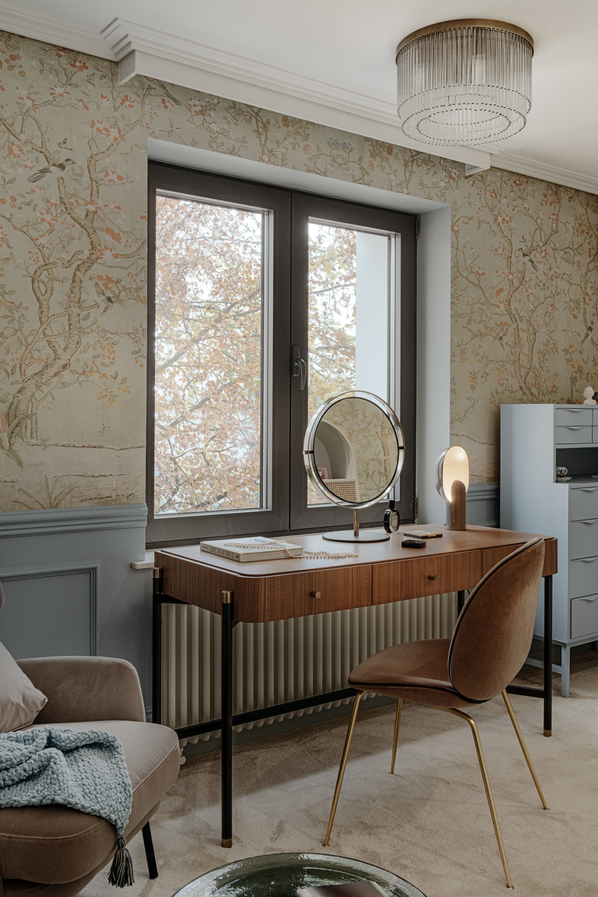 Na uwagę zasługuje też powder room, czyli pokój toaletowy, który projektantka wyłożyła finezyjną pastelową tapetą, korespondującą z miękkimi welurowymi meblami i szklanymi stolikami. Centralnym punktem wnętrza jest toaletka na osi okna i regalik na biżuterię, który mimo duńskiego rodowodu, świetnie wpasowuje się w eklektyczny styl pomieszczenia.