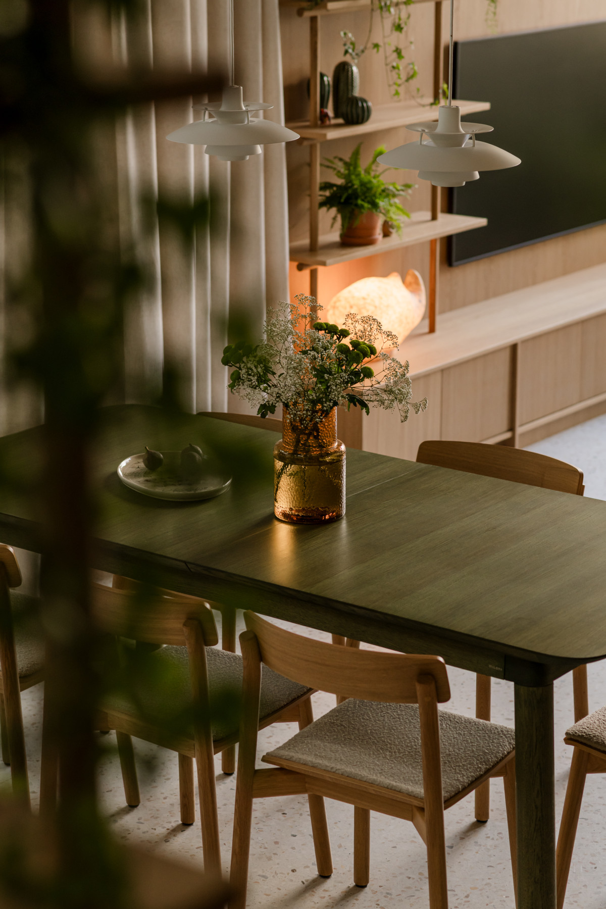 Centralnym punktem domu i miejscem spotkań domowników jest drewniany stół w kolorze zielonym. Obok stołu znajduje się fornirowa zabudowa z pionowymi modernistycznymi akcentami, które pojawiają się również w innych meblach jak regał przy kanapie czy meble w sypialniach i łazienkach.