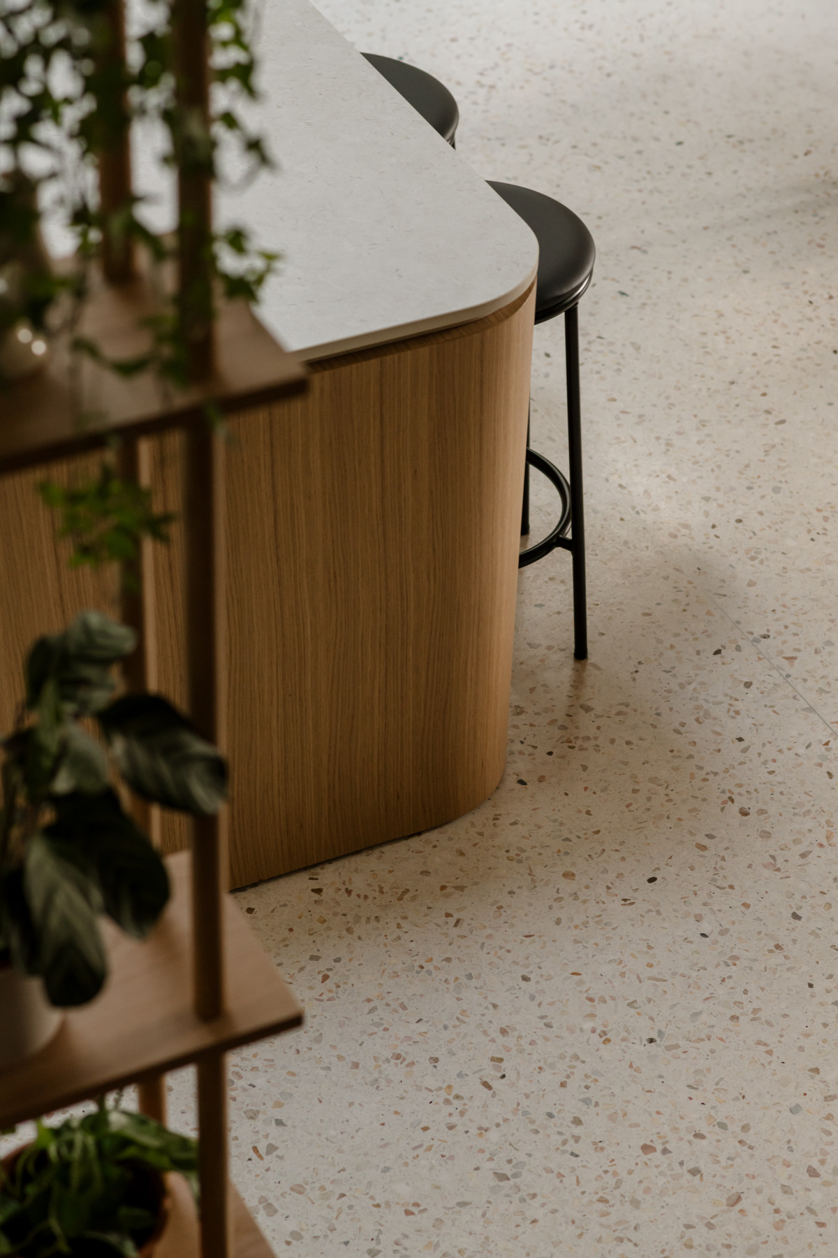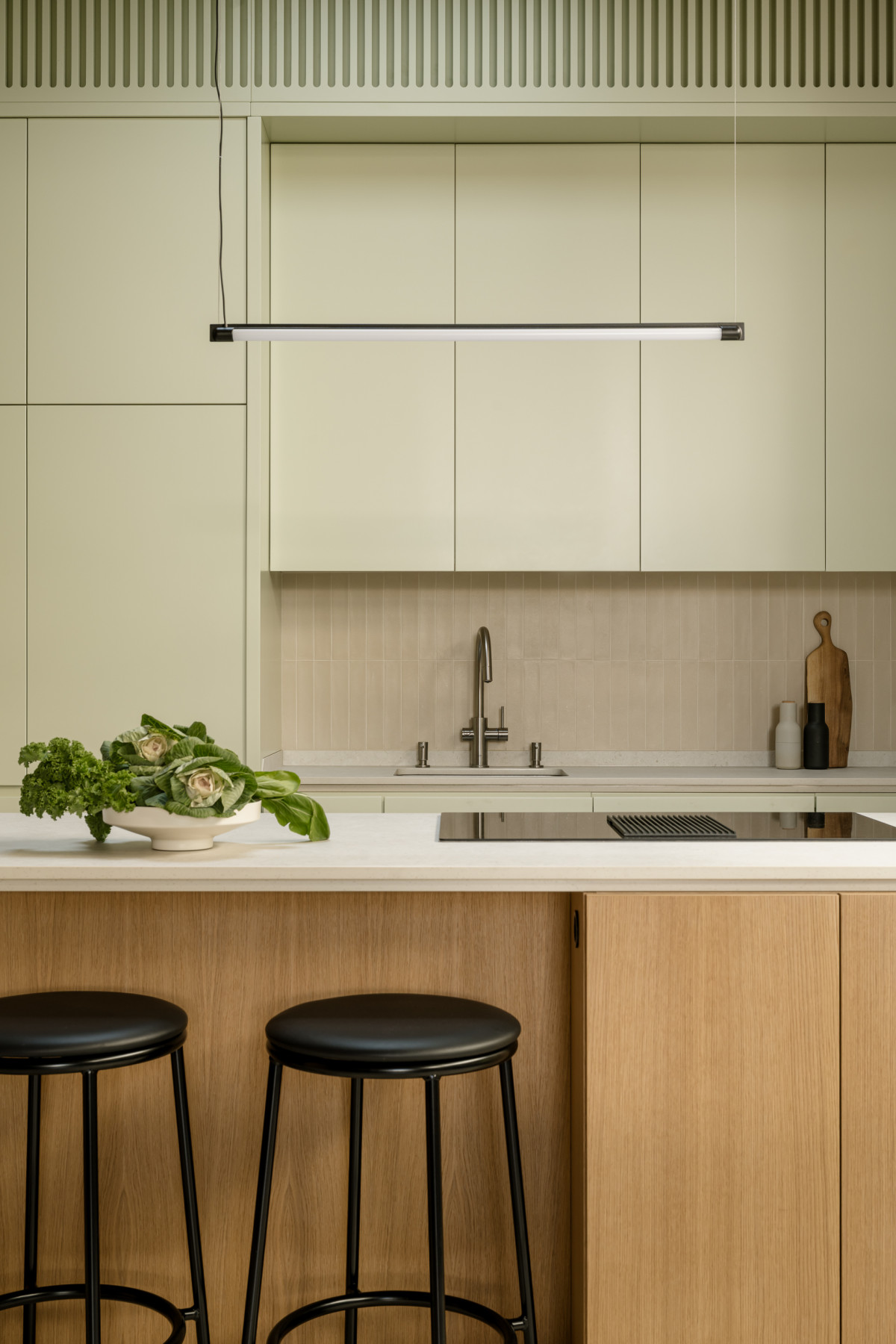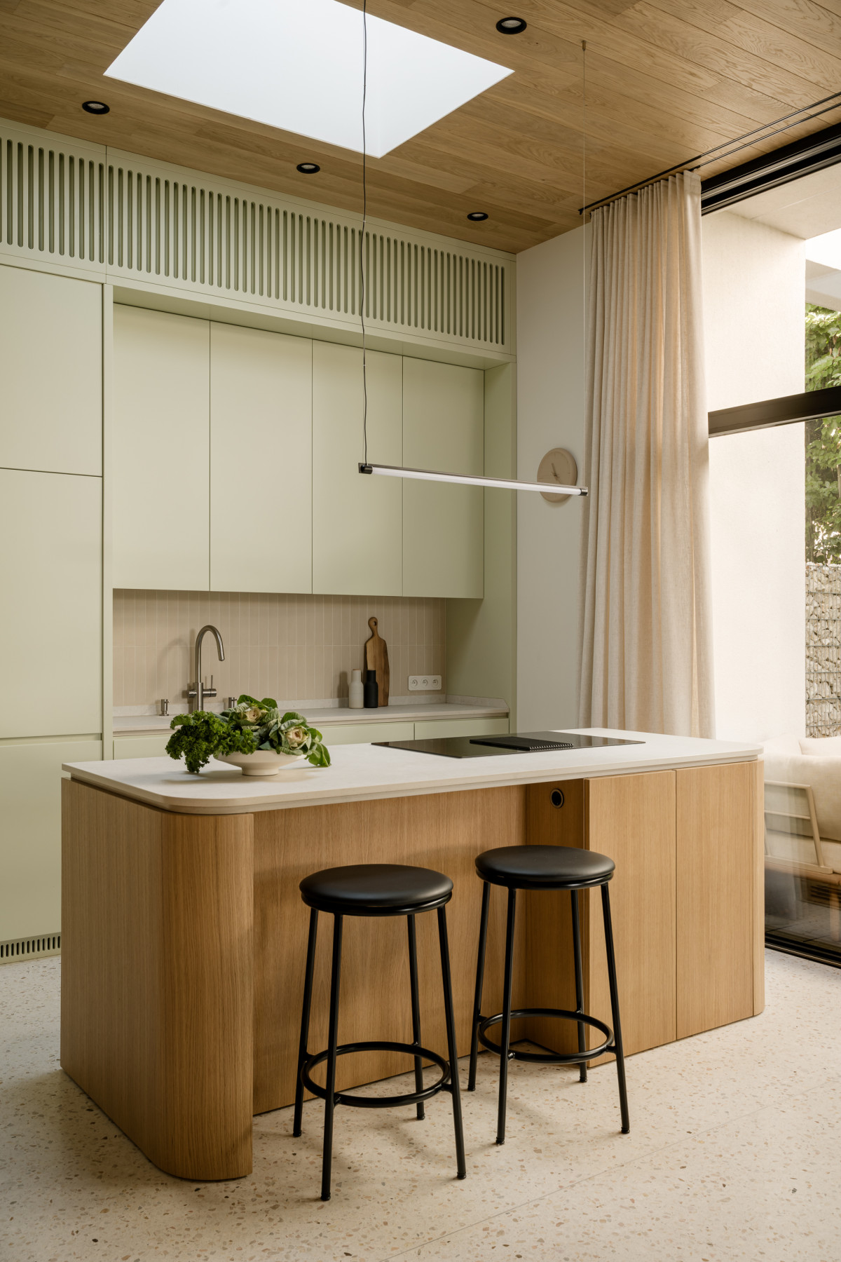 Część dzienna składa się z salonu, kuchni i jadalni, które wzajemnie się przenikają. W kuchni uwagę zwraca zabudowa z gładkimi frontami w delikatnym szałwiowym odcieniu oraz duża, zaokrąglona wyspa. Jej fronty wykonano z bielonego forniru dębowego, a blat w satynowym wykończeniu odbija światło, ale nie błyszczy – projektantka celowo starała się uniknąć połysku, by zachować spokój i miękkość aranżacji.