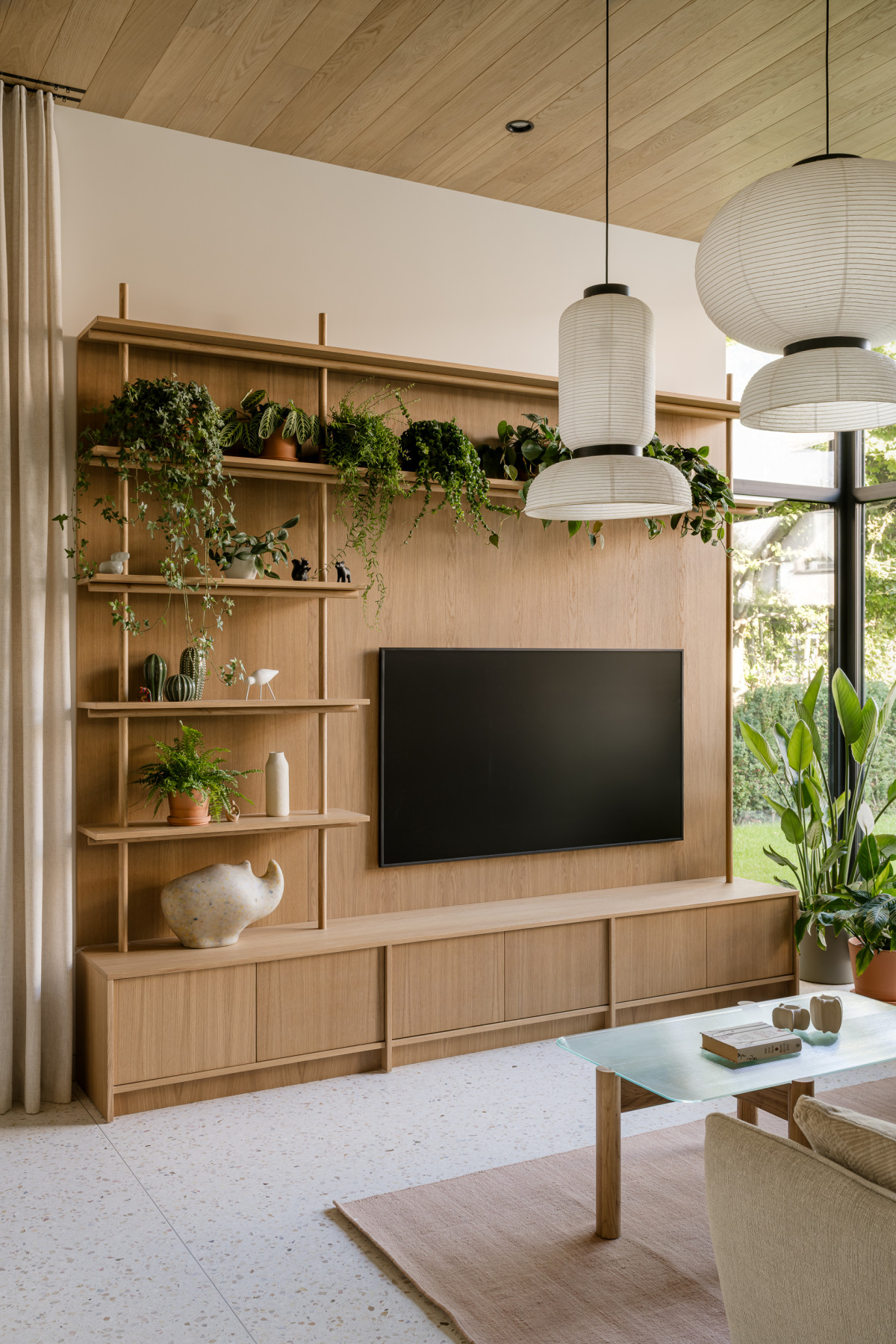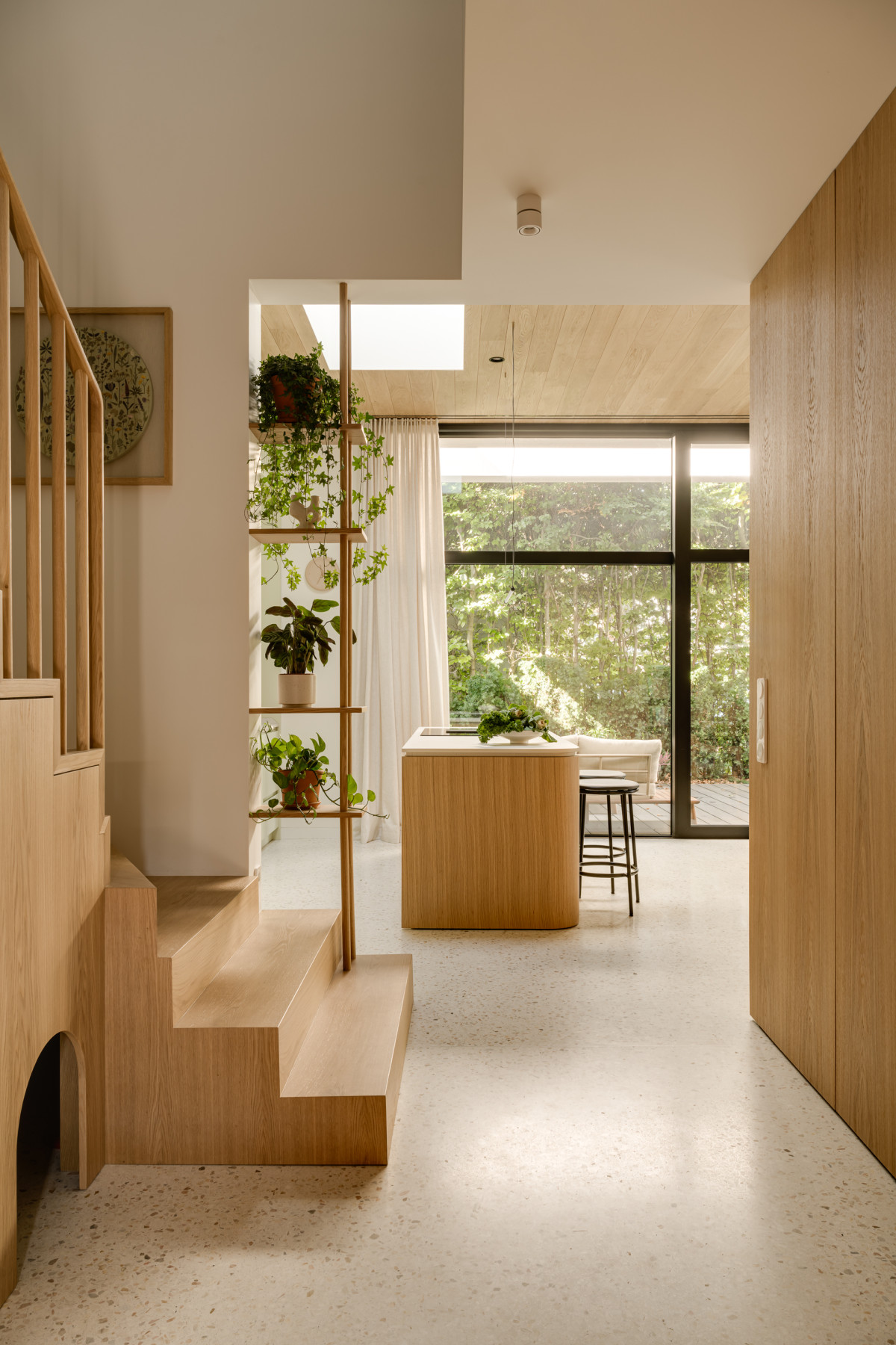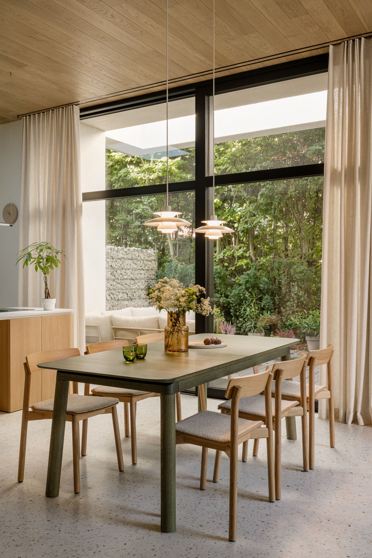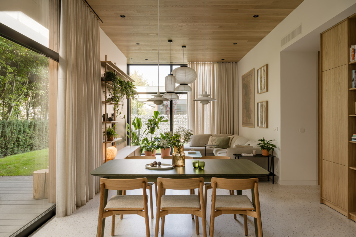 Duże przeszklenia na parterze otwierają wnętrze na zieleń. Dom zwrócony jest w kierunku północno-zachodnim, dlatego by uniknąć zbyt ciemnej kuchni, w trakcie prac budowlanych zamontowano świetlik dachowy. Właścicielom zależało na trwałej i jednocześnie funkcjonalnej posadzce na parterze, dlatego projektantka zdecydowała się zastosować lastryko. Dodatkowo pozwoliło ono zachować ciągłość wizualną całego parteru i zatrzeć granice między poszczególnymi strefami. Jako przeciwwagę do lastryko, nad strefą dzienną pojawił się drewniany sufit wykonany z fornirowanych desek, który płynnie łączy się z wysokimi oknami. We wnętrzu dominują neutralne kolory, przełamane różnymi odcieniami zieleni oraz akcentami w kolorze terakoty.