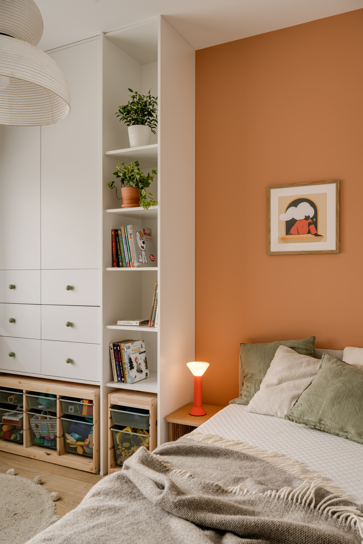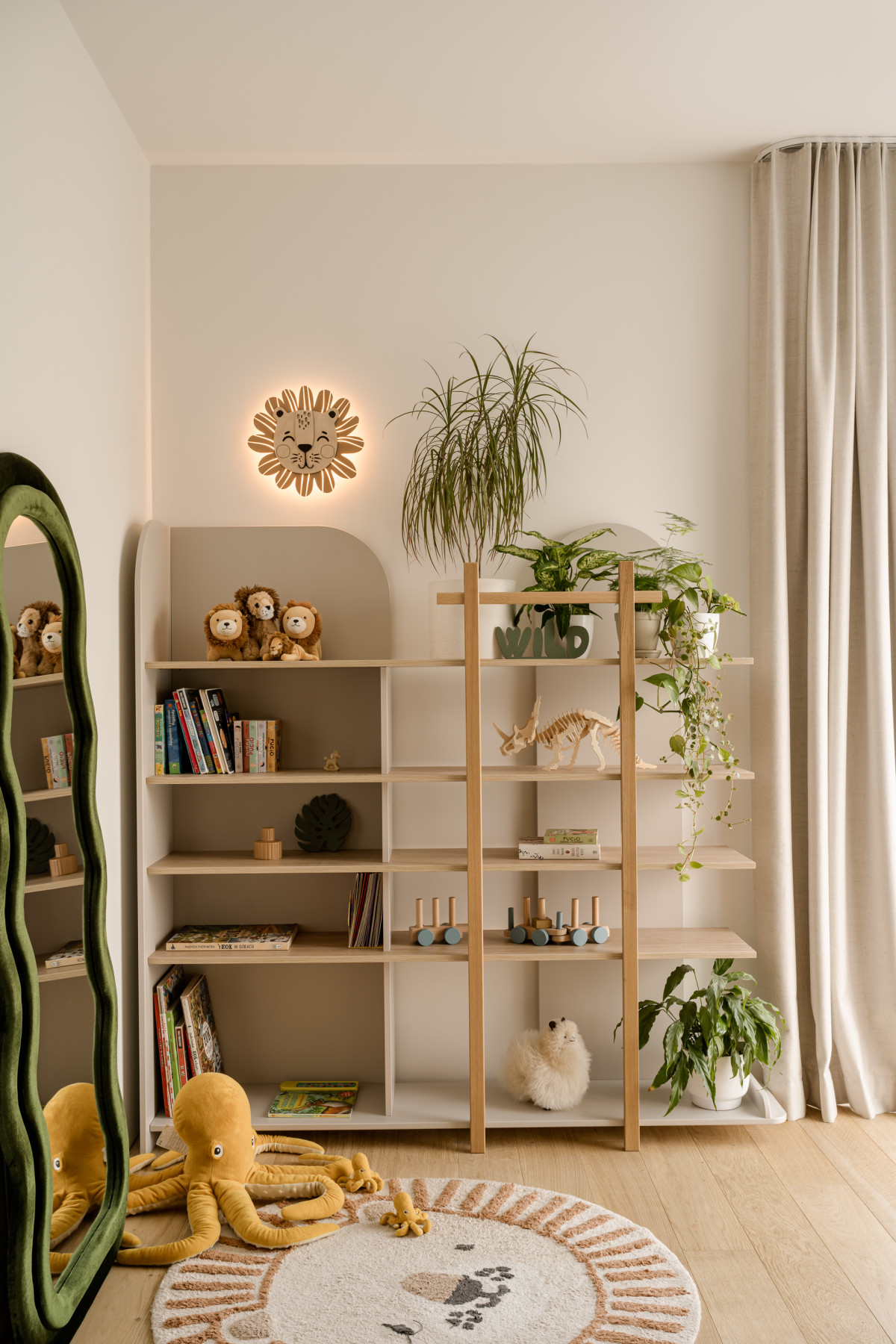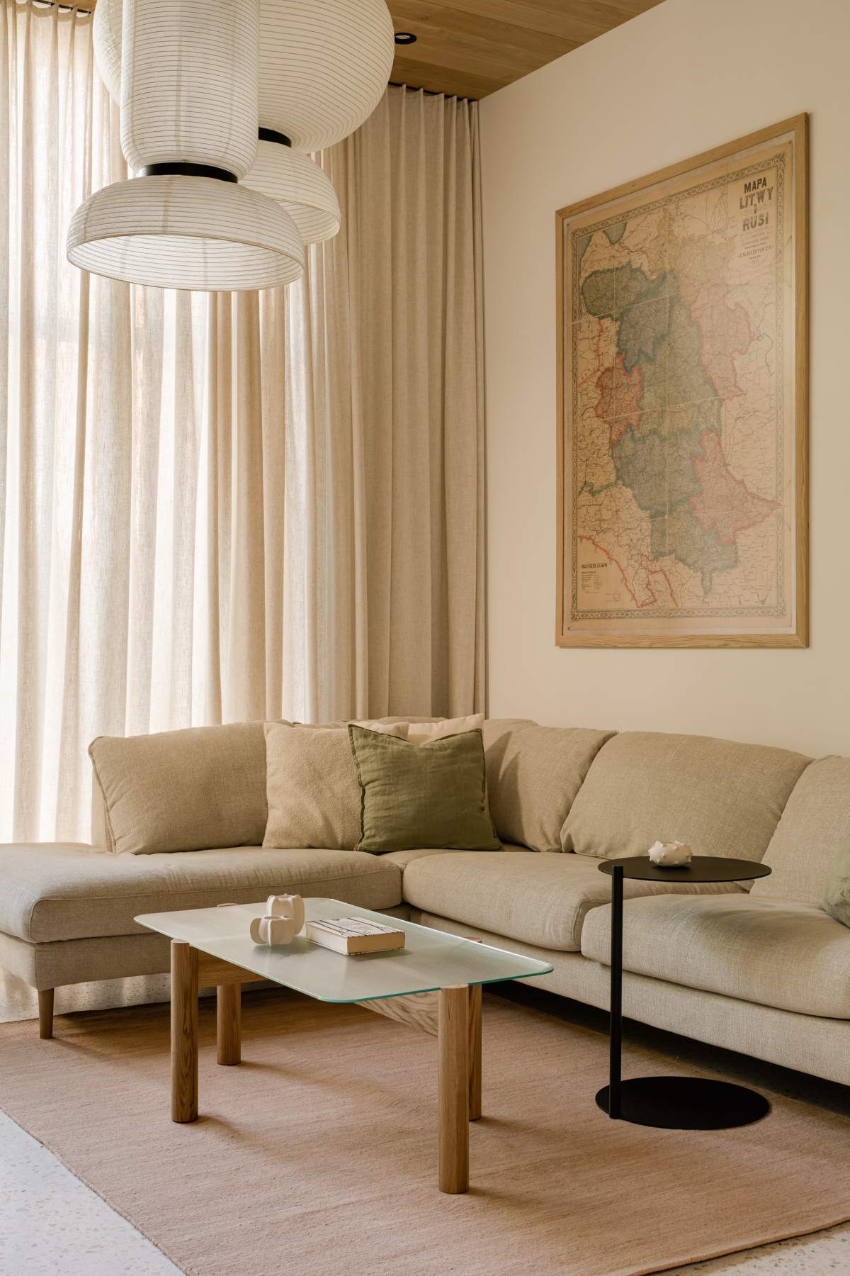 Na ścianie nad kanapą zawisła stara mapa w drewnianych ramach, którą właścicielka domu odziedziczyła po swoim pradziadku. Obok niej swoje miejsce znalazły prace krakowskiej artystki z suszonych polnych kwiatów, które również w swoisty sposób nawiązują do natury. Naprzeciwko kanapy stanął regał zaprojektowany przez Monikę Bryniarską, który wypełnił się roślinami doniczkowymi i pamiątkami. Regał swoją lekką formą nawiązuje do ażurowych półek oddzielających strefę wejściową od strefy dziennej.