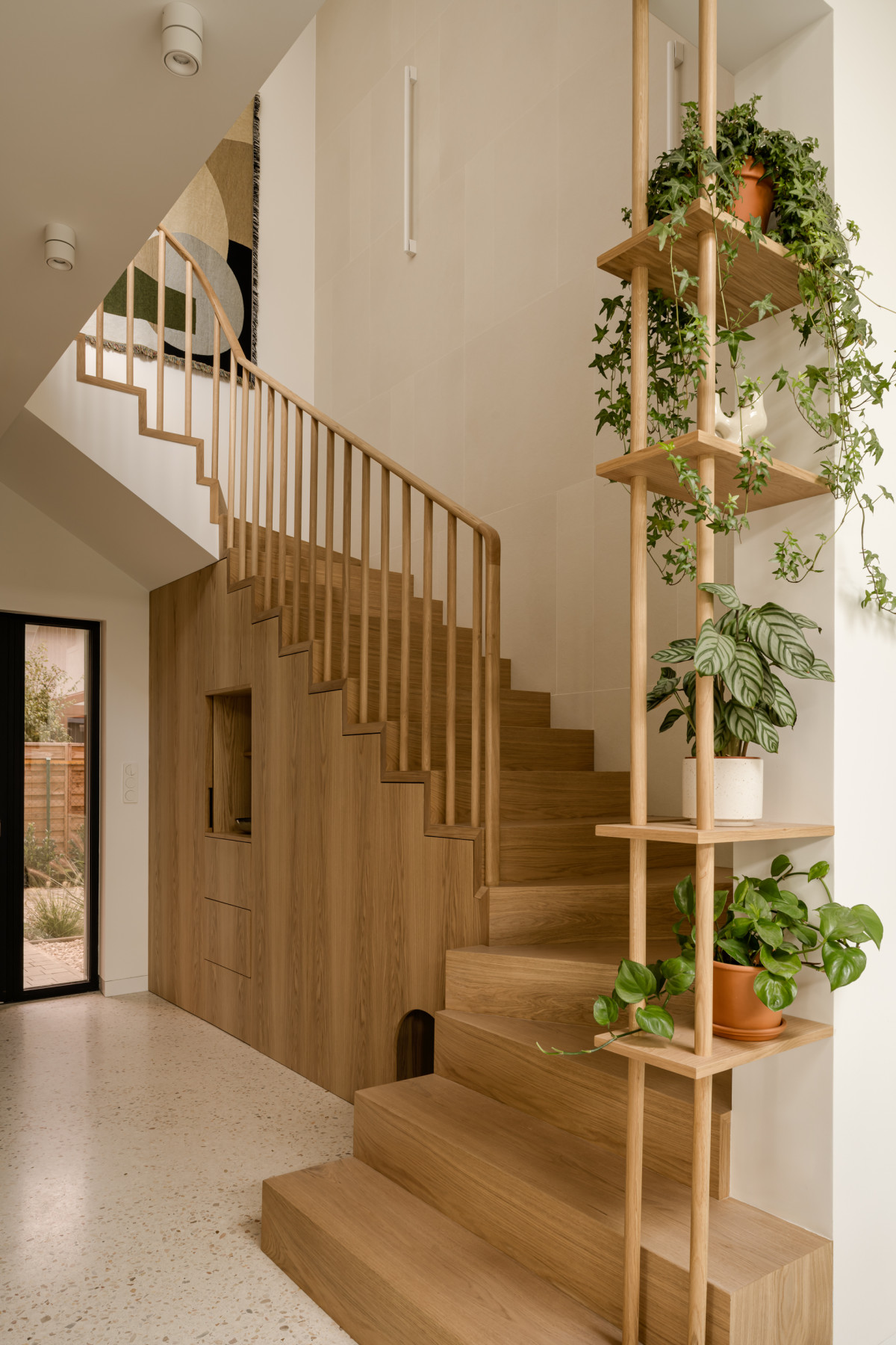 Strefa wejściowa została zaprojektowana jako naturalne przedłużenie części dziennej. Klatka schodowa stanowi główny element kompozycji a funkcjonalna zabudowa pod schodami skrywa garderobę, różne schowki i wygodne miejsce dla pieska przypominające budę.