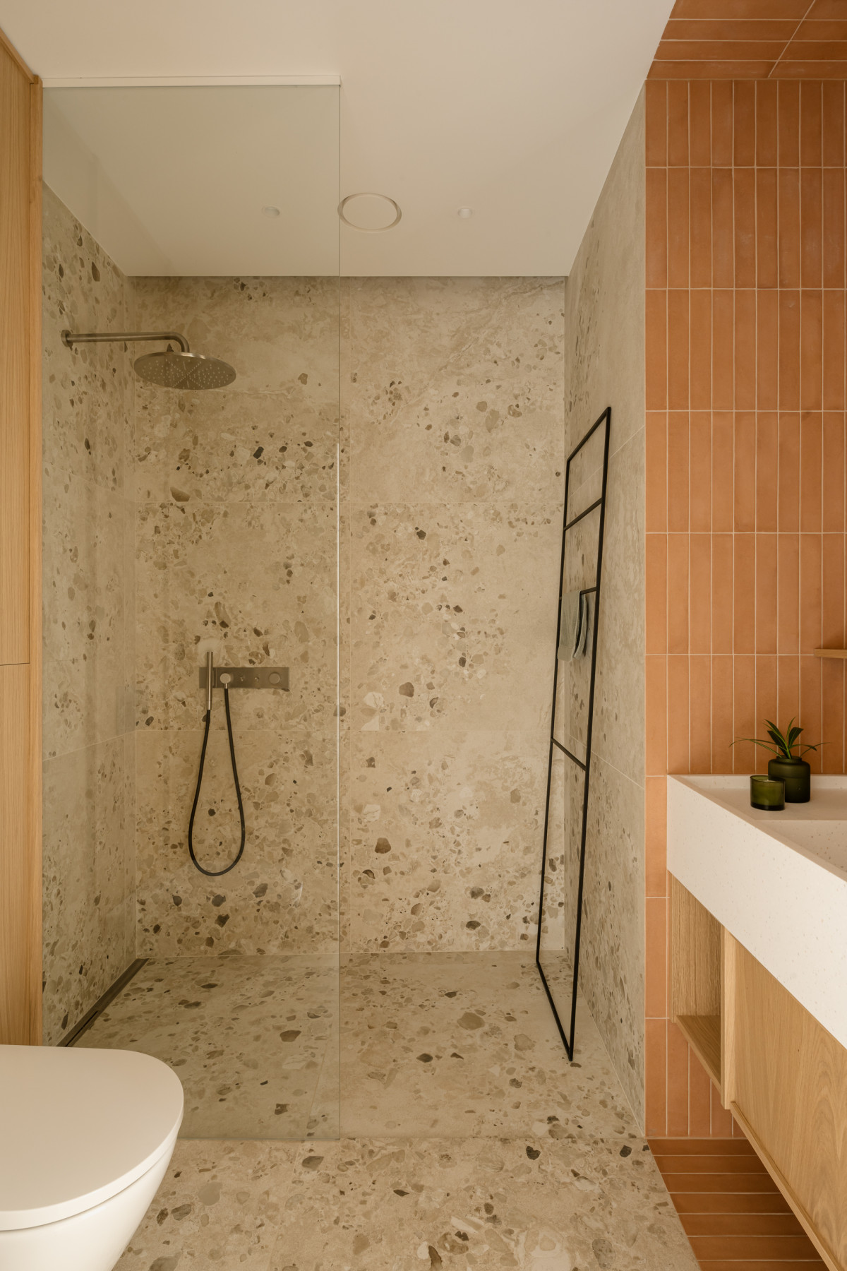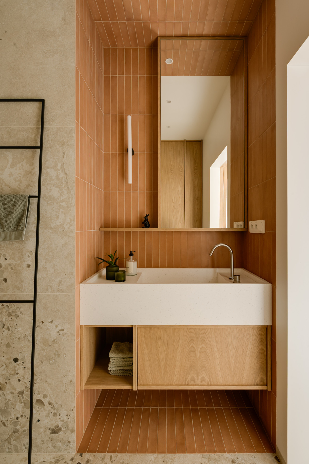 Łazienka dla gości na parterze utrzymana jest w ciepłej i delikatnej kolorystyce. Strefę z umywalką zaprojektowano jako wyrazisty akcent wnętrza. Ściana i sufit pokryte terakotowymi płytkami tworzą płynnie przejście, które podkreśla geometrię wnęki i buduje wrażenie głębi. Umywalka z jasnego, nakrapianego kompozytu nawiązuje kolorystycznie do materiałów zastosowanych w domu, będąc równocześnie delikatnym tłem dla minimalistycznej baterii.