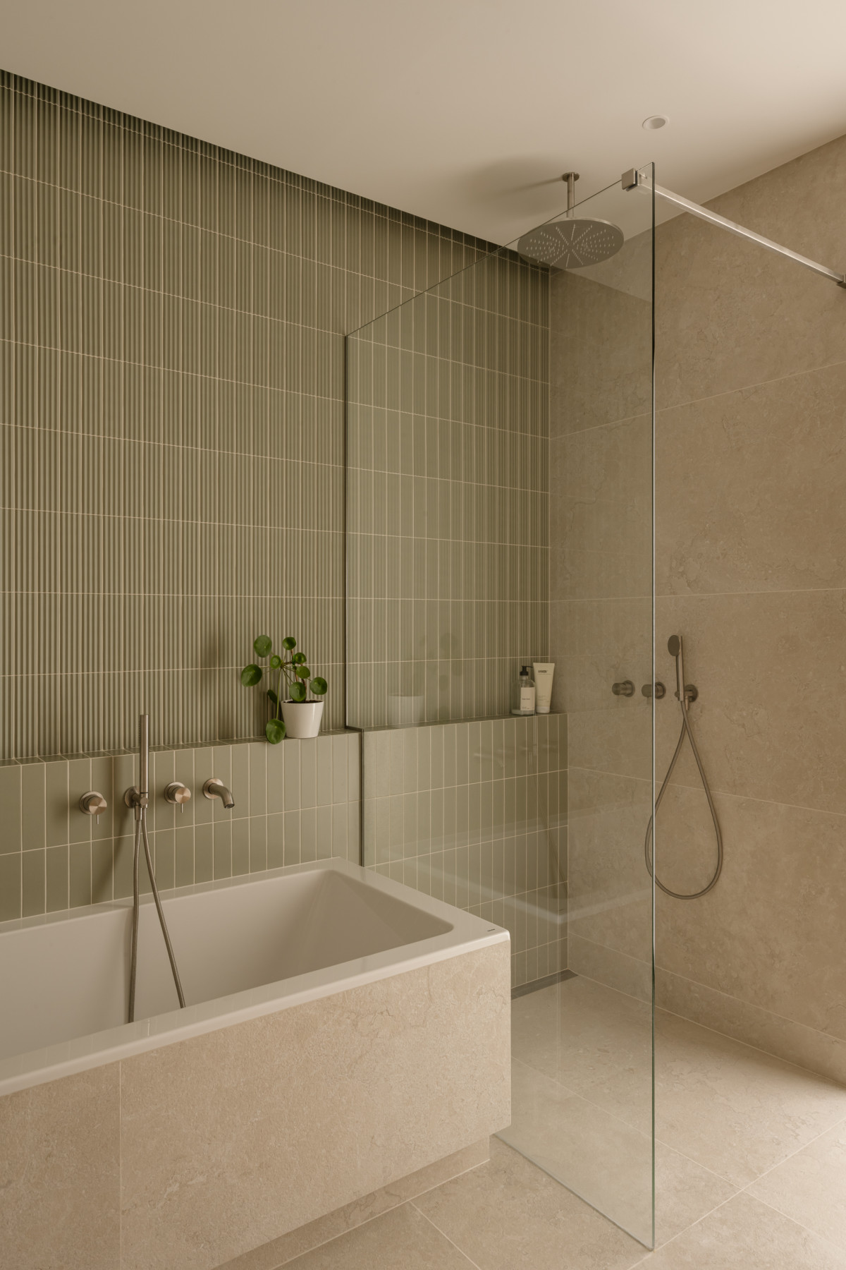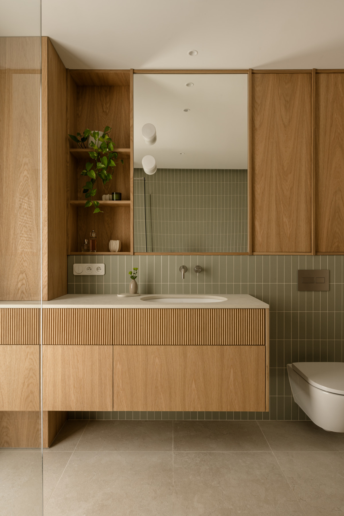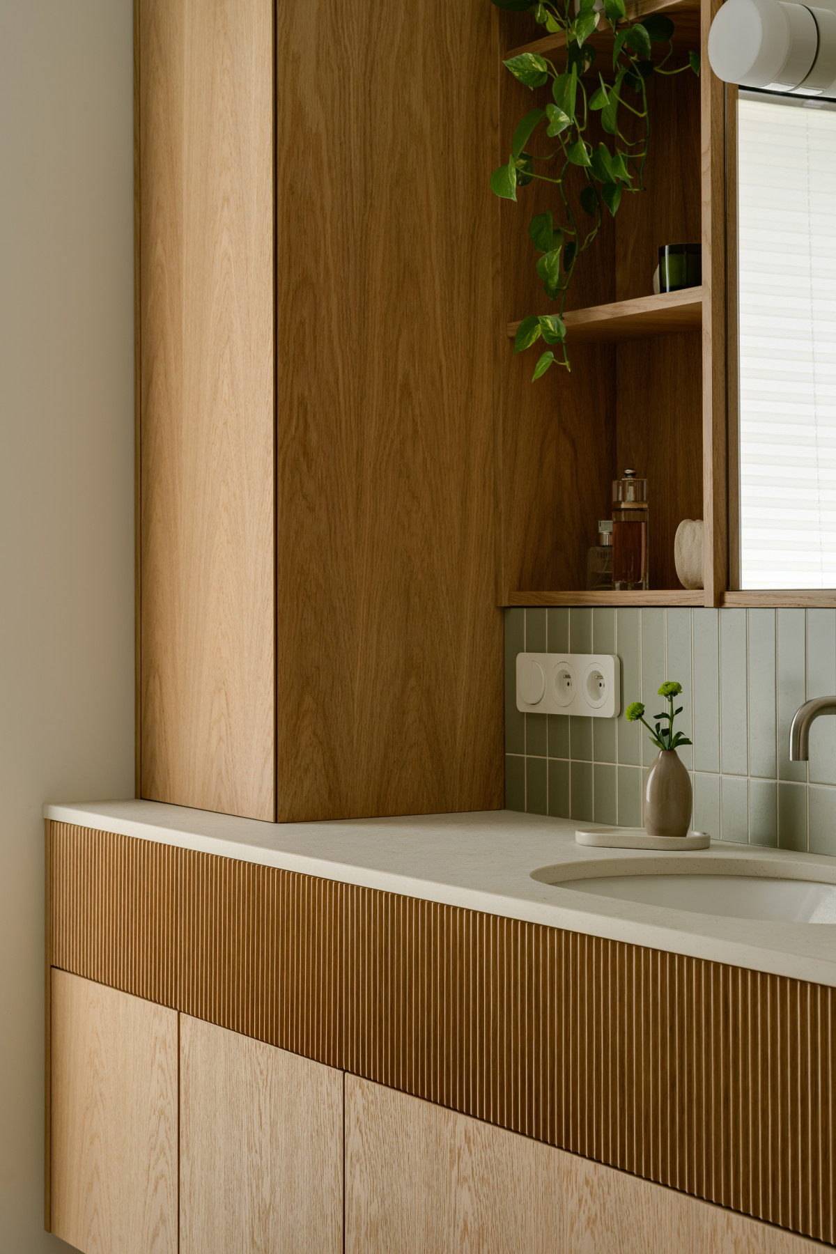 Łazienka na piętrze stanowi konsekwentne rozwinięcie stylistyki całego domu – modernistycznej, ale ciepłej w wyrazie. Drewniana zabudowa z pionowymi elementami frontów wprowadza rytm i fakturę. Motyw z trójwymiarowych płytek nad wanną został subtelnie przeniesiony na ryflowane, drewniane fronty szuflad. Całość została dopełniona delikatną armaturą w kolorze stali szczotkowanej.
