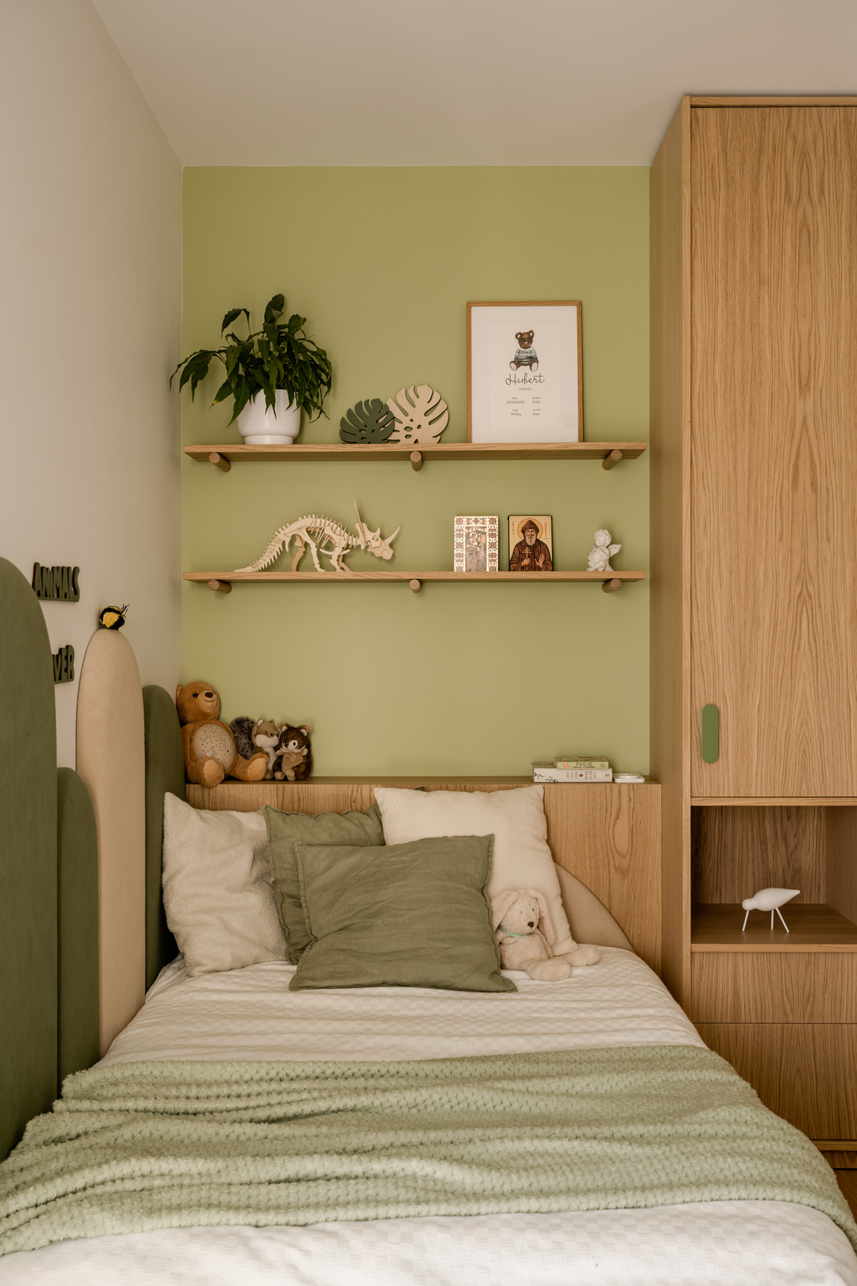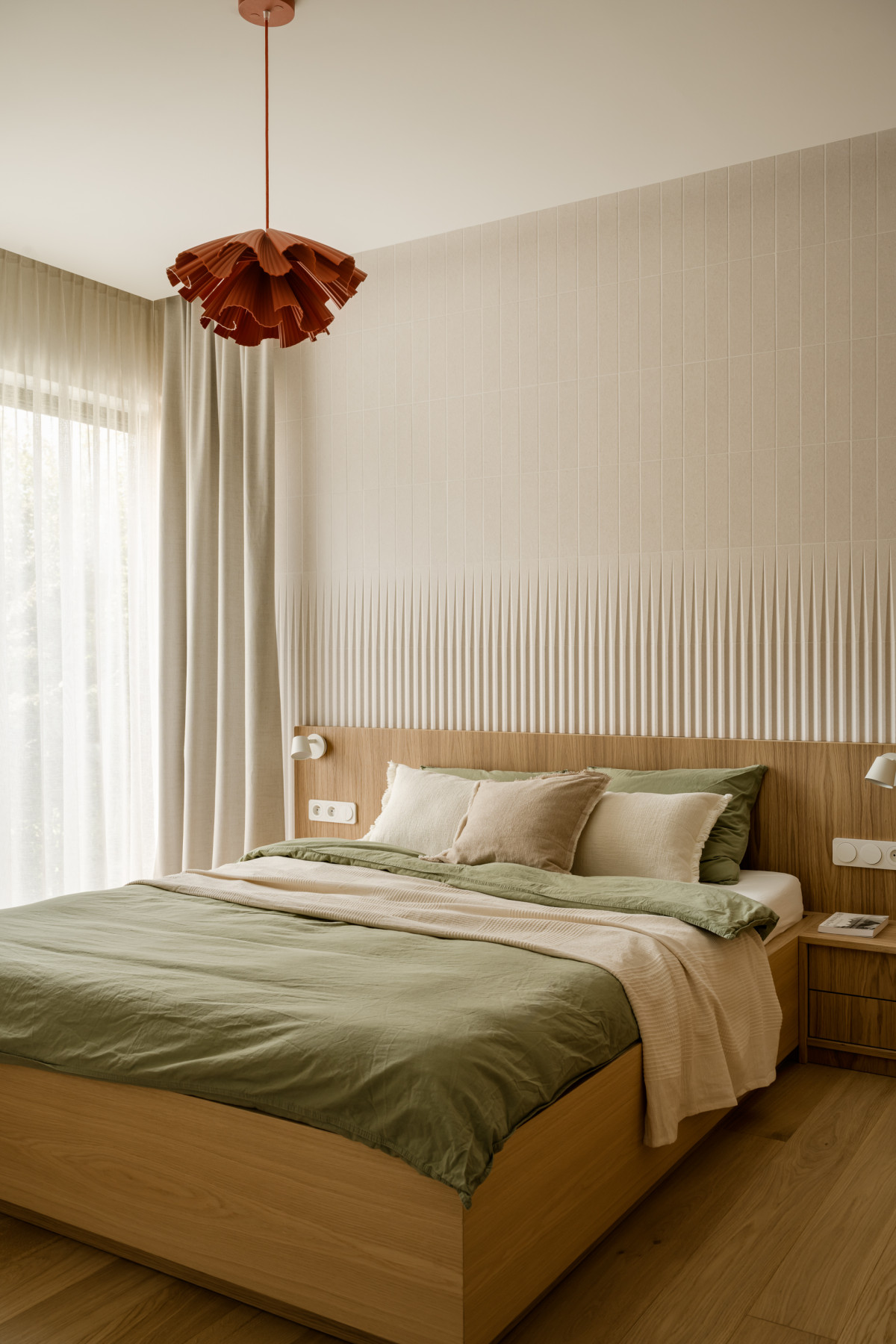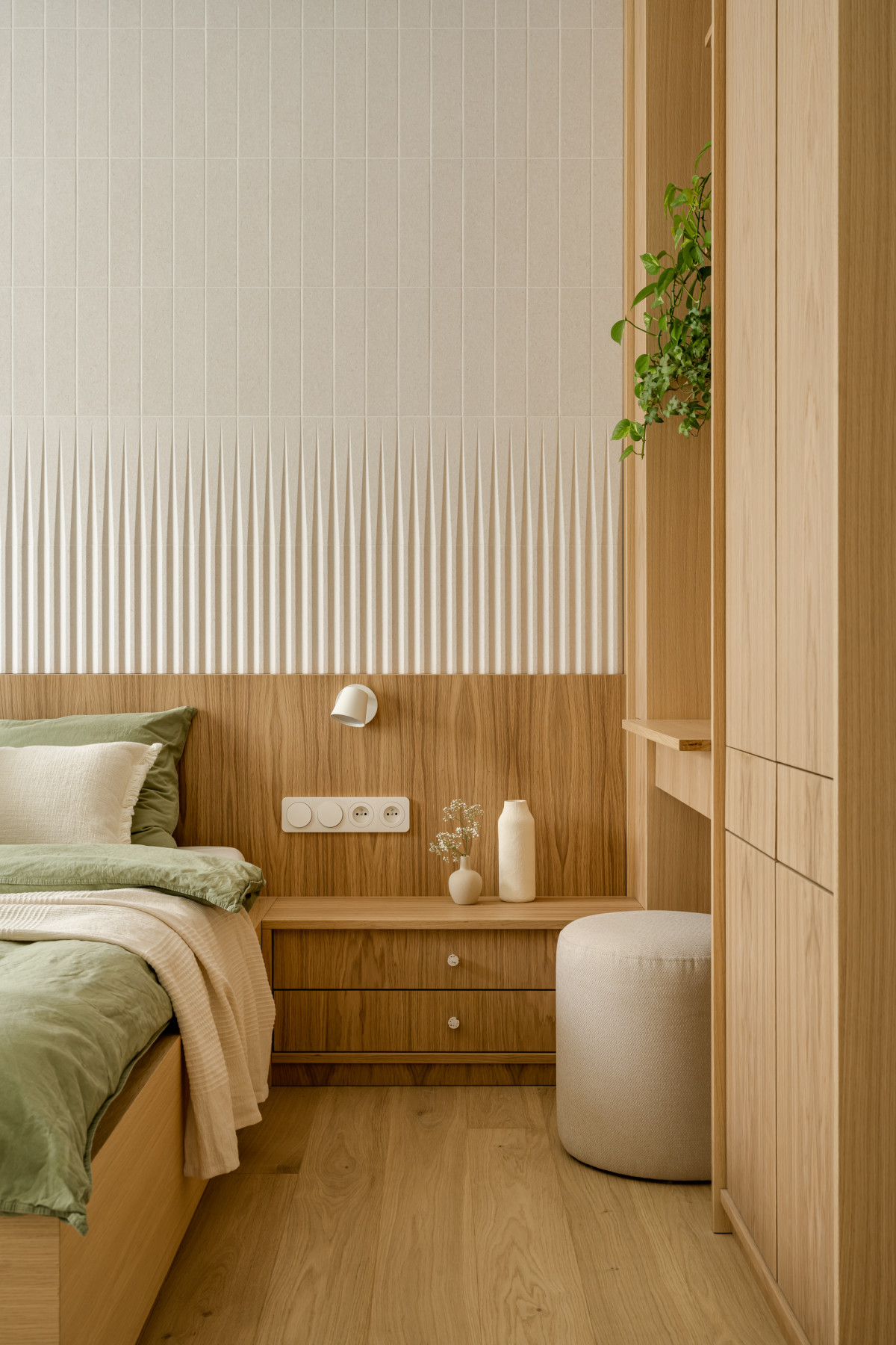 Na piętrze urządzono strefę prywatną z sypialniami, garderobą, dużą łazienką i pokojem dziecięcym. W sypialni głównej nad łóżkiem Monika Bryniarska zaprojektowała geometryczną kompozycję z płytek. Światło boczne, wpadające przez duże okno wydobywa ich trójwymiarową strukturę, tworząc ciekawą grę światłocieni. Ściana ta jest również kontrastem dla drewnianego wezgłowia łóżka i zabudowy. W sypialni nie zabrakło też roślin, których miłośniczką jest właścicielka domu.
