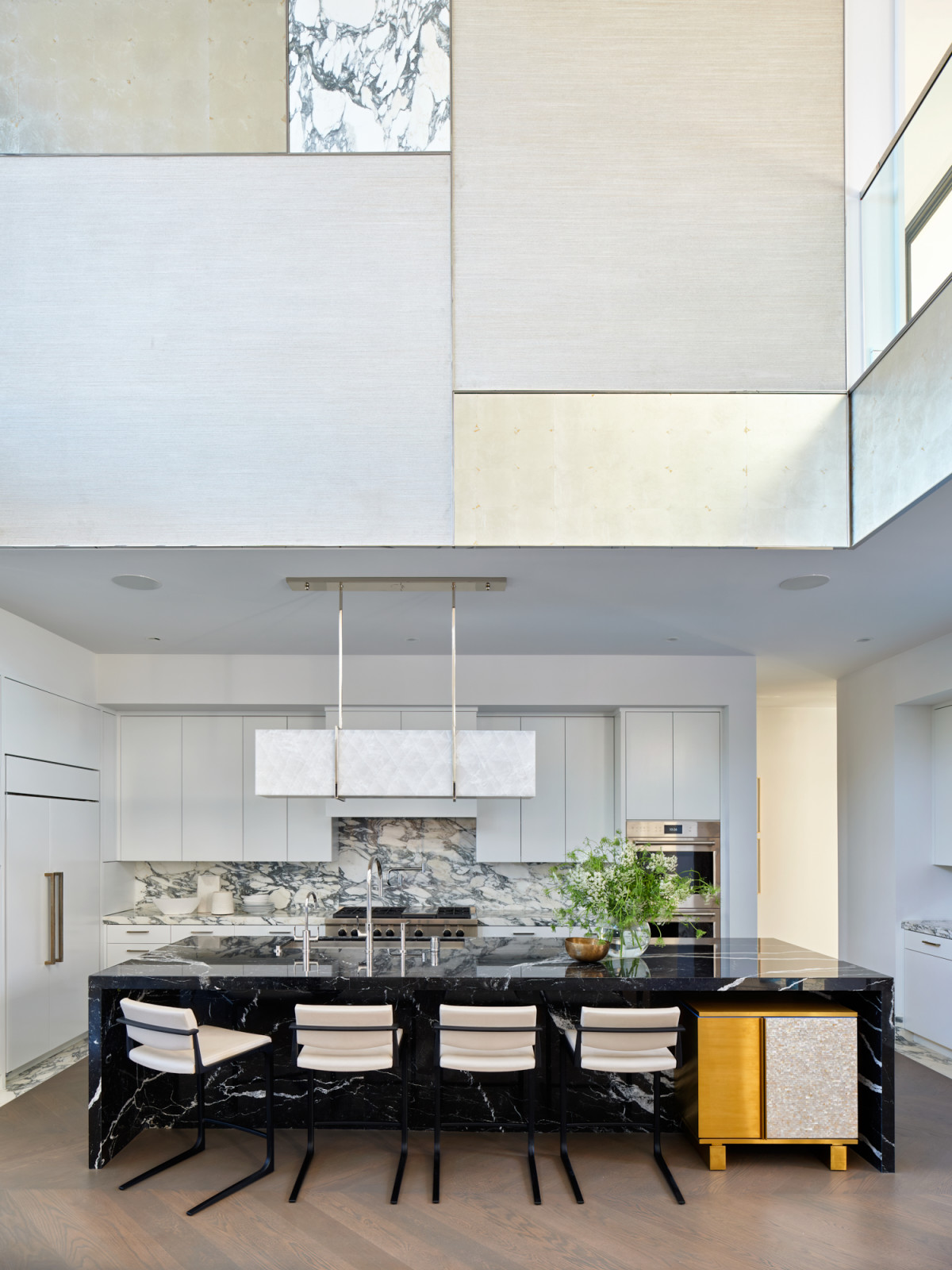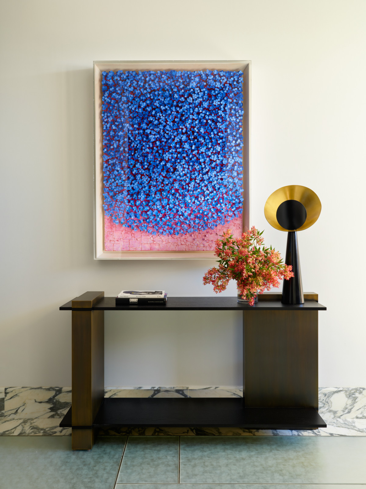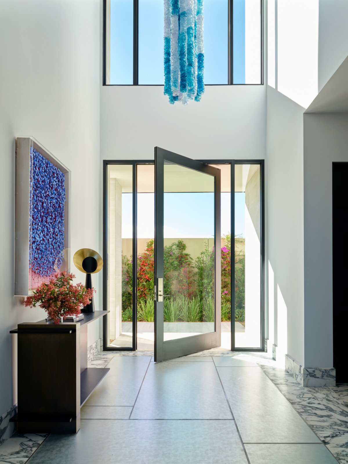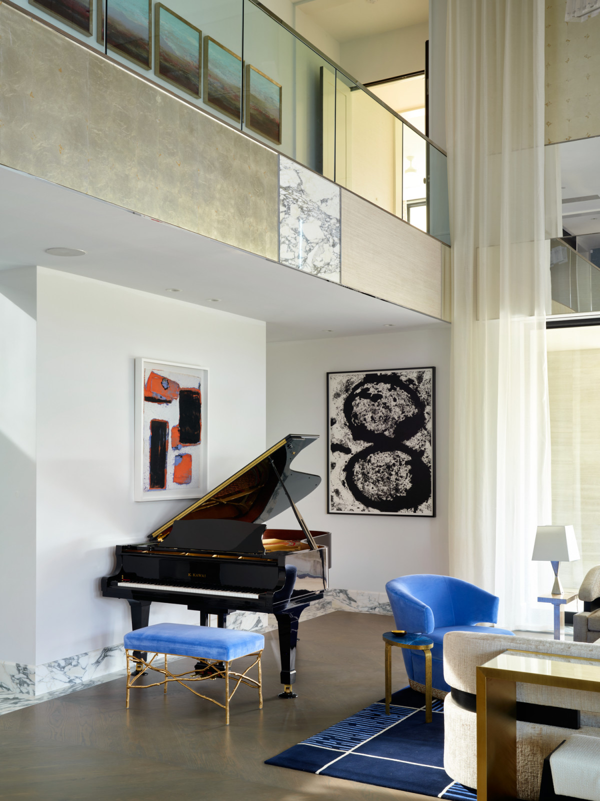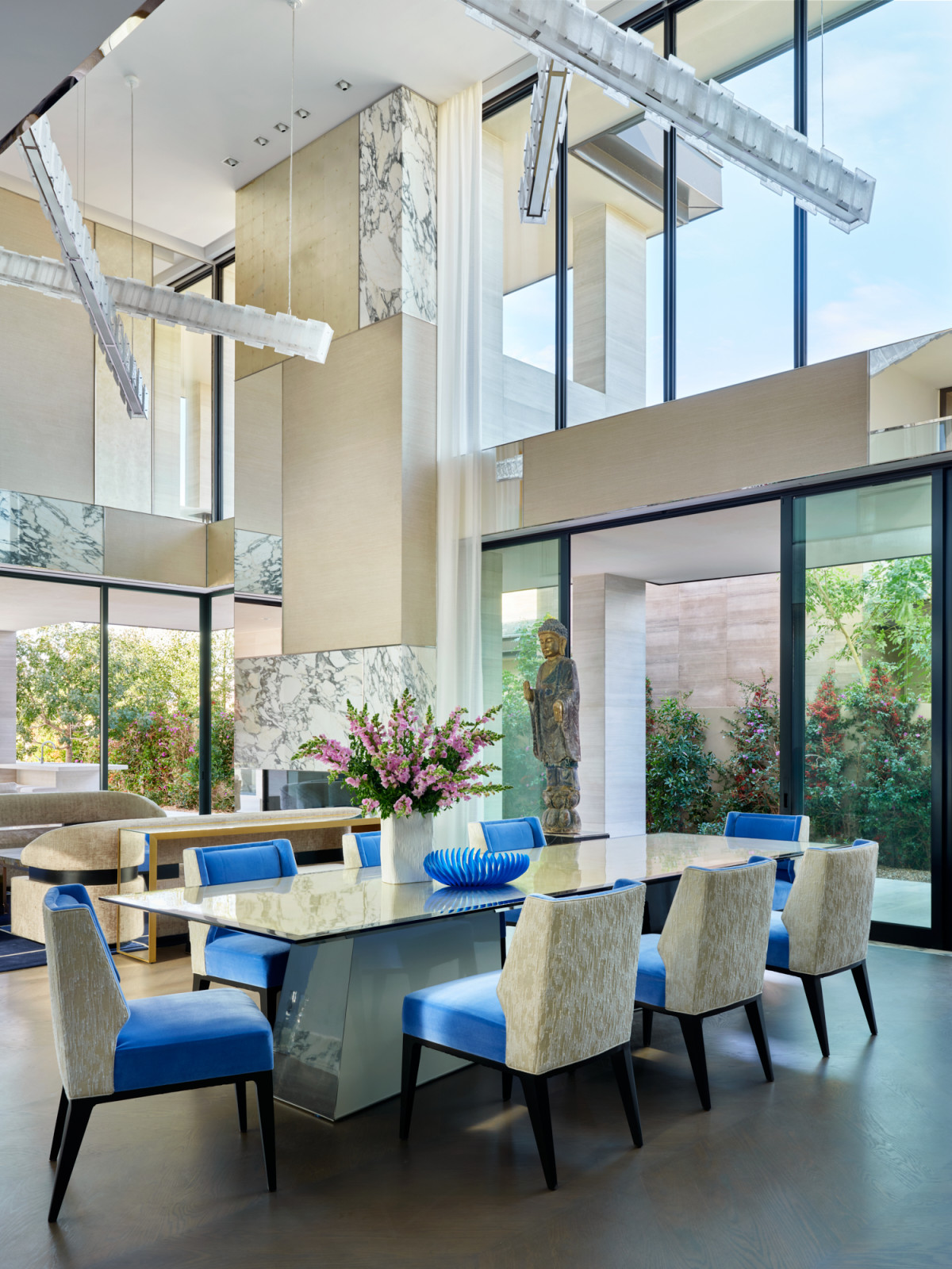 Wszystkie meble zaprojektowano na zamówienie, łącząc estetykę postmodernizmu z ekskluzywnymi materiałami. W różnych częściach domu wyeksponowano również dzieła sztuki z kolekcji właścicielki, jak na przykład witający gości w strefie wejściowej obraz „Blue Blossom with Pink” autorstwa współczesnego koreańskiego artystki Sung-Hee Cho.