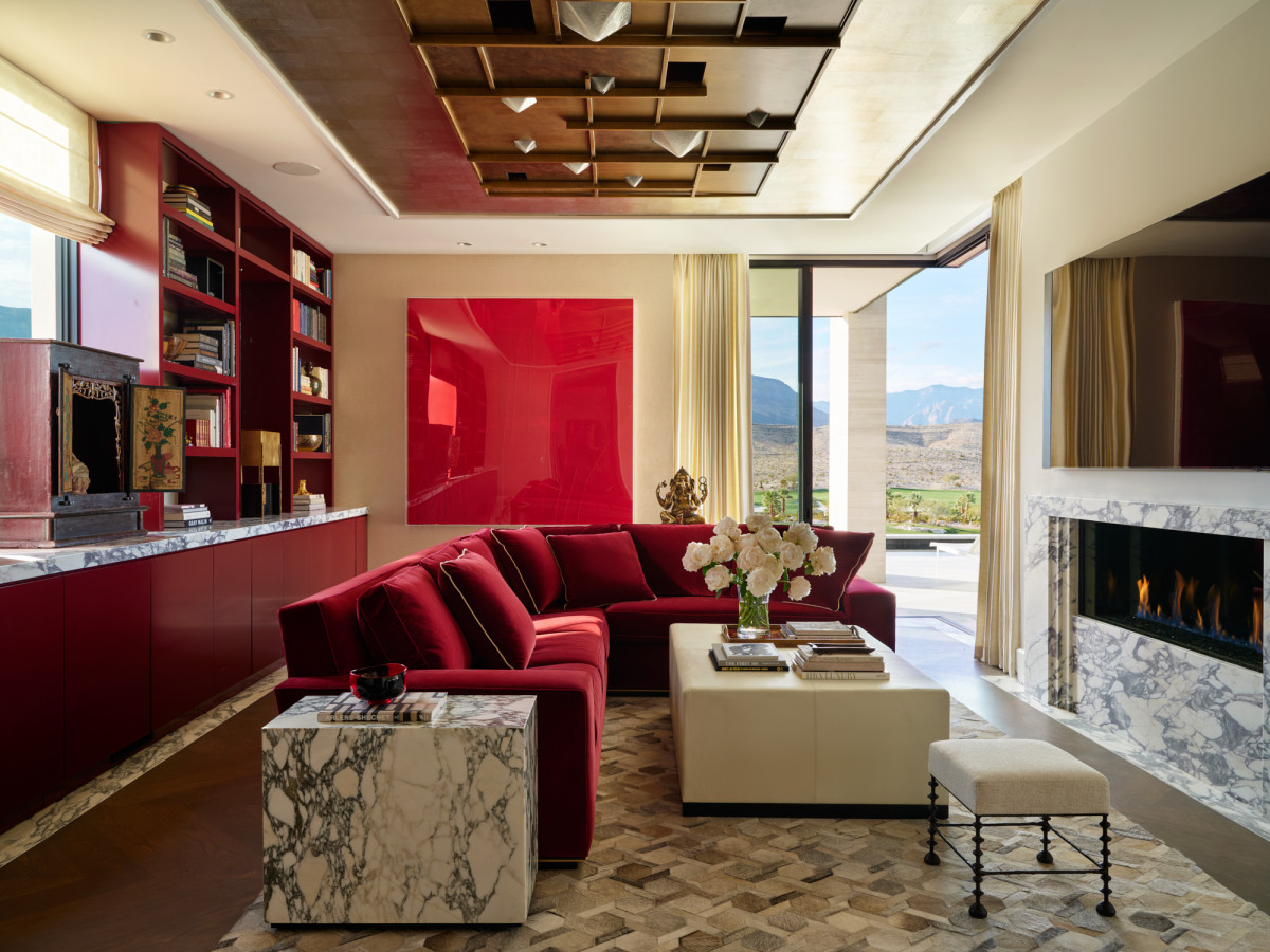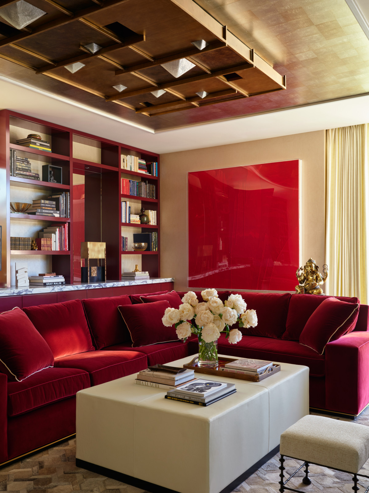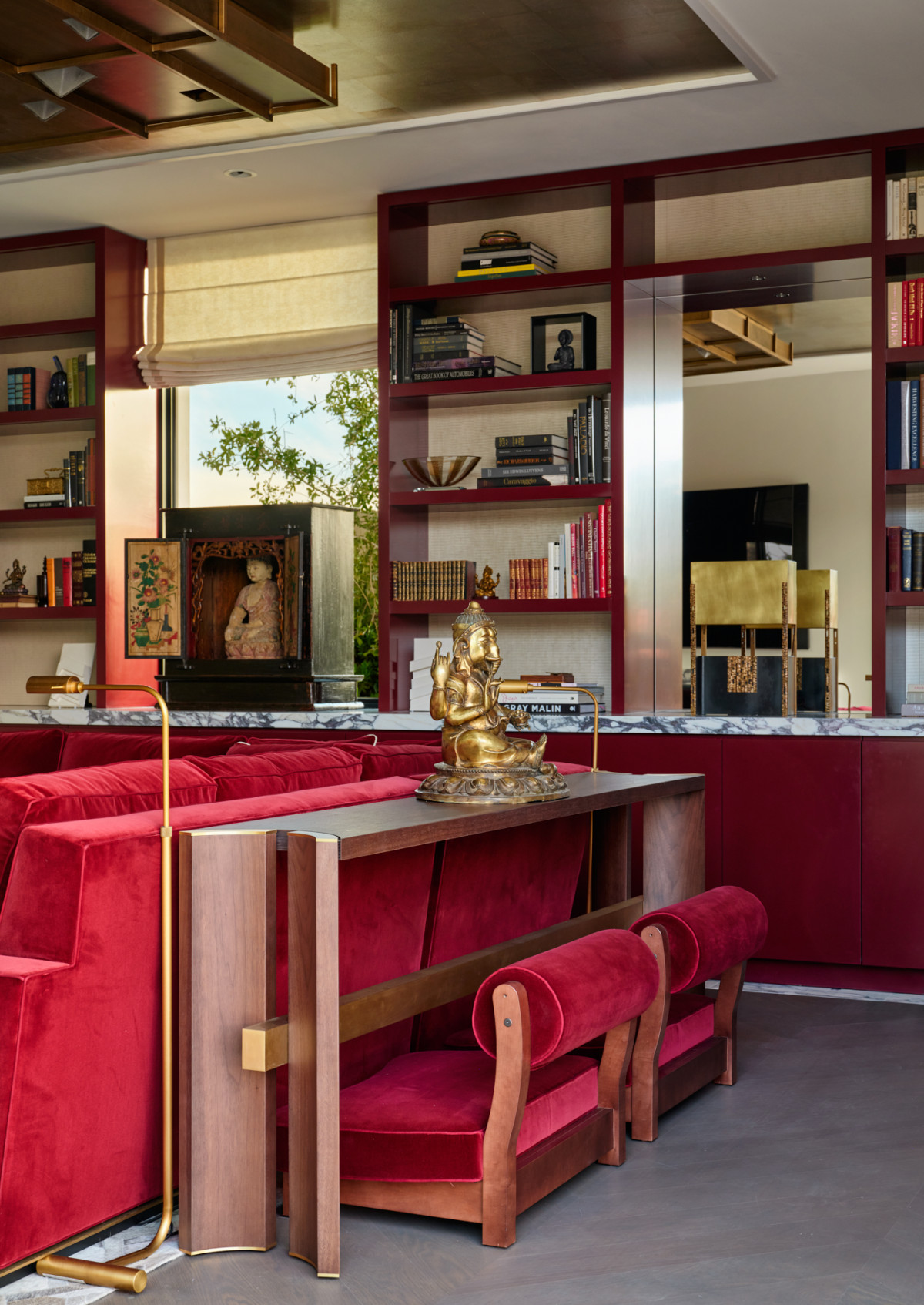 Biblioteka pełniąca również funkcję pokoju medytacyjnego utrzymana jest w głębokiej czerwieni, inspirowanej wiszącym tam obrazem wykonanym w całości z roztopionej szminki. Lampa sufitowa z pozłacanego brązu to nawiązanie do biżuterii brutalistycznej.