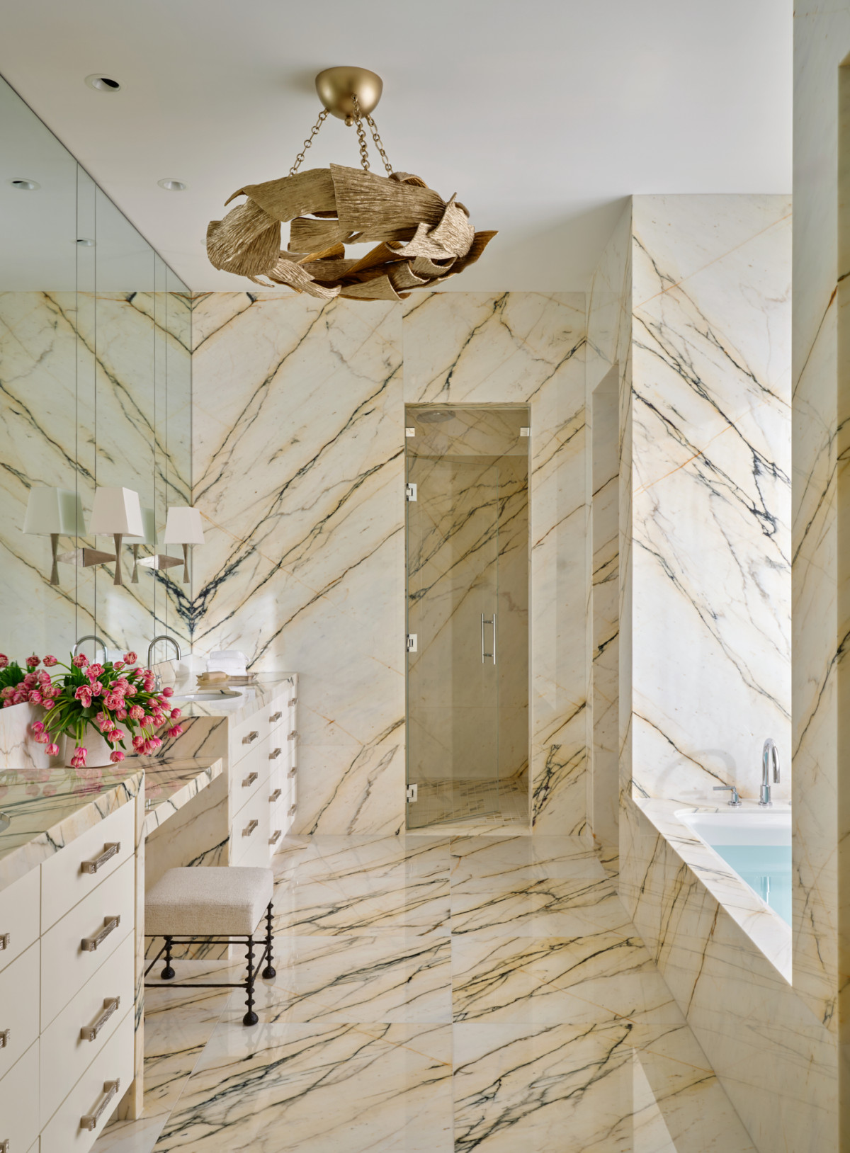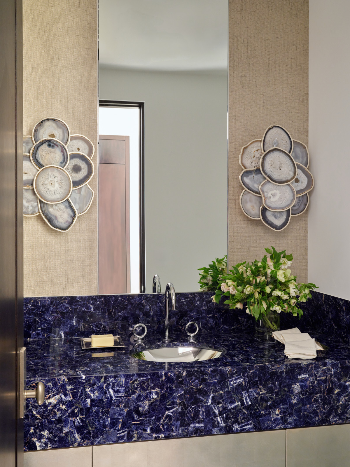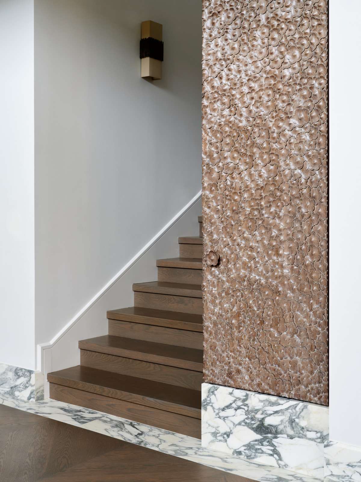 Projektant zadbał o obecność elementów, które z jednej strony są nietuzinkowe i ożywiają przestrzeń, ale jednocześnie nie przytłaczają wnętrz i nie są ostentacyjne. Ponieważ dom nie jest bardzo duży, skupiono się na dekoracyjnych elementach, które będą używane na co dzień. - Zleciliśmy wykonanie ręcznie rzeźbionej szafy z motywem kwiatowym, a także ściany w salonie inspirowanej twórczością Mondriana, łączącej marmur, lustro, srebrne złocenia, tkaninę ścienną i stal nierdzewną w formie kolażu – mówi Alex Woogmaster.