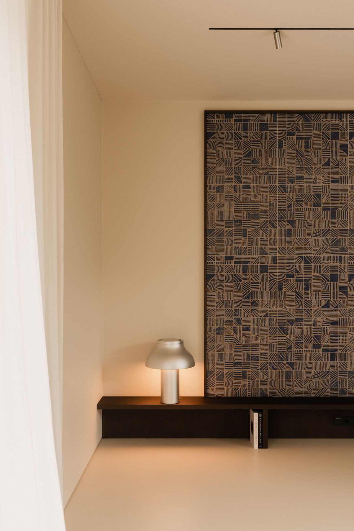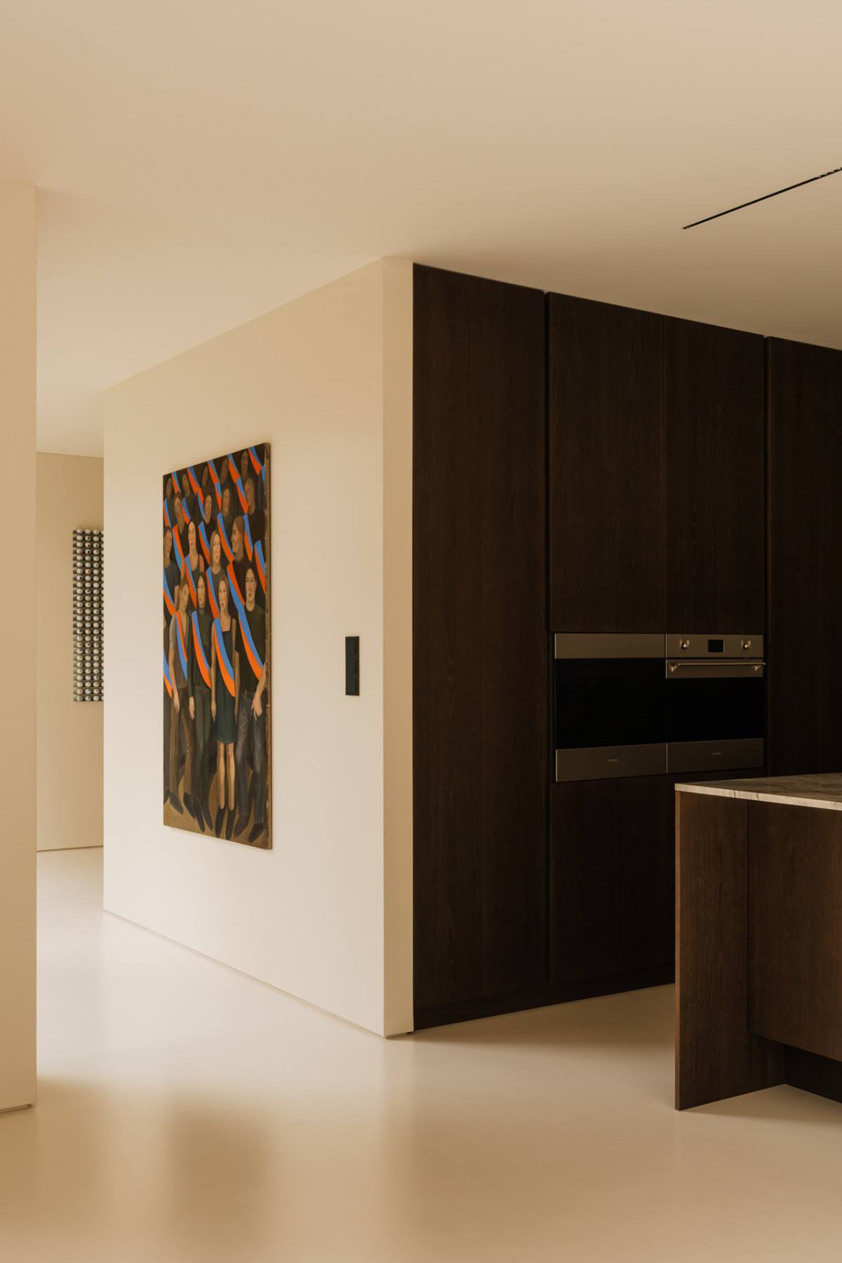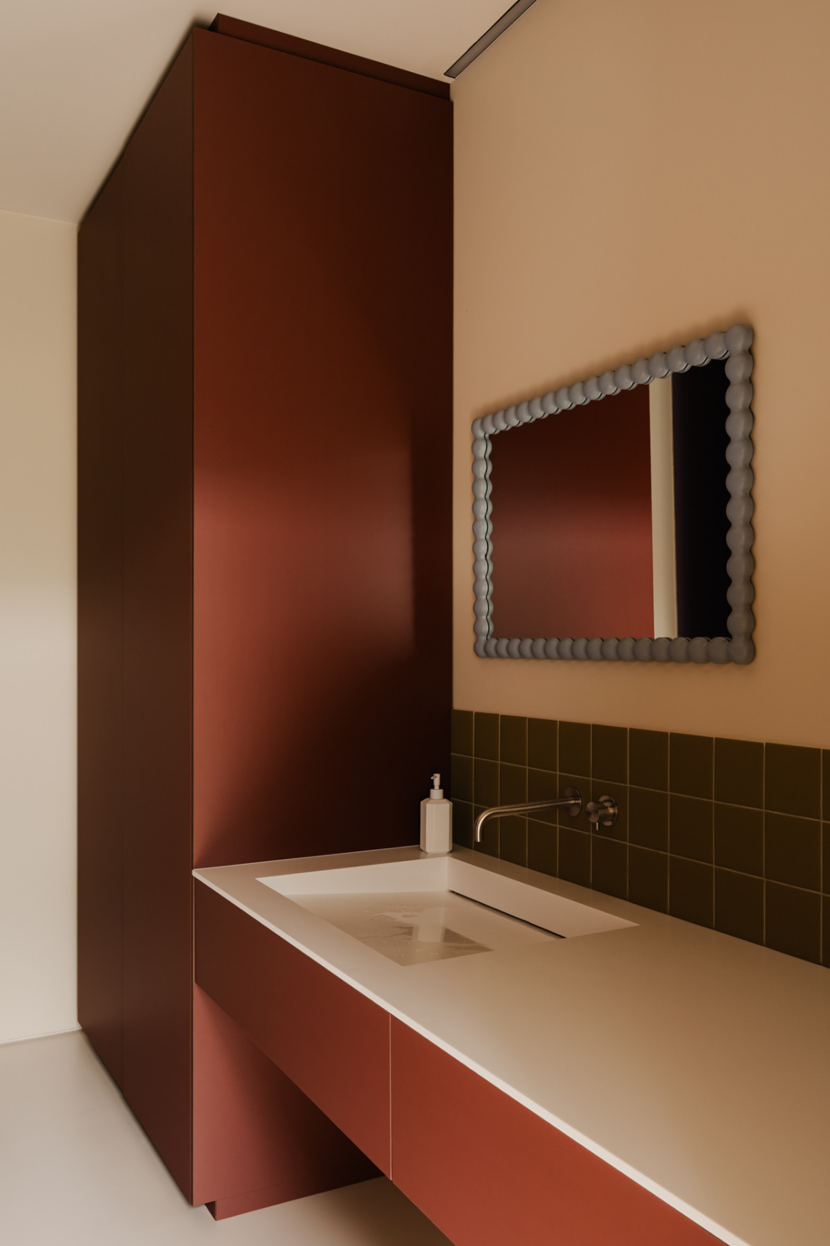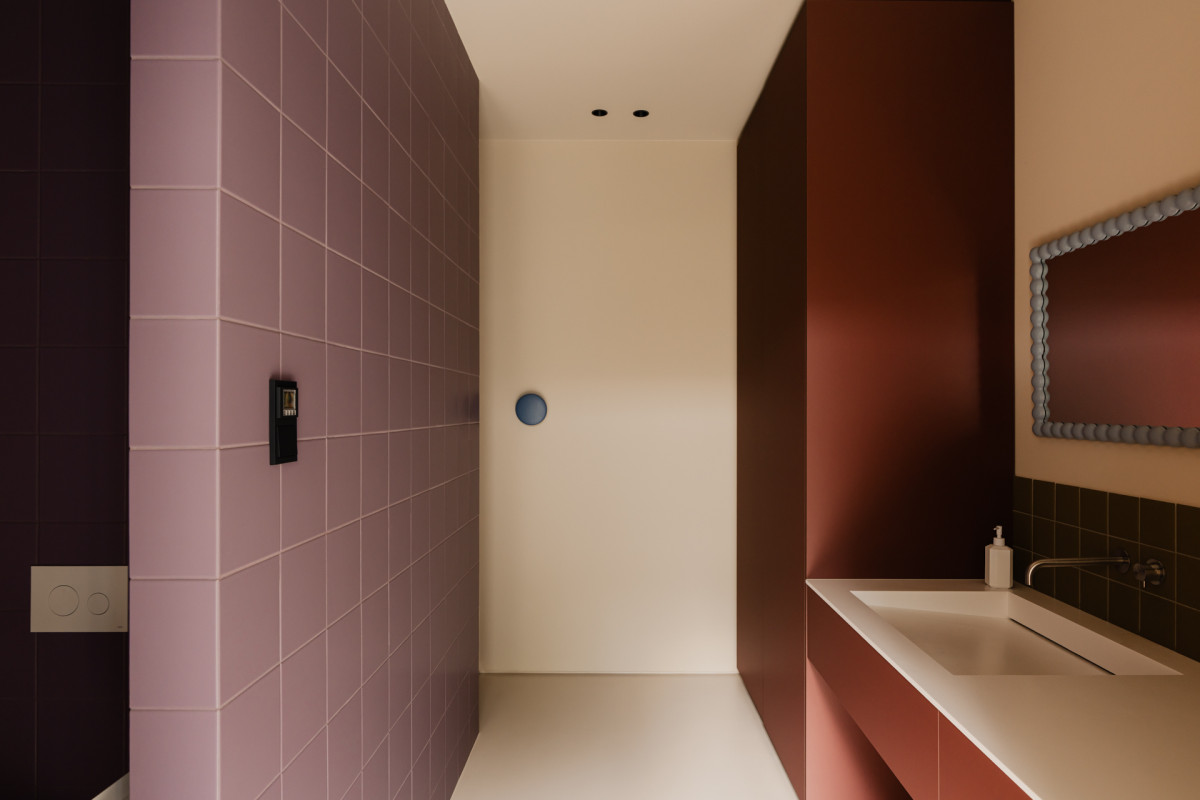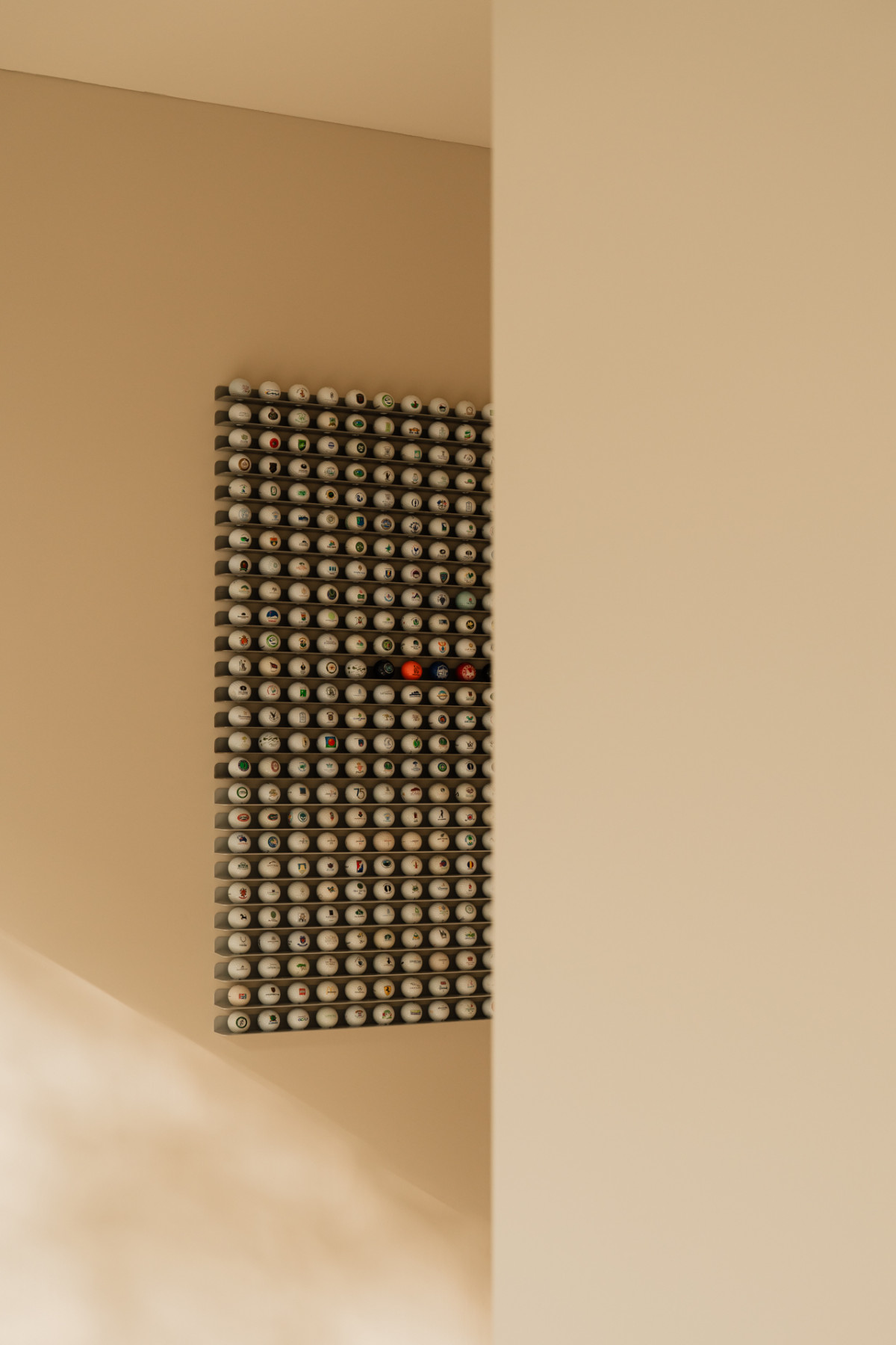 Stonowaną paletę kolorystyczną przełamują gdzieniegdzie dodatki i dzieła sztuki jak np. wielkoformatowa barwna praca Karoliny Żądło przy wejściu do strefy dziennej czy aranżacja z piłeczek golfowych w holu. Kolor pojawia się również w jednej z łazienek, gdzie architekt zastosował lawendowe płytki ścienne i zabudowę w kolorze czerwonego wina.