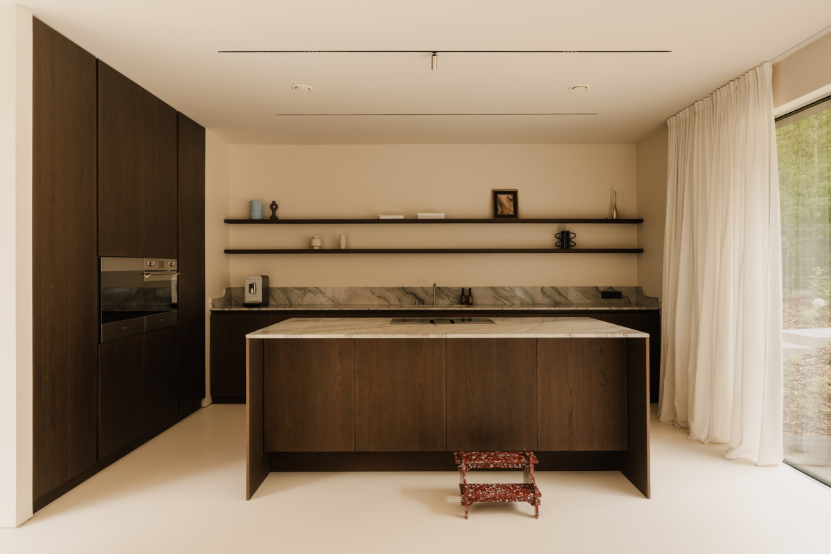 Wnętrza domu zaprojektowano w duchu naturalnej prostoty i ciepła. Dominują w nich materiały inspirowane przyrodą – drewno, kamień, stal, które tworzą spójną, ponadczasową kompozycję. Meble w kuchni i głównej łazience wykonano z forniru dębowego bejcowanego na ciemny odcień, co podkreśliło elegancki i nowoczesny charakter aranżacji. Na uwagę zasługuje też ciemna patchworkowa mozaika z włoskich płytek, którą architekt wyłożył fragment ściany w salonie, tworząc wizualny kontrast z neutralną bielą sofy, ścian i podłogi w salonie.