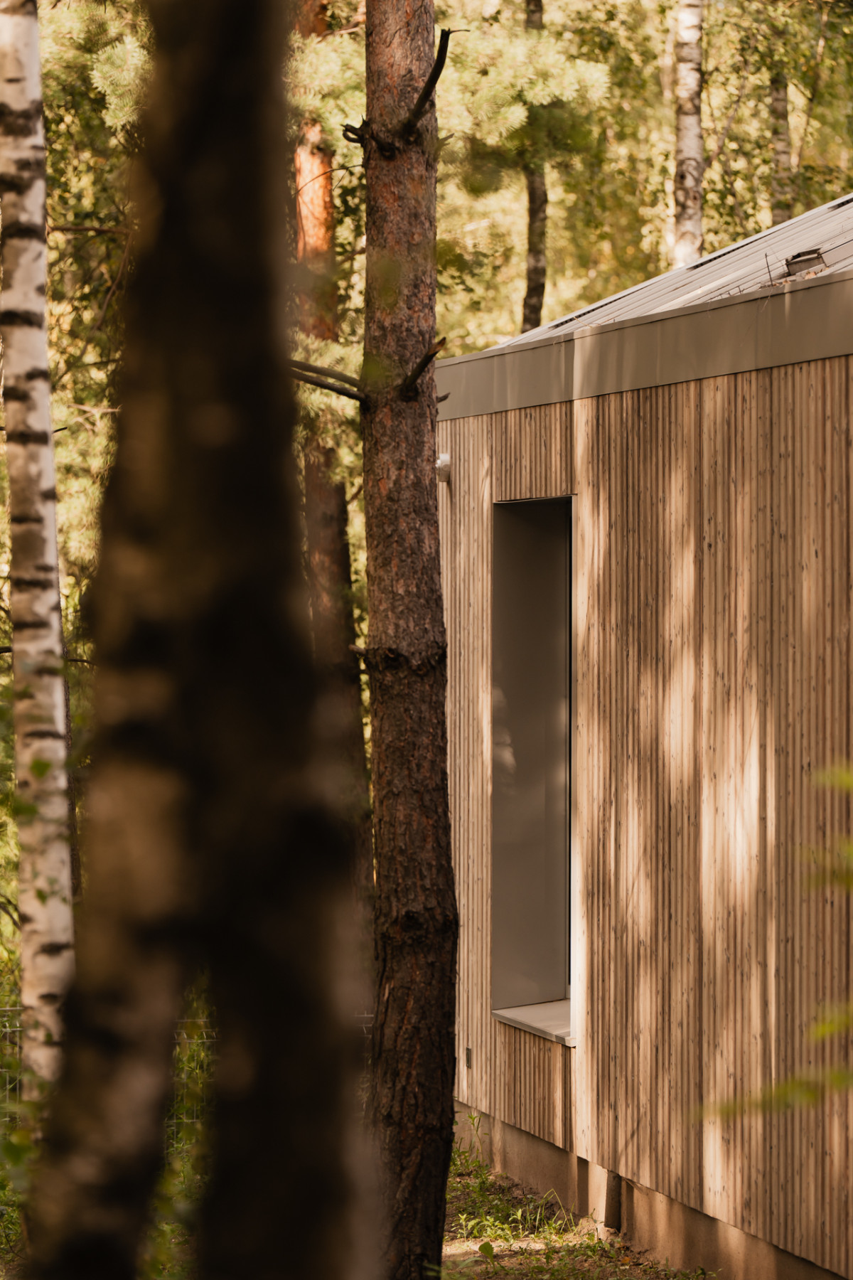 Dom w konstrukcji drewnianej zaprojektowano z dużym naciskiem na zrównoważone rozwiązania materiałowe i estetyczne. Elewacje wykończono naturalną deską, której powierzchnia z czasem szlachetnie patynuje, współgrając z kolorytem otaczających posesję drzew. Stolarkę okienną wykonano z aluminium anodowanego, co nadało bryle budynku subtelności i nowoczesnego charakteru, jednocześnie zapewniając trwałość i surowy wygląd, który od początku był istotnym punktem odniesienia podczas projektowania budynku.