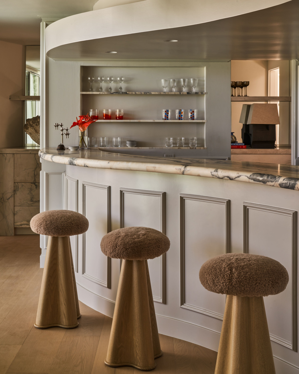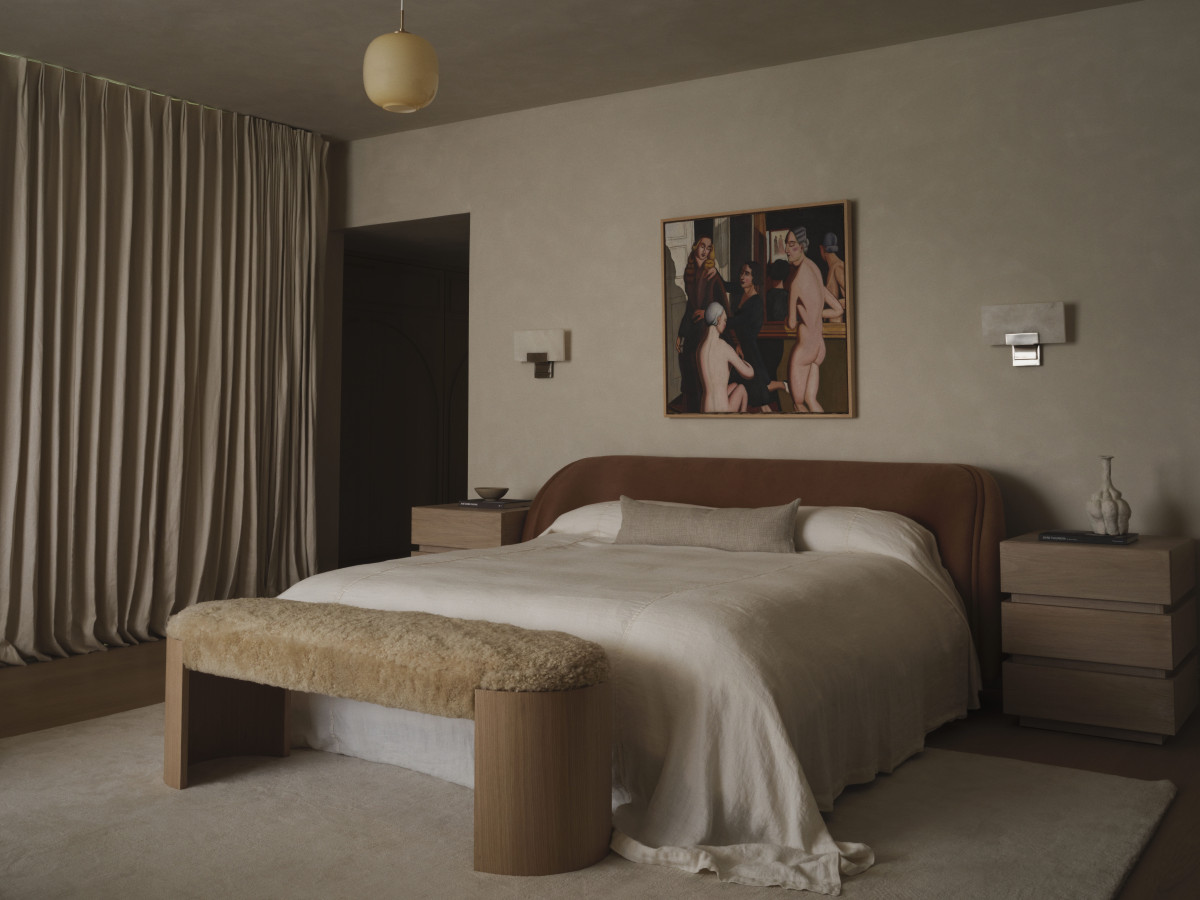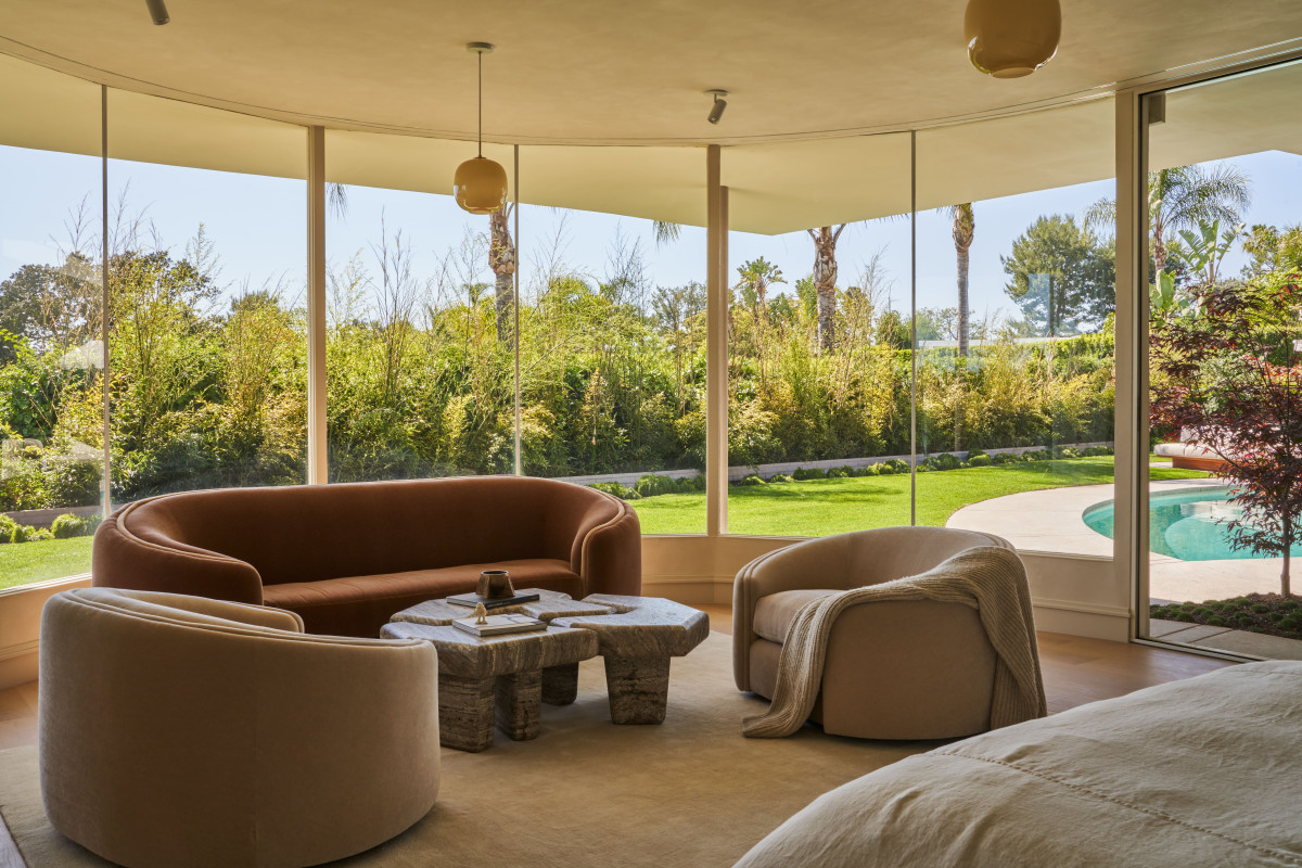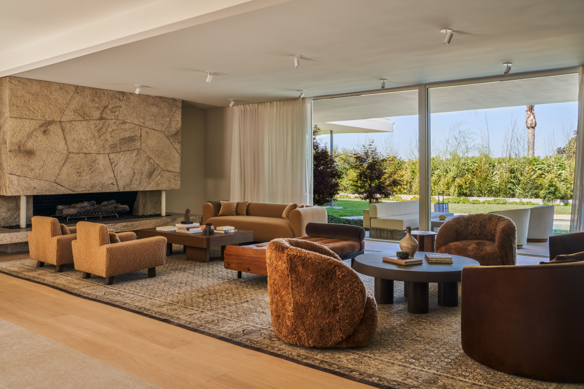 - Zawsze staramy się, by jeden styl nie definiował całego domu, dlatego także i tu zdecydowaliśmy się na fuzję różnych stylów i estetyk charakterystycznych dla czasu, w którym powstał dom – mówi duet projektantów. We wnętrzu można więc zauważyć wpływy włoskiego modernizmu lat 60. (m.in. żyrandol w jadalni i oświetlenie zewnętrzne). Aranżacja baru nawiązuje do eleganckiego stylu Hollywood Regency, natomiast inspiracje Pierre’m Cardinem, Achillem Castiglionim i Arnem Jacobsenem widoczne są w parawanach w pokoju telewizyjnym oraz sofach w salonie. Stolarka i kamień w głównej sypialni oraz łazienkach gościnnych to z kolei ukłon w stronę Davida Hicksa z lat 60.