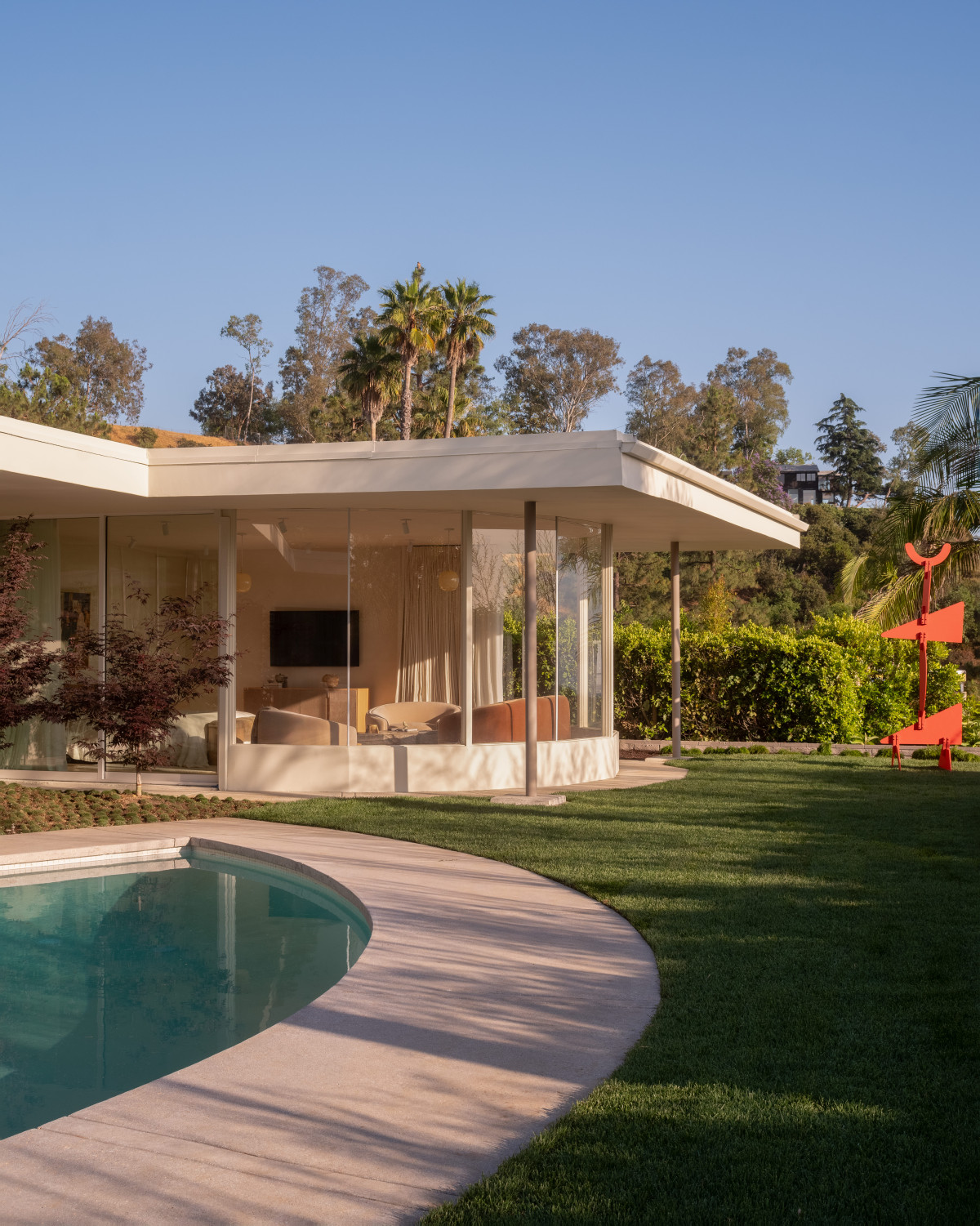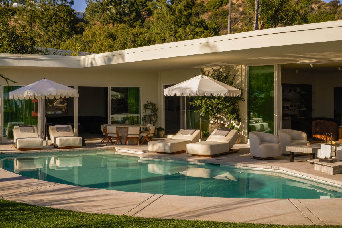 Budynek z 1966 roku to konstrukcja w typie post-and-beam, charakteryzująca się płaskim dachem, elewacją ze stalowymi elementami, a także półkolistym, szklanym przeszkleniem od strony basenu. Ponad 550-metrowa nieruchomość ma kształt dwóch odwróconych liter „U”, przy czym jedna część obejmuje atrium, a druga – basen i ogród z widokiem na góry Santa Monica. Dom był remontowany tylko raz, dzięki czemu wiele jego oryginalnych elementów zachowało pierwotną formę.