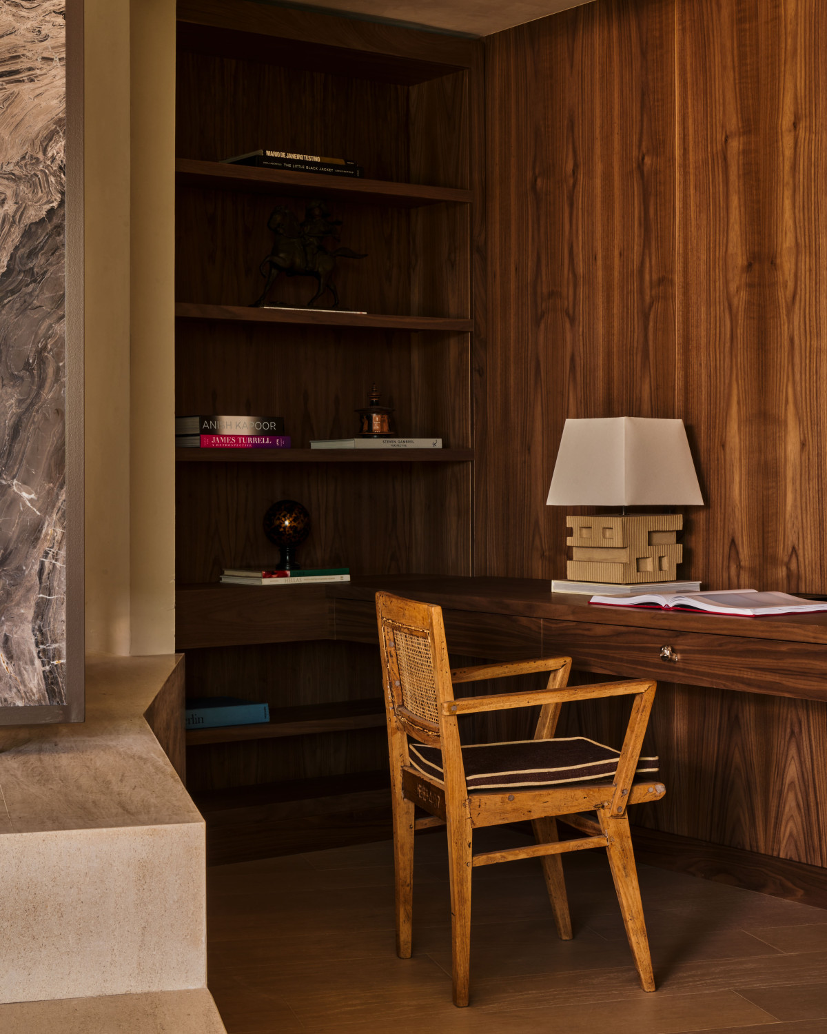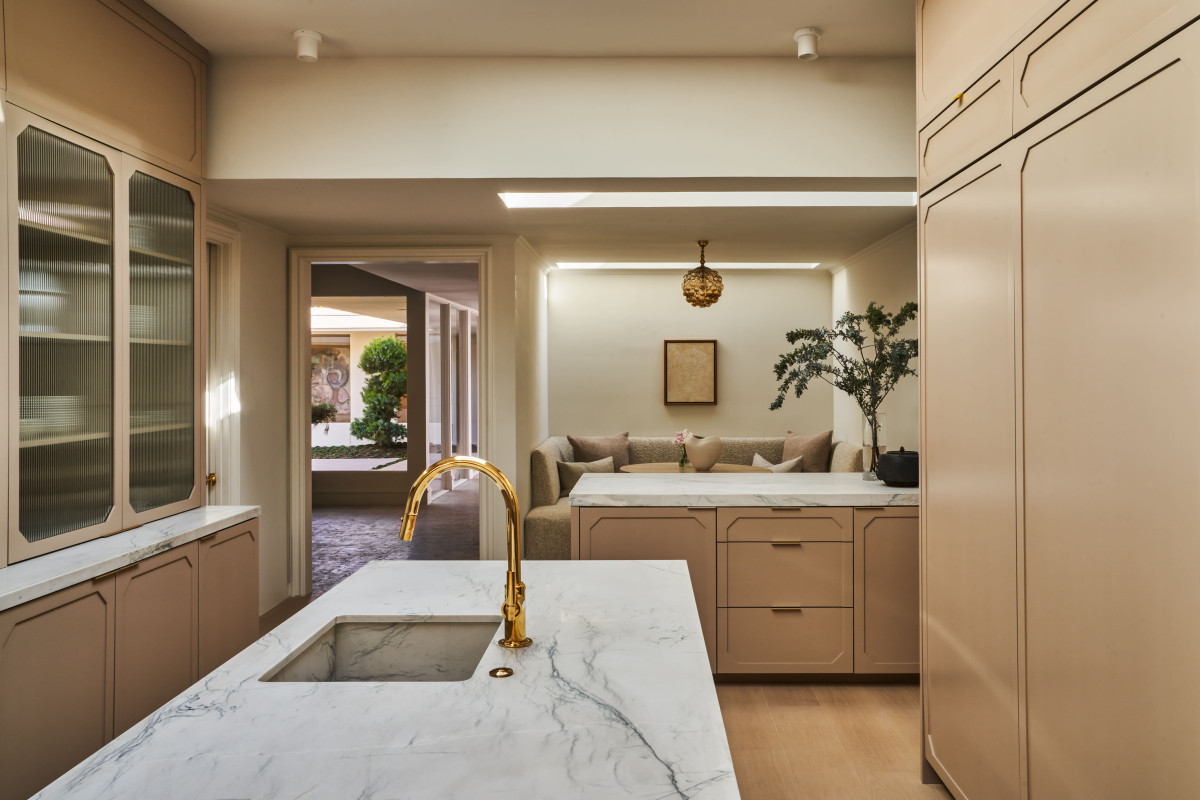 Na elewacji domu zastosowano srebrny trawertyn (na ścianie wejściowej i kolumnadzie). Drzwi z orzecha zostały pieczołowicie odrestaurowane i wzbogacone uchwytami projektu Paula Evansa. Oświetlenie to zarówno wpuszczane reflektory, jak i wiszące, stylowe oprawy. Kuchnia utrzymana jest w jasnym, różowawym odcieniu bieli z wysoką zabudową i przejściem proawdzącym do kamiennej wnęki z barem.