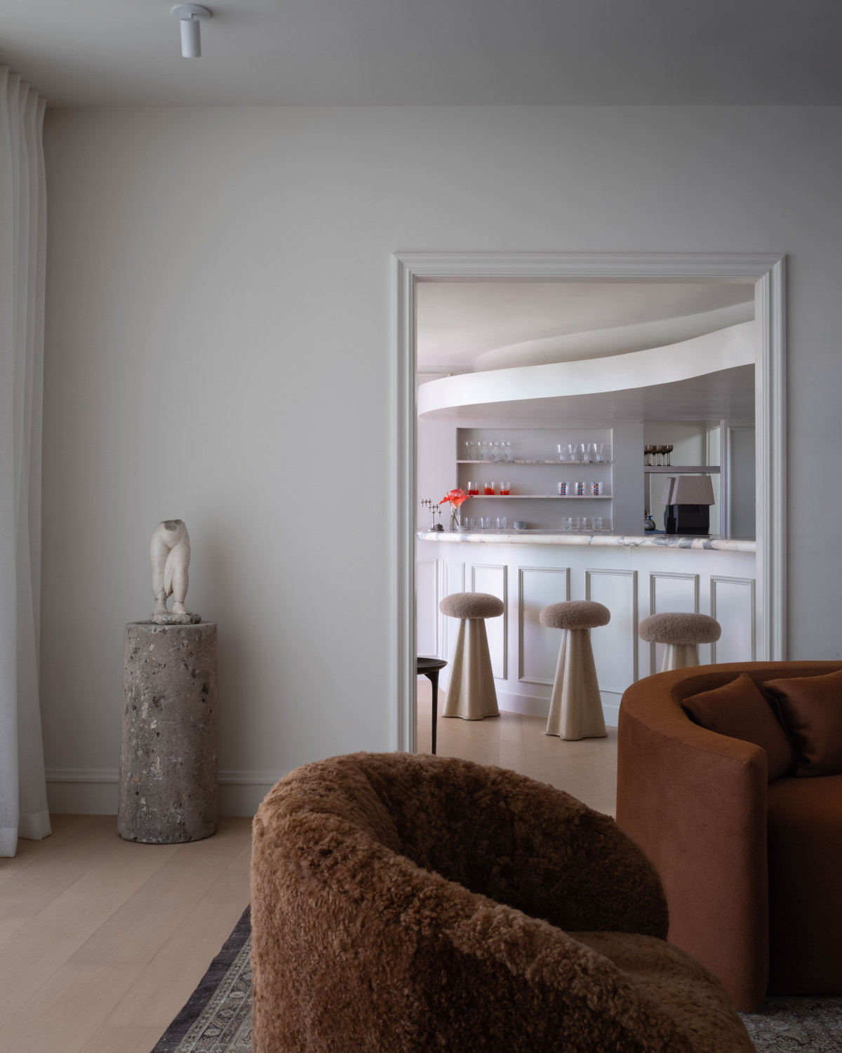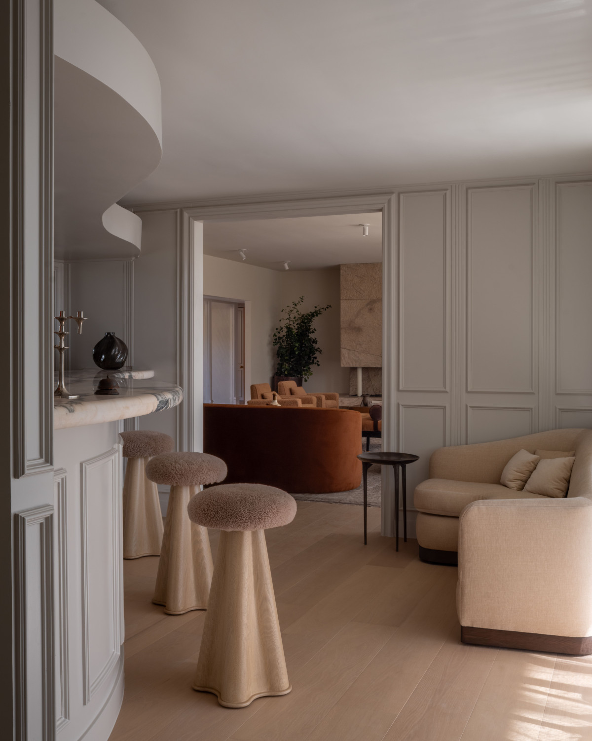 Wnętrza wypełniają perełki designu, np. leżanka S.C.A.L. z 1950 roku projektu Jeana Prouvé oraz szafka Jeana Royère’a z 1935 roku. Większość mebli to jednak autorskie projekty Aryi i Michaela wykonane z białego dębu i orzecha, wzbogacone moherem, strzyżoną wełną, aksamitem i tytanowym chromem. Na uwagę zasługuje sofa DeGaulle, fotel Ariana i regał Wallace – modele te wchodzą w skład najnowszej kolekcji OSKLO, „Trousdale”.