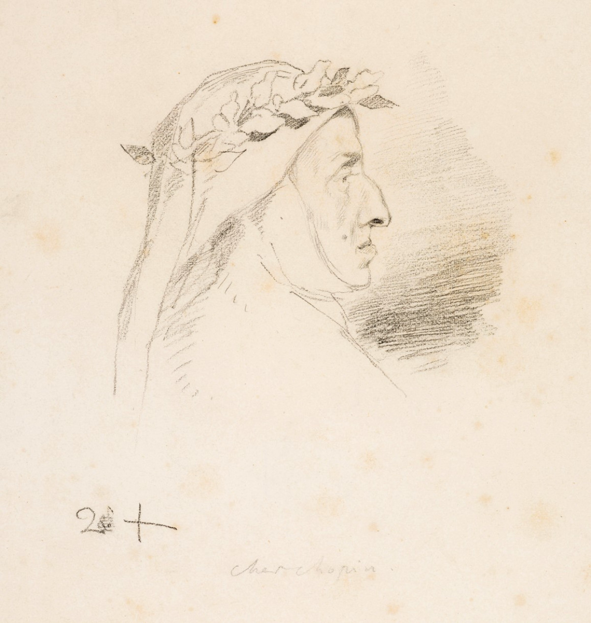 Drugi portret rysunkowy przedstawia Fryderyka Chopina jako Dantego Alighieri. Kompozytor ma na głowie florencką kapuzę i wieniec laurowy – symbol prawdziwego artysty. Delacroix zespolił w tym symbolicznym portrecie dwóch wybitnych artystów – geniusza słowa i geniusza fortepianu. Na rysunku widnieje podpis „Cher Chopin” oraz rebus będący podpisem malarza. W Polsce pracę tę można było oglądać ostatni raz 25 lat temu podczas wystawy na Zamku Królewskim w Warszawie.