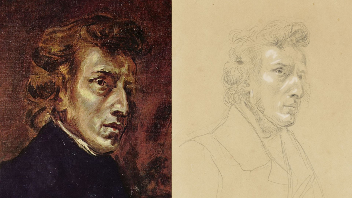 Po lewej: Eugène Delacroix, fragment podwójnego portretu Fryderyka Chopina i Georges Sand, 1838, Musée du Louvre, Zdjęcie: Wikipedia; po prawej: Eugène Delacroix, Fryderyk Chopin, 1838, Musée du Louvre, Département des Arts graphiques, RF 31280 (fragment). Zdjęcie: dzięki uprzejmości Muzeum Fryderyka Chopina w Warszawie