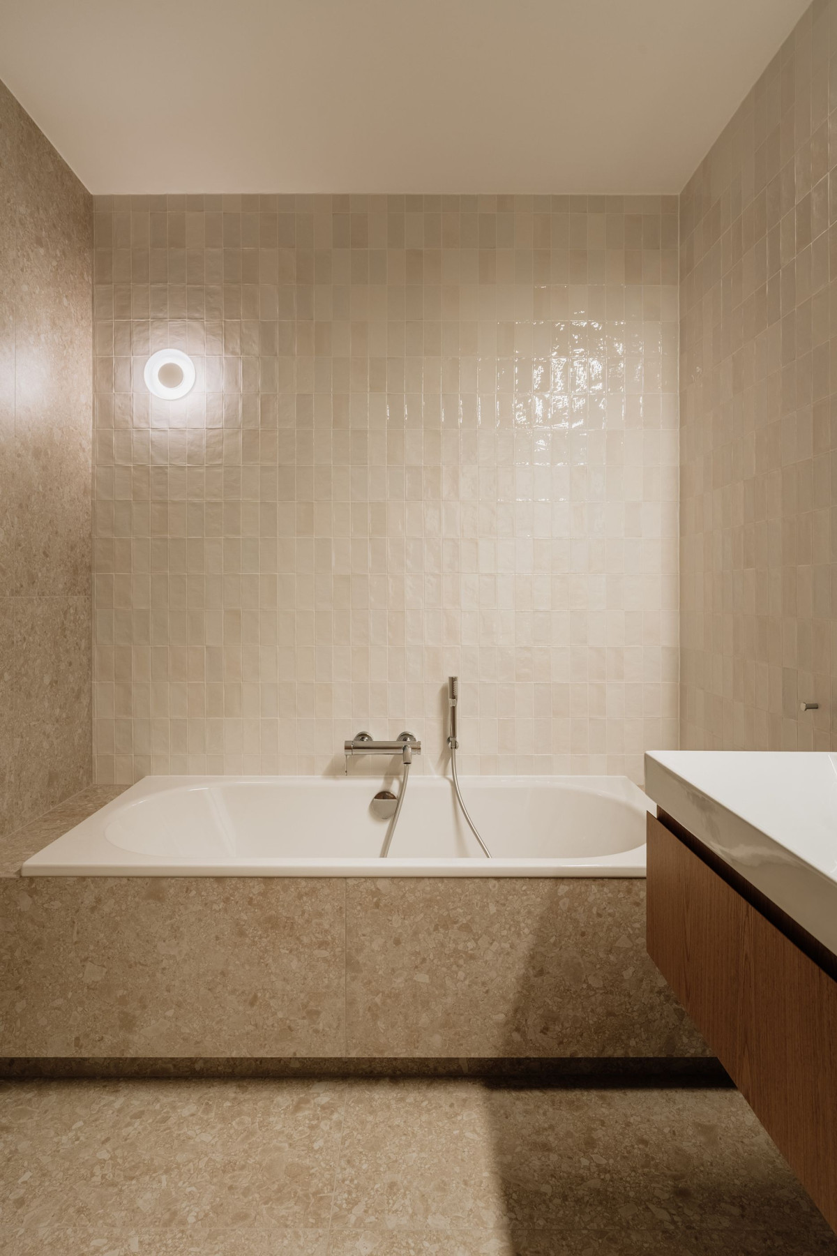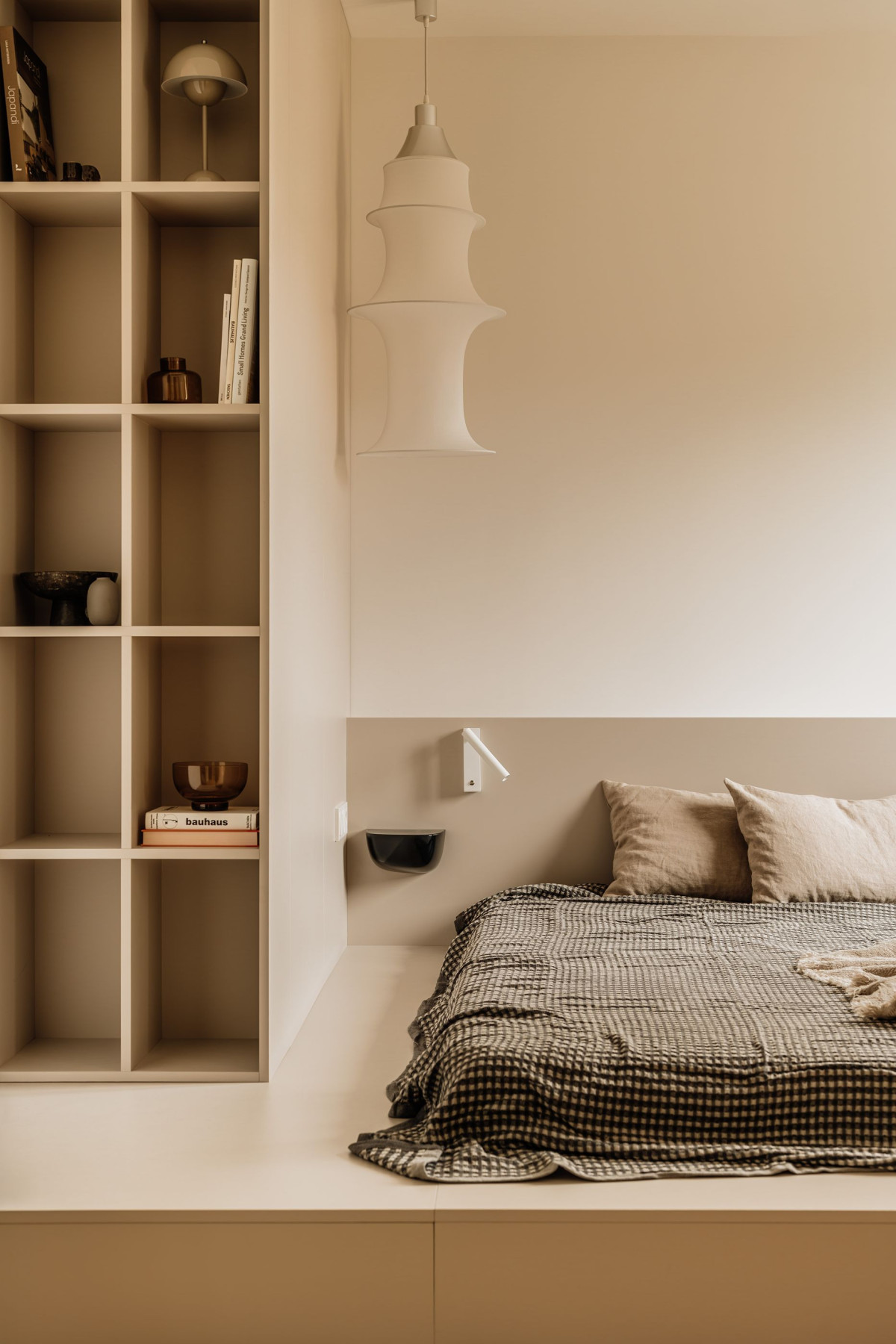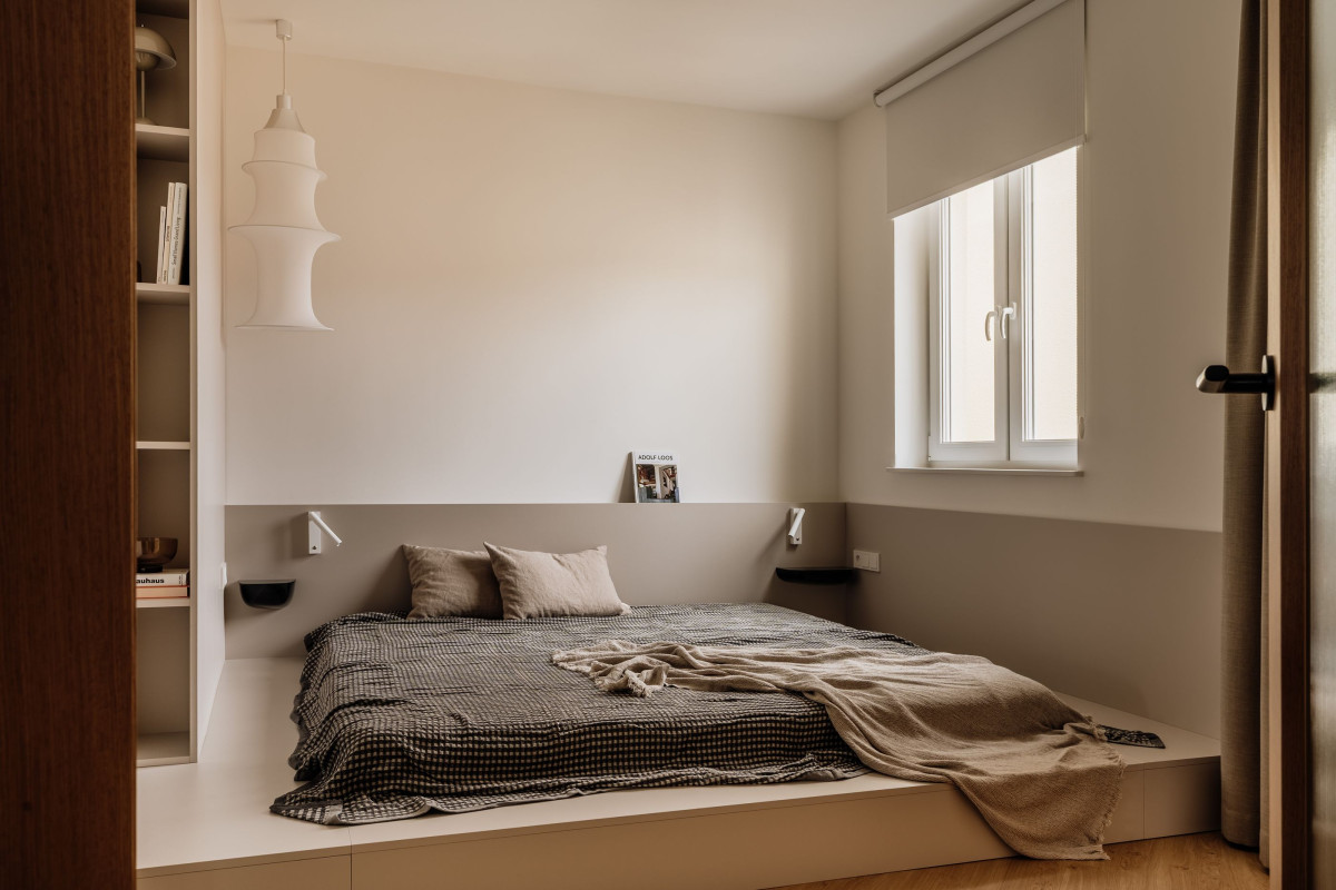Piętro jest odbiciem parteru pod względem proporcji i wykorzystanych materiałów, natomiast jeśli chodzi o klimat – strefa prywatna jest bardziej intymna i wyciszona. W sypialni master dominuje jasna zabudowa i niska platforma łózka inspirowana japońskim minimalizmem, a całość oświetlają subtelne, punktowe źródła światła.
