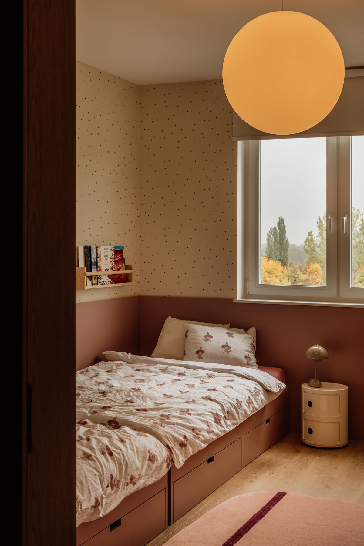 Przestrzeń dziecięca to połączenie pokoju z bawialnią. Taki układ otwiera możliwość różnorodnego użytkowania i naturalnego dzielenia funkcji. Pastelowa kolorystyka, miękkie struktury oraz neon „FIGLE” nadają tej części mieszkania lekkości i energii, jednocześnie zachowując stylistyczną i materiałową spójność zresztą pomieszczeń.