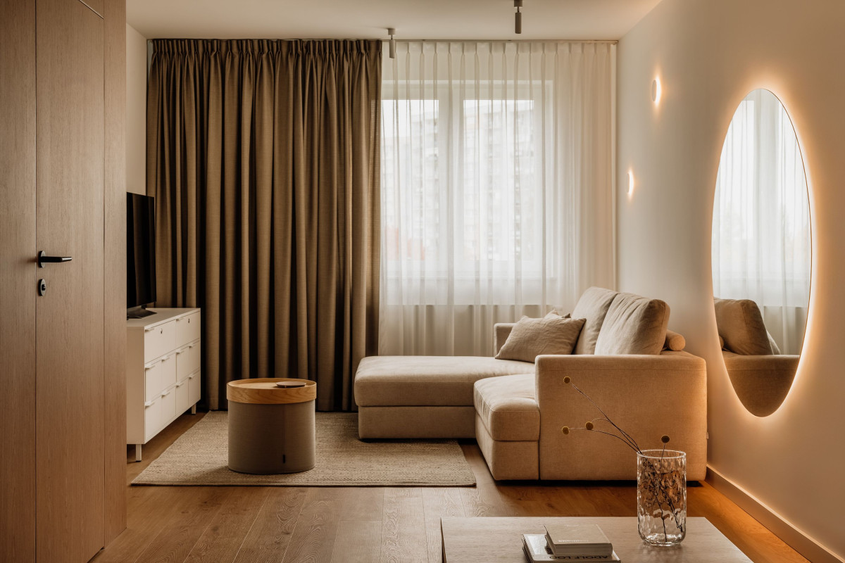 Centralnym elementem salonu jest duże podświetlane lustro w kształcie okręgu. Nie tylko optycznie powiększa strefę wypoczynkową, ale działa też jako świetlny punkt orientacyjny, nadający aranżacji głębi i nowoczesnej lekkości. Obok, w jadalni, uwagę zwraca wykonany w Polsce dębowy stół, nad którym wisi ikoniczna lampa Vitra Akari. Jej miękkie papierowe światło ociepla przestrzeń i dodaje jej artystycznego wyrazu.