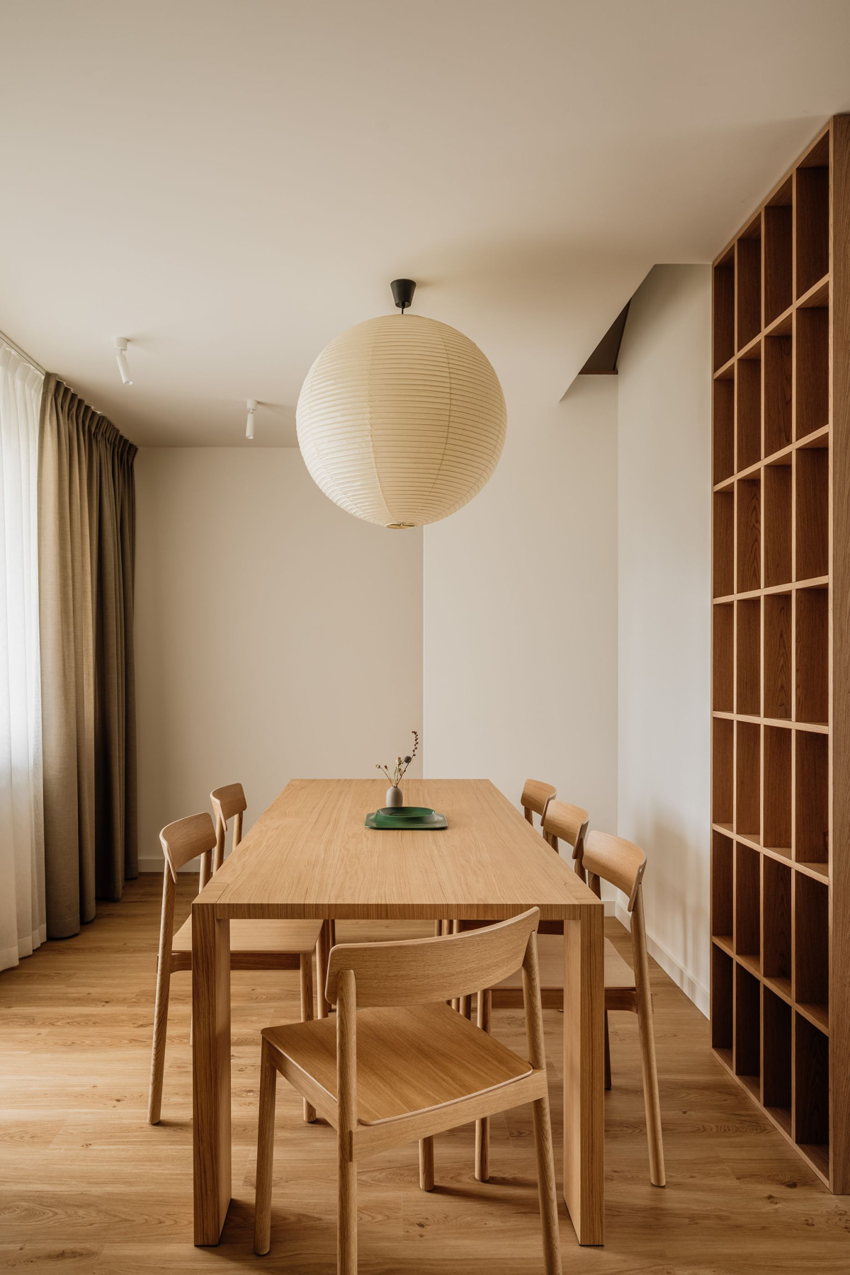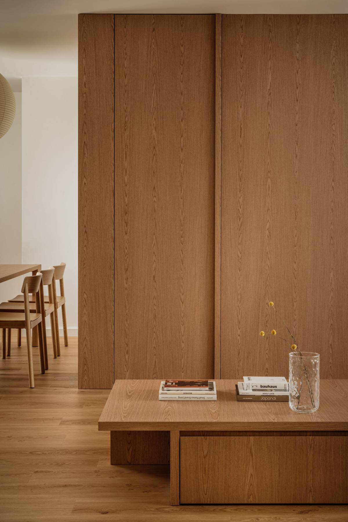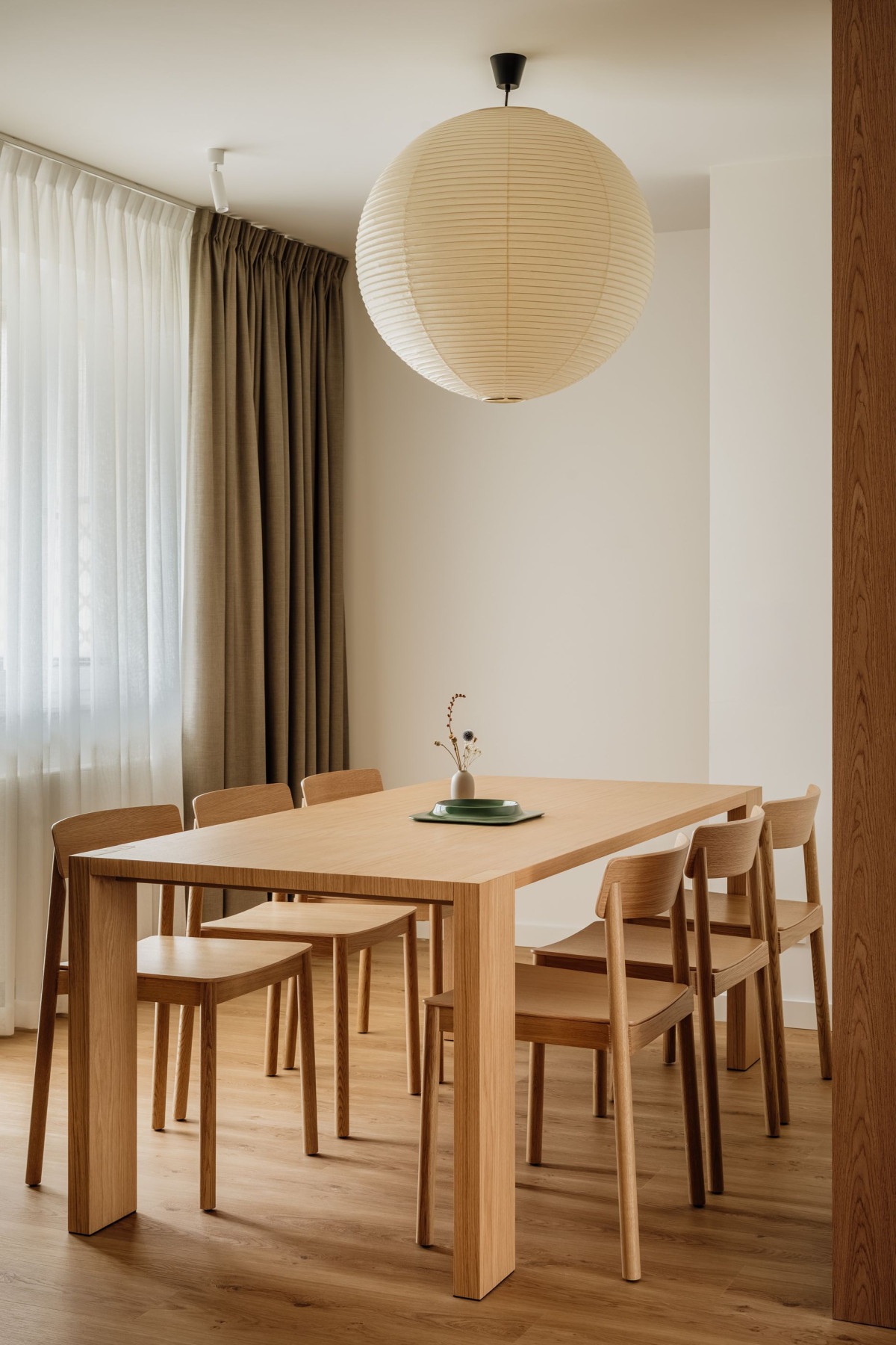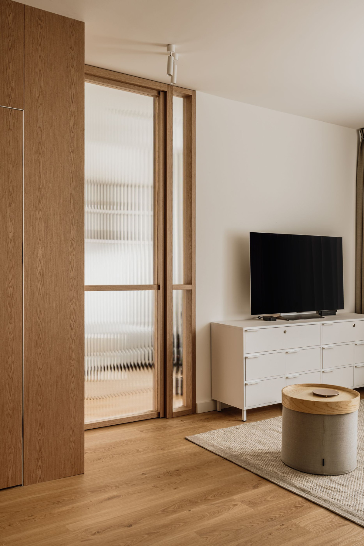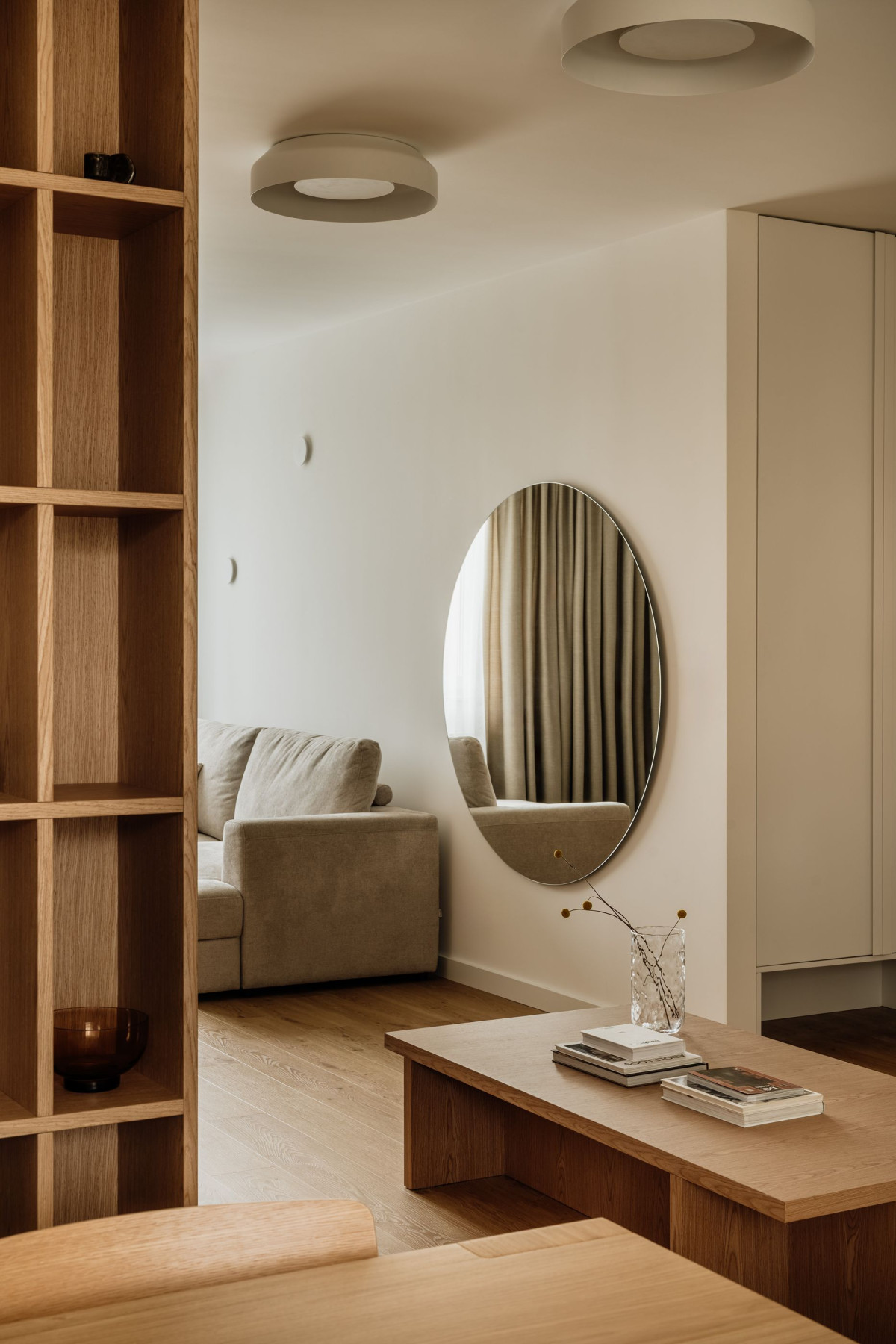 Wspólnym mianownikiem projektu jest naturalny dąb, który występuje w zabudowach stolarskich, drzwiach, posadzce, półkach i meblach. Jego ciepły, spokojny odcień tworzy fundament estetyczny, który przenika wszystkie pomieszczenia, nadając mieszkaniu charakteru, spójności i ponadczasowości.