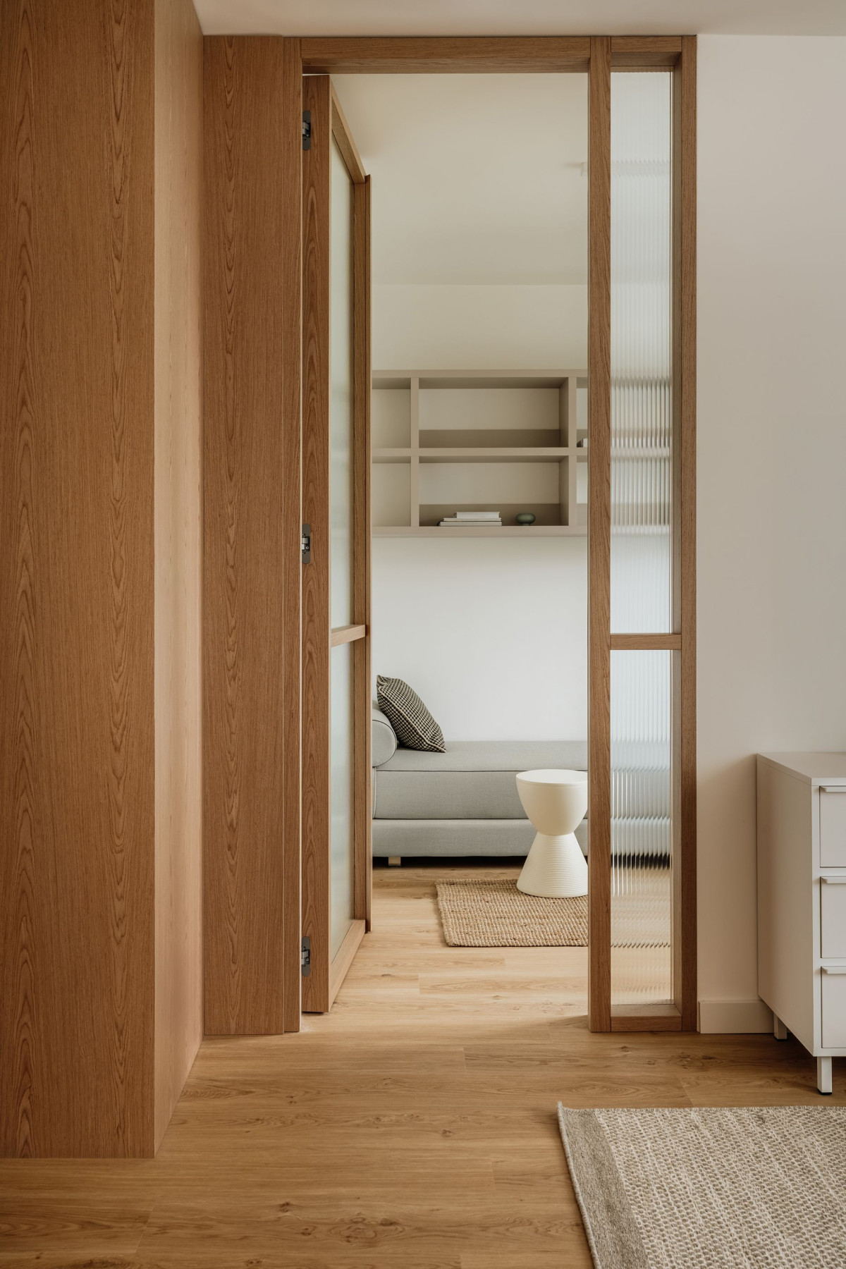 Warto wspomnieć też o innym istotnym elemencie parteru, jakim są drzwi z ryflowanym szkłem łączące salon z otwartym gabinetem / pokojem gościnnym. Ryflowane szkło nie tylko filtruje światło i dodaje przestrzeni lekkości, ale jednocześnie tworzy subtelną, półprzezroczystą granicę między pomieszczeniami strefy dziennej. Gabinet wyposażono w leżankę, która pozwala wykorzystywać tę przestrzeń również jako miejsce krótkiego odpoczynku lub pracy w mniej formalnej atmosferze.