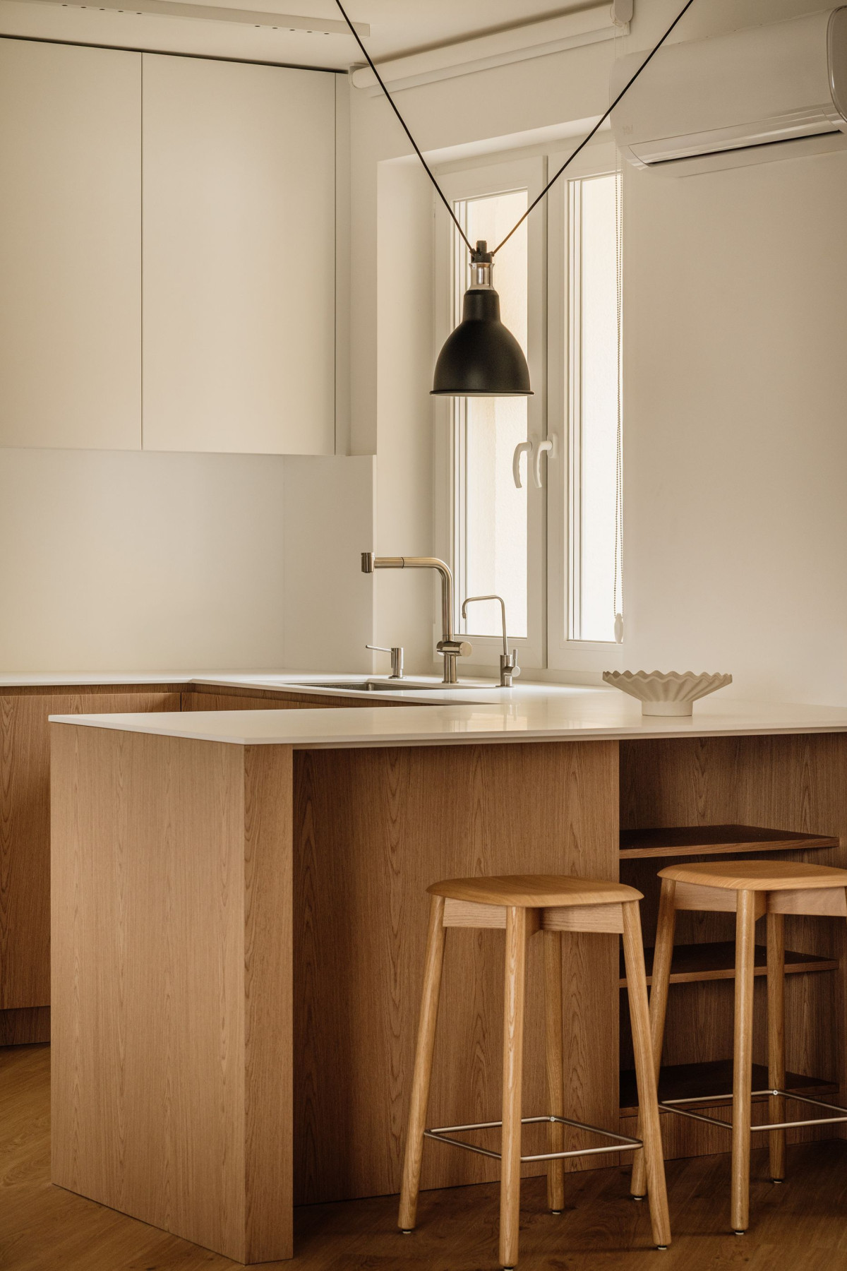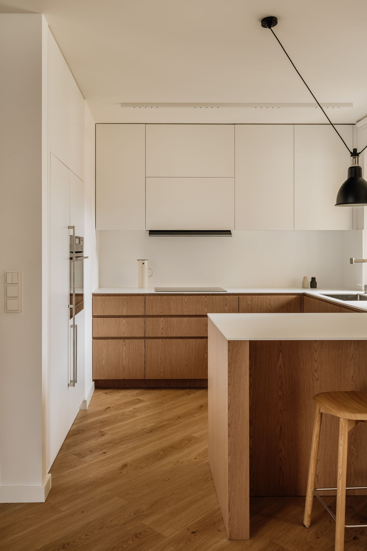 Projektując kuchnię, architekci postawili na prostotę i funkcjonalność. Akrylowe blaty podkreślają nowoczesny charakter wnętrza, a zestawienie jasnej górnej zabudowy z fornirem dolnych szafek tworzy harmonijną kompozycję. Centralna wyspa stała się naturalnym miejscem spotkań i przedłużeniem kuchni – to tu domownicy zatrzymują się na szybkie śniadanie, rozmowę lub krótką przerwę w rytmie dnia.