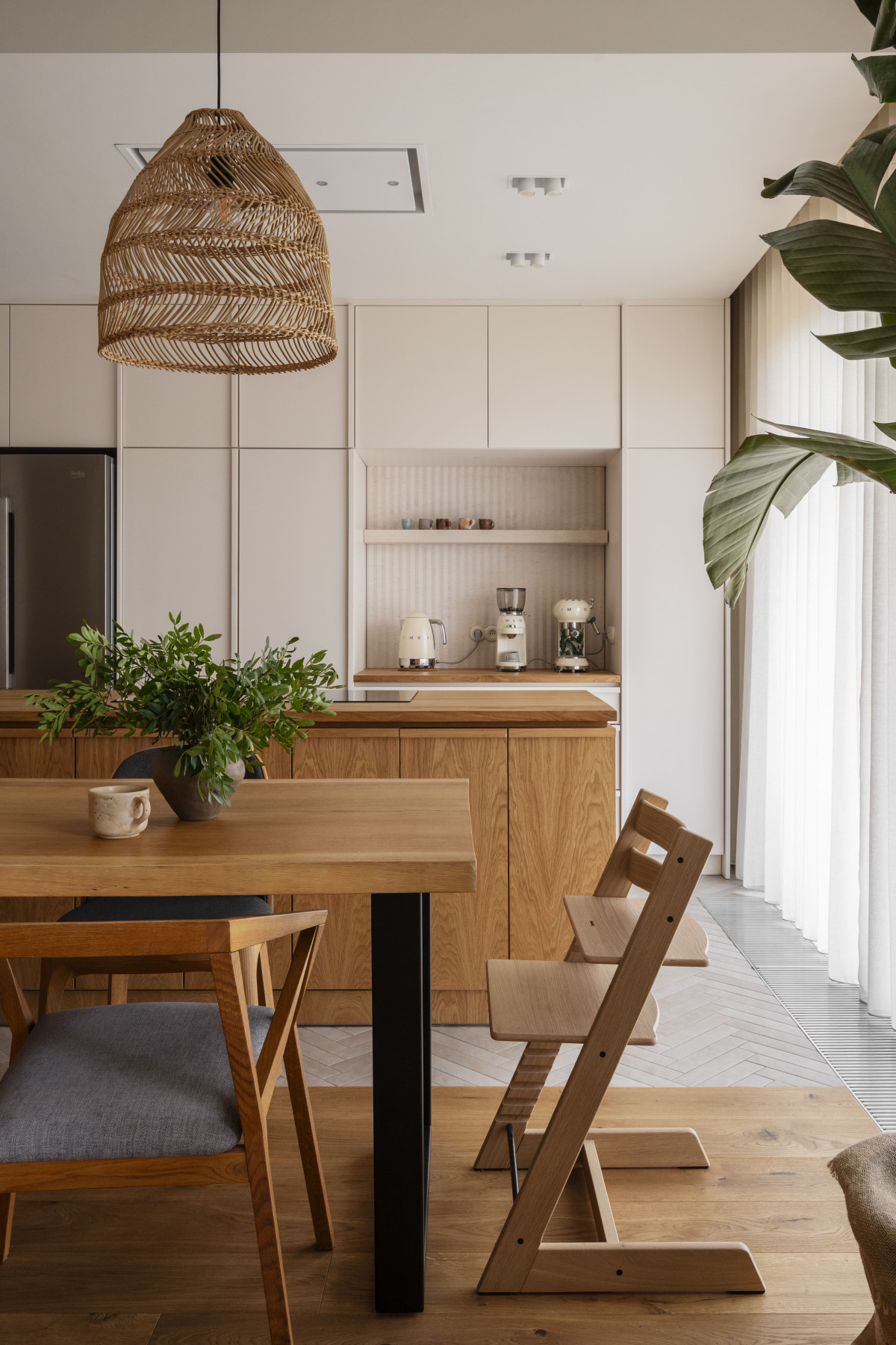 Centrum domowego życia jest przestronna strefa dzienna składająca się z salonu, kuchni i jadalni. Projektantka skupiła się na stworzeniu dużej przestrzeni do gotowania, przechowywania i wspólnego przygotowywania posiłków. Kuchnia, dopracowana w formie, jest nie tylko maksymalnie funkcjonalna, ale również cieszy oko. Tu warto wspomnieć o wnęce kawowej wykończonej kamieniem i oświetlonej ciepłym światłem czy wyspie z naturalnego drewna.