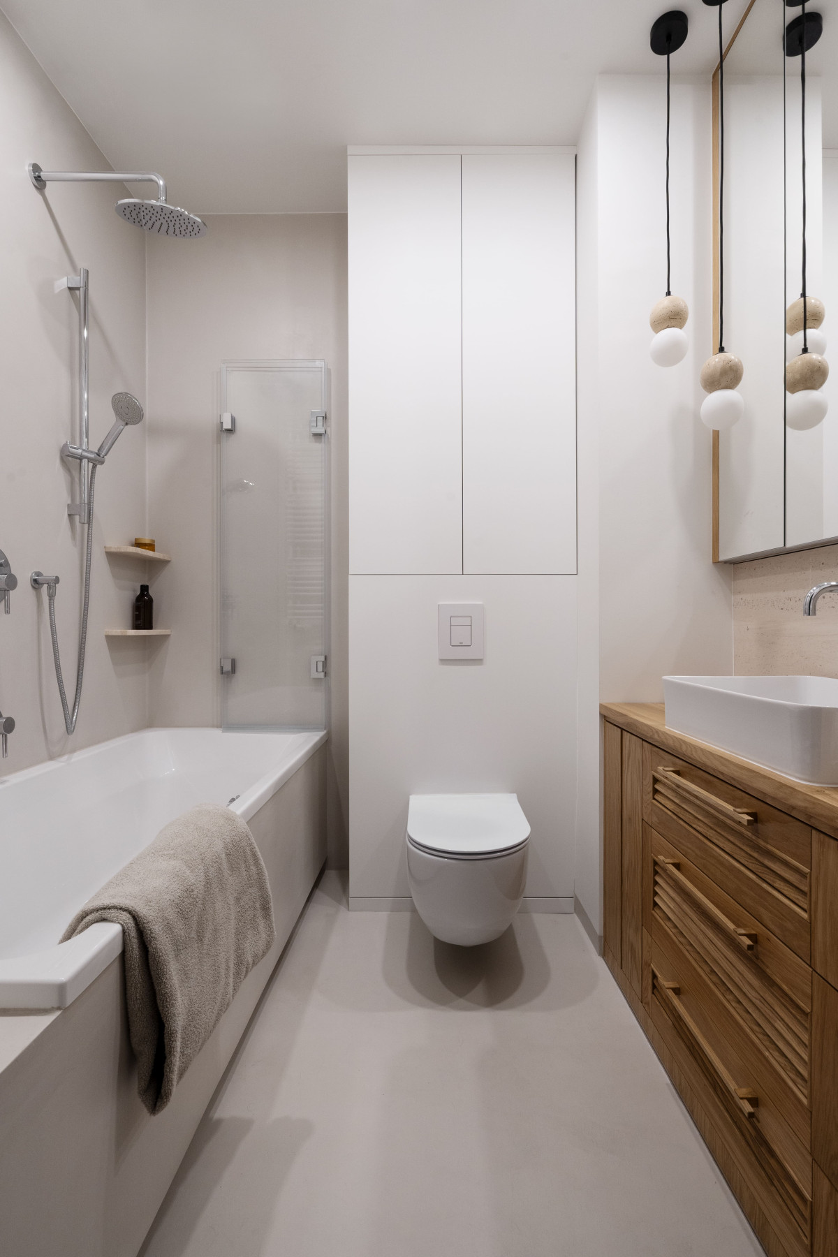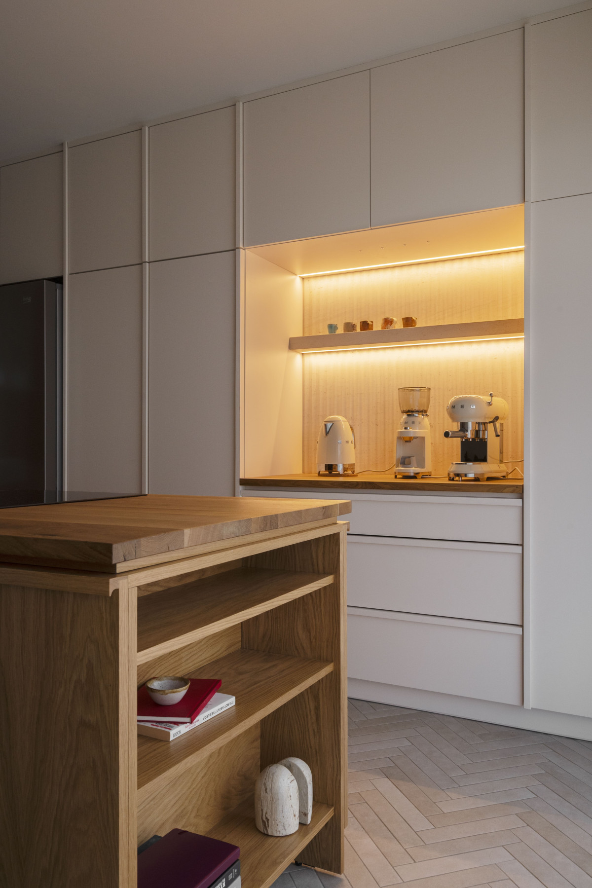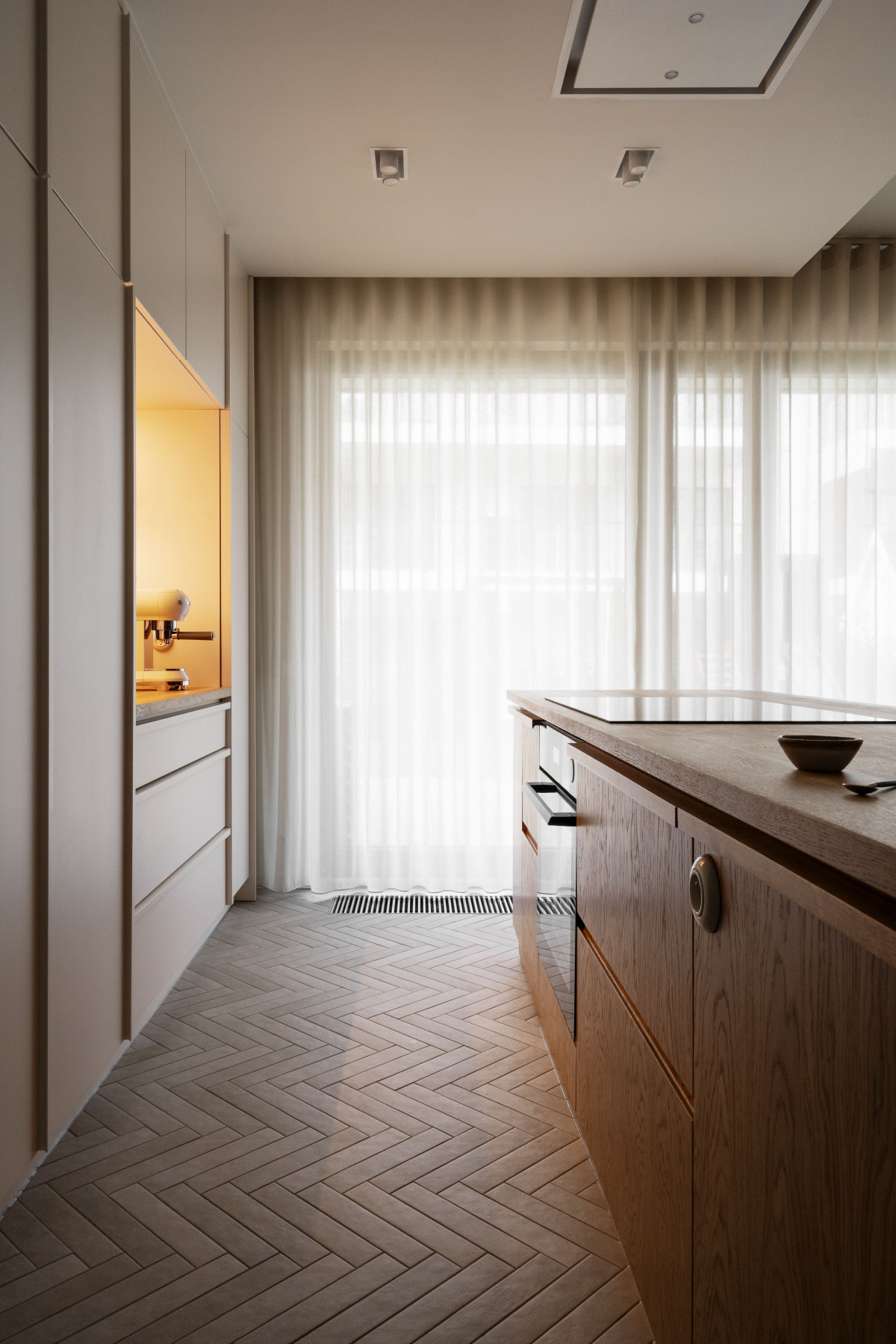Klimat tego pomieszczenia przenosi się do pozostałych przestrzeni. Pojawiają się tam te same materiały, ciepłe światło, wyraziste drewno i naturalny kamień. Ich tło stanowią proste wykończenia drzwi na ukrytych ościeżnicach i mikrocement na ścianach, a nawet meblach.