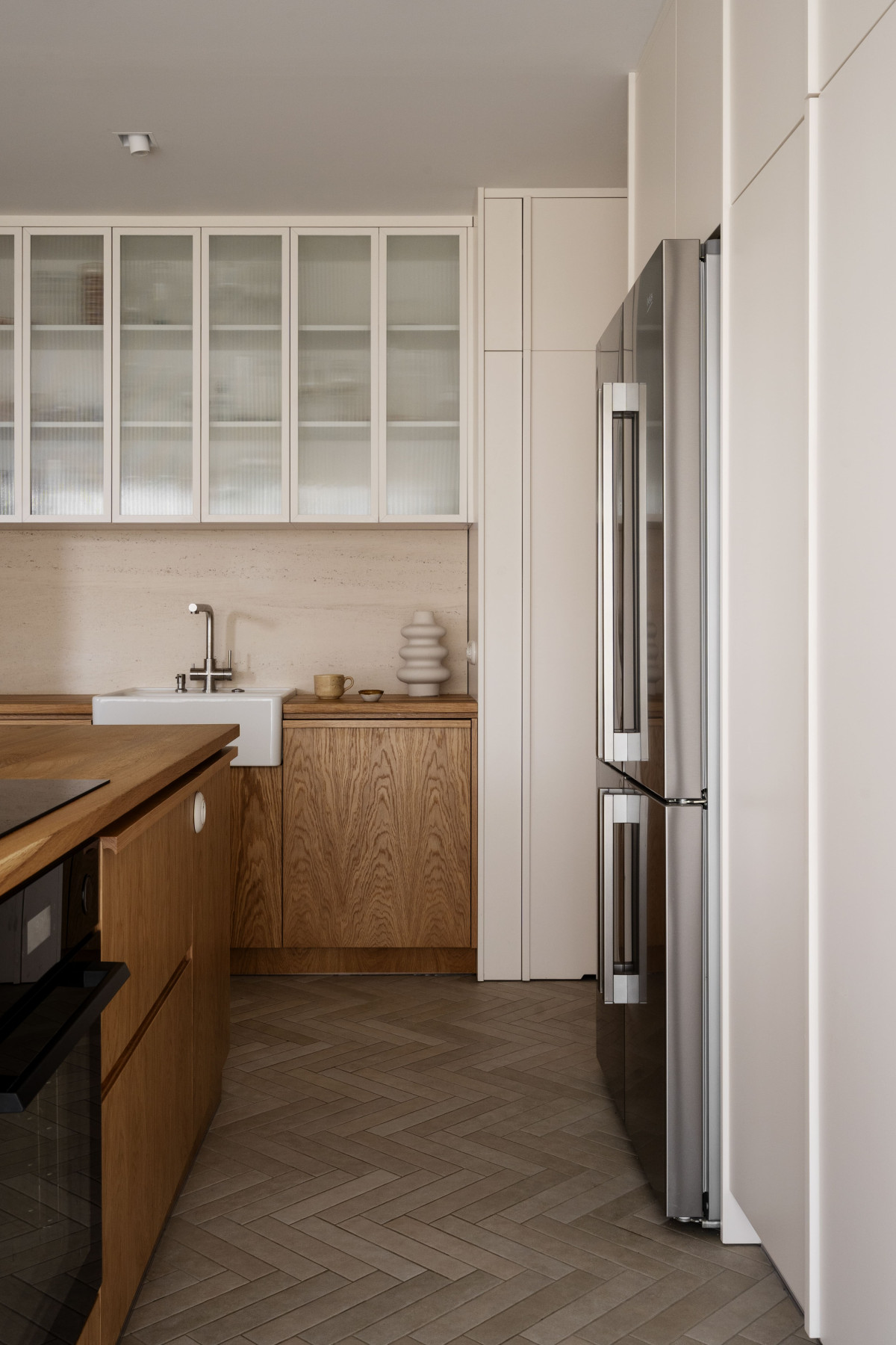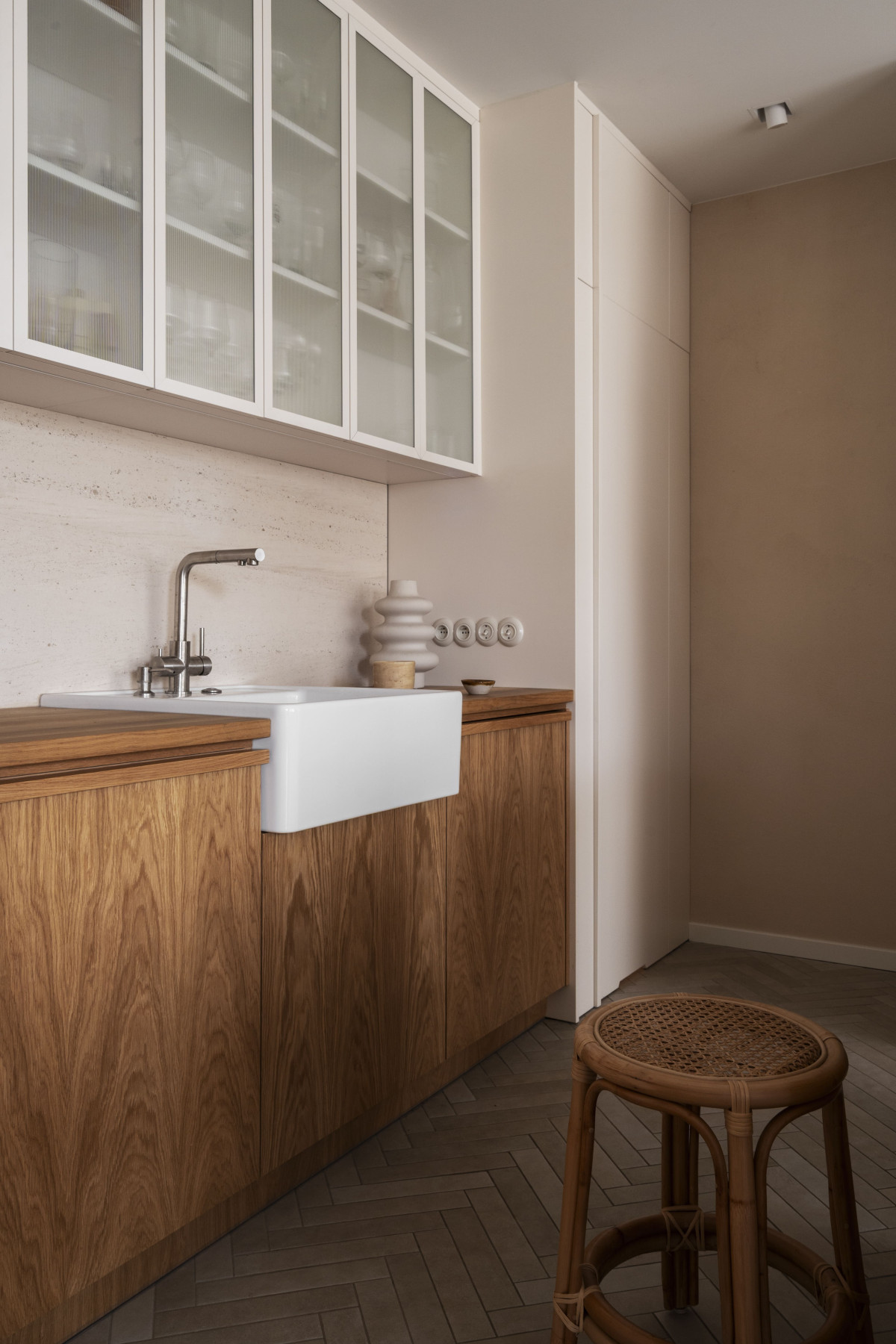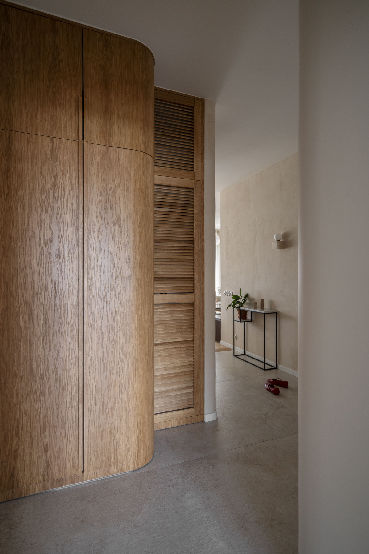 Klimat tego pomieszczenia przenosi się do pozostałych przestrzeni. Pojawiają się tam te same materiały, ciepłe światło, wyraziste drewno i naturalny kamień. Ich tło stanowią proste wykończenia drzwi na ukrytych ościeżnicach i mikrocement na ścianach, a nawet meblach.