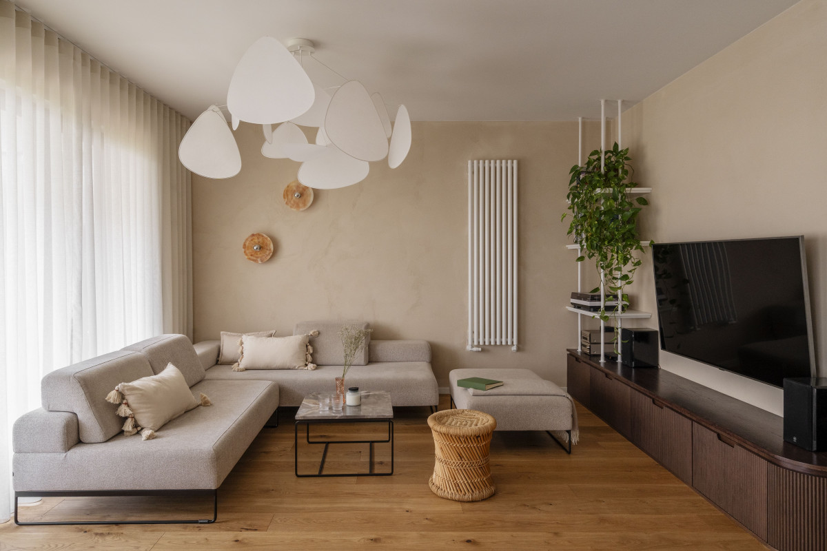 Z klientami, rodziną z dwójką maluchów, projektantka współpracowała już przy poprzednim mieszkaniu – które, co ciekawe, znajduje się na tym samym osiedlu, co nowe lokum. Część mebli i elementów wyposażenia z poprzedniego mieszkania właściciele zabrali ze sobą, w tym stół i krzesła do jadalni, dwie lampy, konsolę i sofę modułową do salonu.