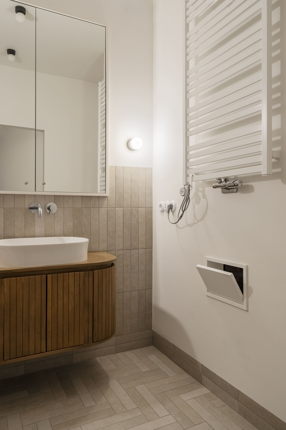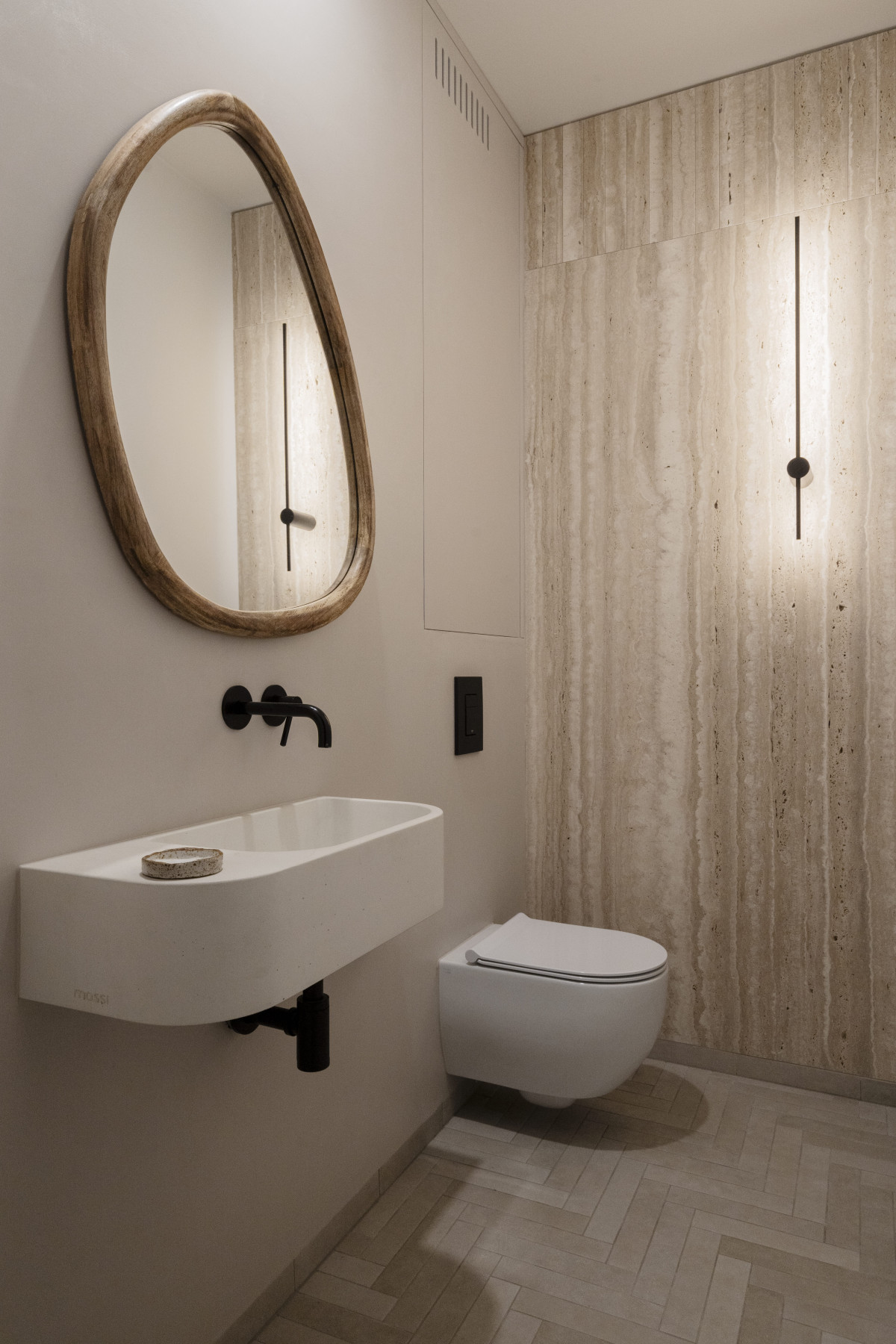 Łazienka gościnna jest prostym pomieszczeniem, które ujmuje okładziną z naturalnego trawertynu i drewnianym akcentem lustra. Podłogę wykończono takimi samymi płytkami, jak w kuchni, natomiast ścianę i szafkę skrywa wykończenie z mikrocementu, tworząc jednolite tło.