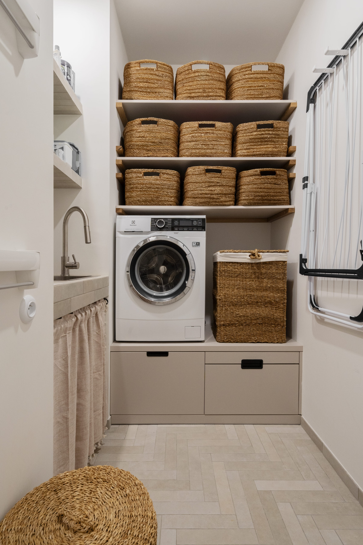 - Poza sypialniami dzieci i rodziców, resztę pomieszczeń dopasowaliśmy już do planu ostatecznego, nie szczędząc wyburzeń, przeróbek i nowych ścian – wyjaśnia Dominika Wojciechowska. Dwupoziomowe mieszkanie zyskało tym samym praktyczne garderoby, spiżarnię oraz ilość łazienek, zapewniającą komfortowe użytkowanie przestrzeni. Projektantka przerobiła też istniejącą pralnię w estetyczne i wielofunkcyjne pomieszczenie domowego zaplecza gospodarczego.