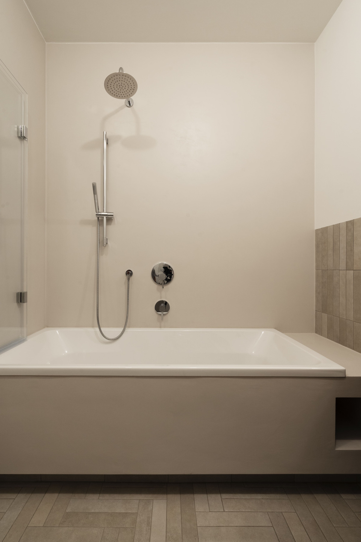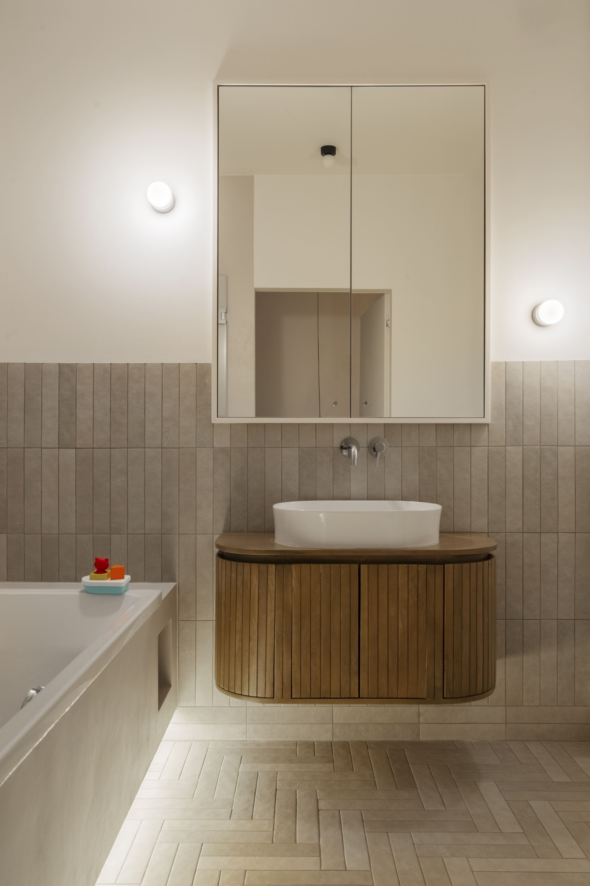 Główna łazienka to z kolei przytulne domowe spa – z jeszcze większą ilością ciepłego drewna oraz miejscem do przechowywania. Kilka zróżnicowanych opcji oświetlenia pozwala na wykorzystanie łazienki do zabiegów pielęgnacyjnych na równi z odpoczynkiem.