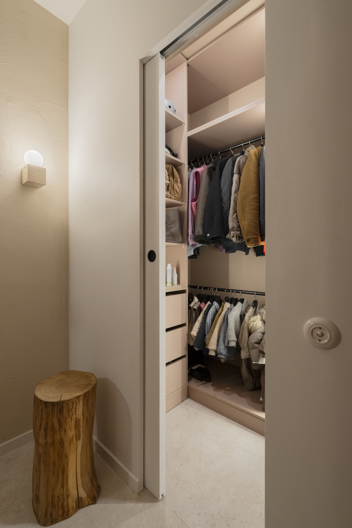 Przy zakupie mieszkania nie było w nim schodów, jedynie otwarta klatka schodowa do własnej aranżacji. Projektantka zaaranżowała tę przestrzeń tak, by pod biegami schodów na piętro zmieścić przestronną spiżarnię, do której wejść można od strony kuchni. Drzwi do spiżarni są jednak na pierwszy rzut oka niewidoczne – zostały płynnie wkomponowane w kuchenną zabudowę.