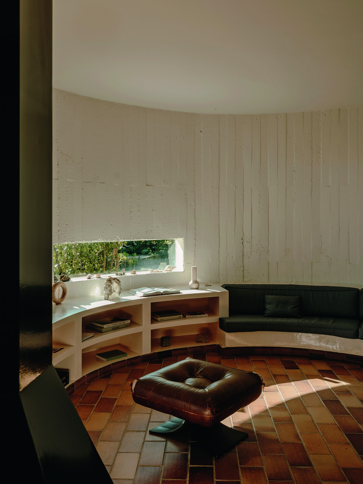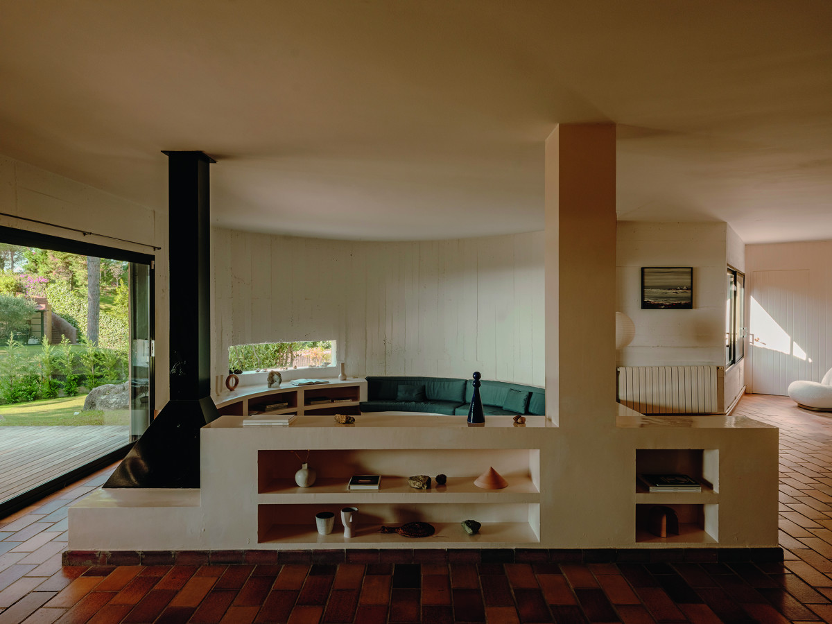 Główna część dzienna zachowała oryginalne wykończenia i część wyposażenia. Pośrodku tapicerowany skórą podnóżek krzesła „Alta” autorstwa Oscara Niemeyera i jego córki Anny Marii Niemeyer z 1971 roku. Zdjęcie: Salva López