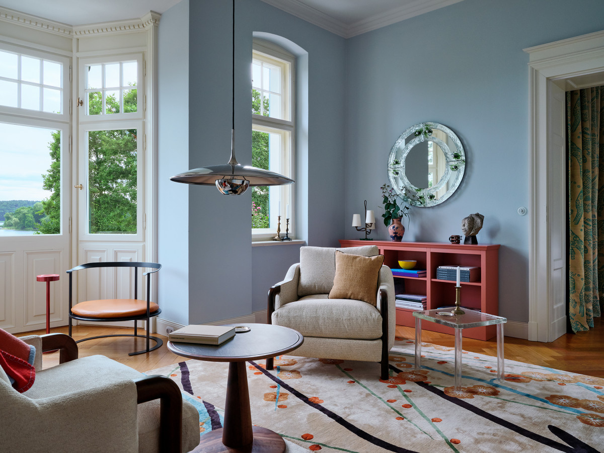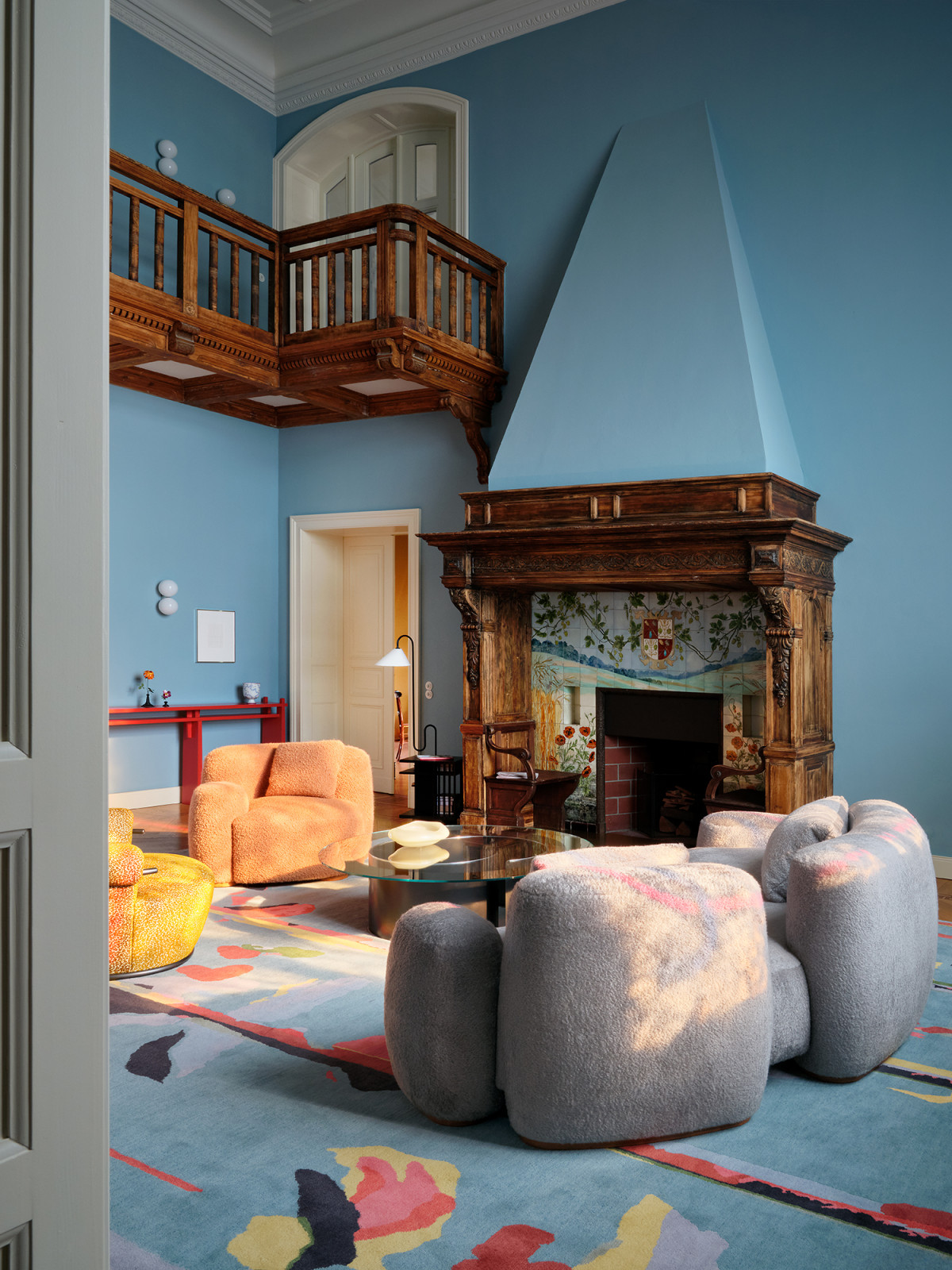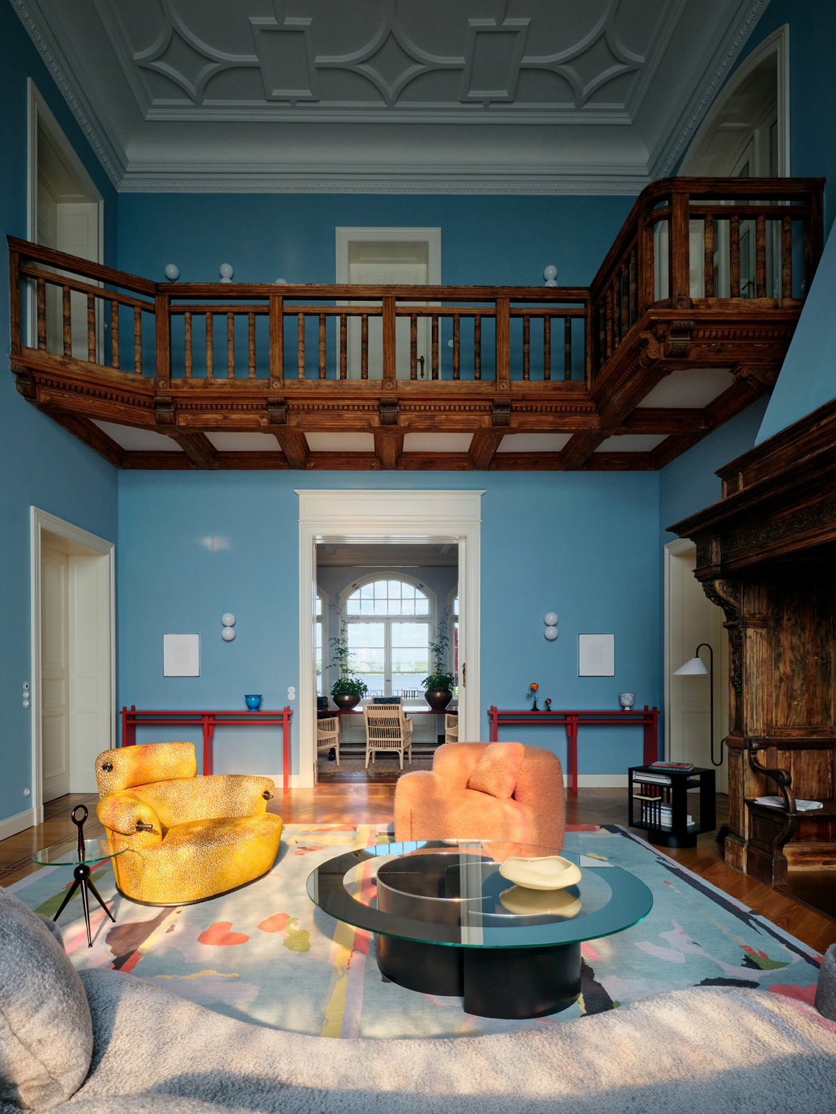 Dywan „Ofelia”, z motywem roślin wodnych, został zaprojektowany specjalnie do tego wnętrza z założeniem, że będzie oglądany z wielu perspektyw. Z prawej fotel „Baba”, również autorstwa Pöpplera, z lewej fotel „Toro”, zaprojektowany przez Luigiego Caccię Dominioniego w 1973 roku i wyprodukowany przez markę Azucena. Zdjęcie: Thomas Heimann