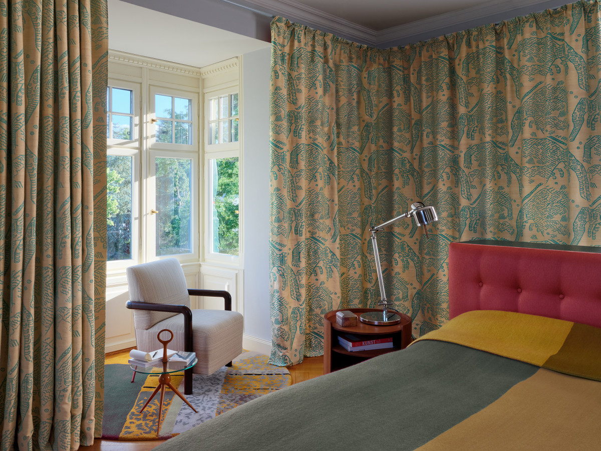 Jedna z ośmiu sypialni. W głębi fotel „Council” Pöpplera. Zdjęcie: Thomas Heimann