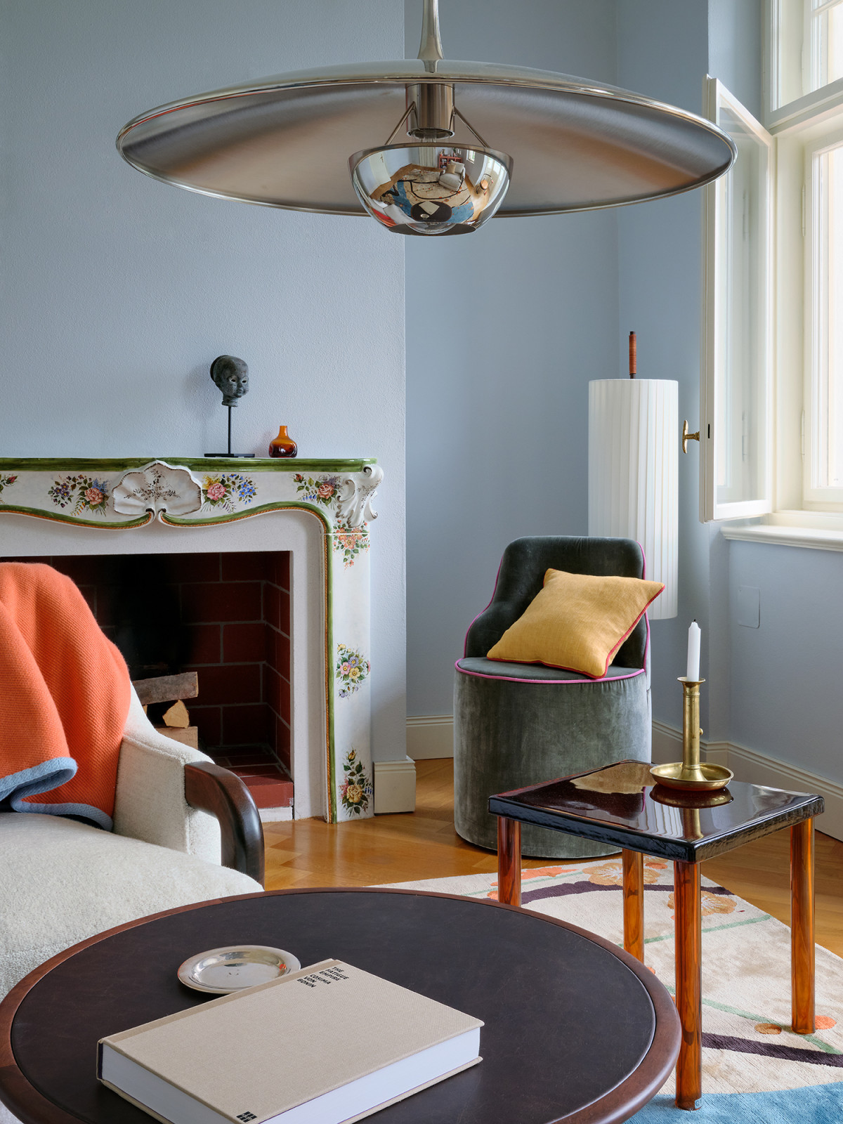 W pokoju wspólnym uwagę zwraca jedna z kilku opraw kominkowych, przywiezionych przez poprzednią właścicielkę z Wielkiej Brytanii, oraz lampa „Onos 55” autorstwa Floriana Schulza. Zdjęcie: Thomas Heimann