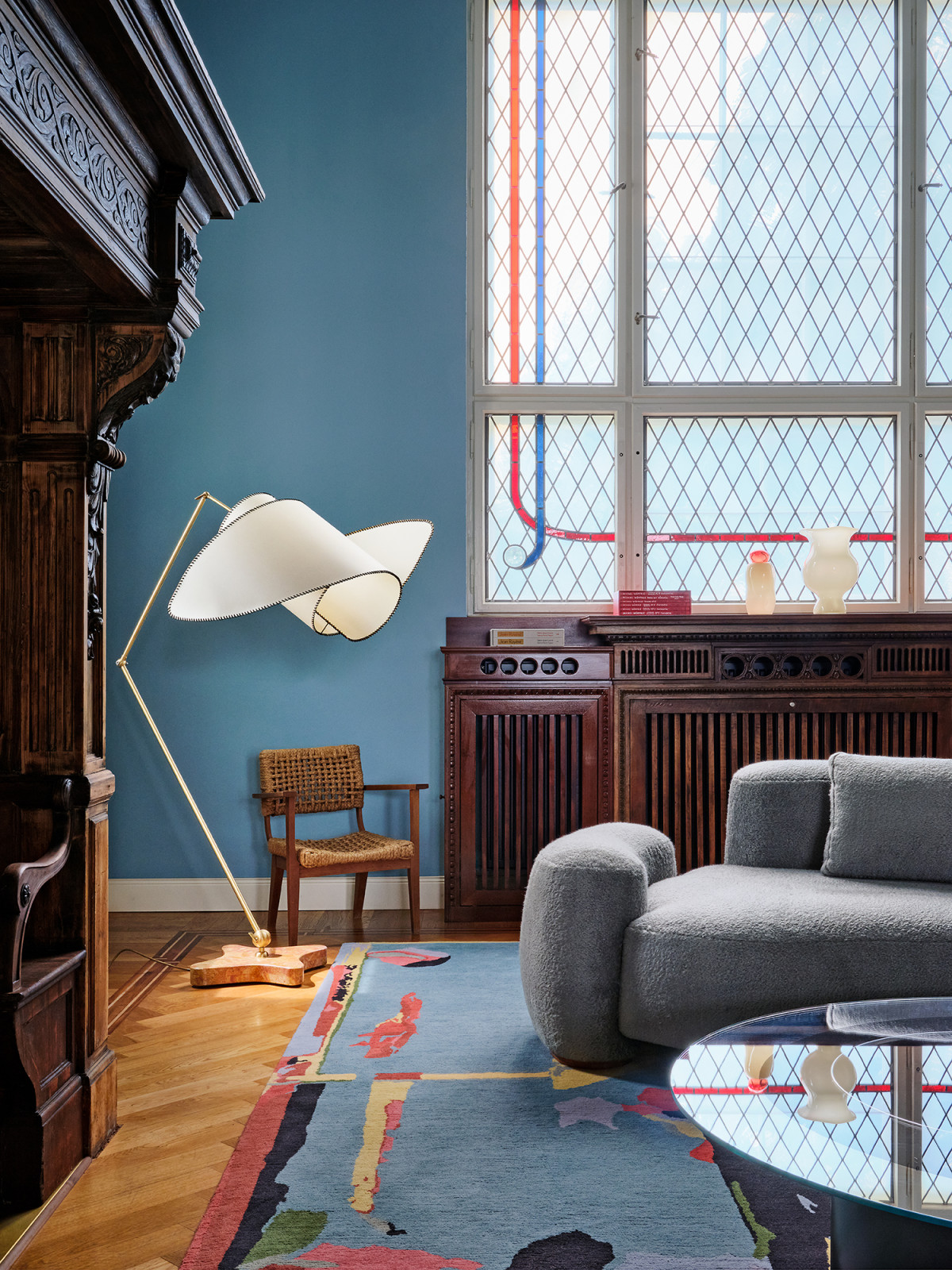 Oryginalne witrażowe okna w salonie zostały poddane renowacji. Wieczorem, przepuszczając ciepłe światło zachodzącego słońca, tworzą na ścianach wysokiej na pięć metrów przestrzeni kolorowe bliki. Z lewej lampa „Suora” projektu Carla Mollina z 1947 roku, z prawej leżanka „Baba” Pöpplera. Zdjęcie: Thomas Heimann