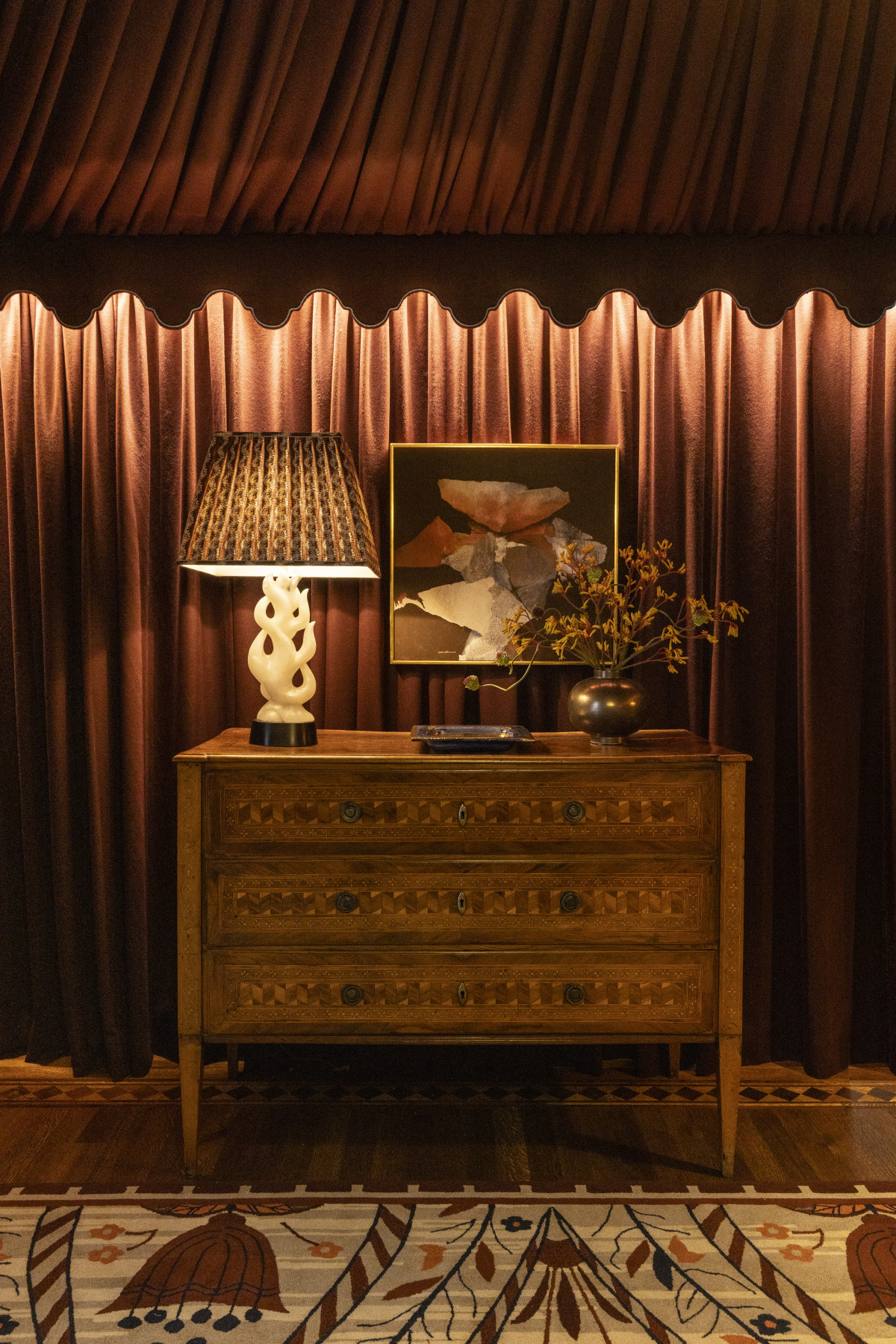 Aranżację dopełniają mosiężne akcenty i zabytkowe elementy wyposażenia jak francuskie, XVIII-wieczne lustro z rzeźbioną, pozłacaną ramą oraz neoklasycystyczna intarsjowana komoda z 1700 roku.