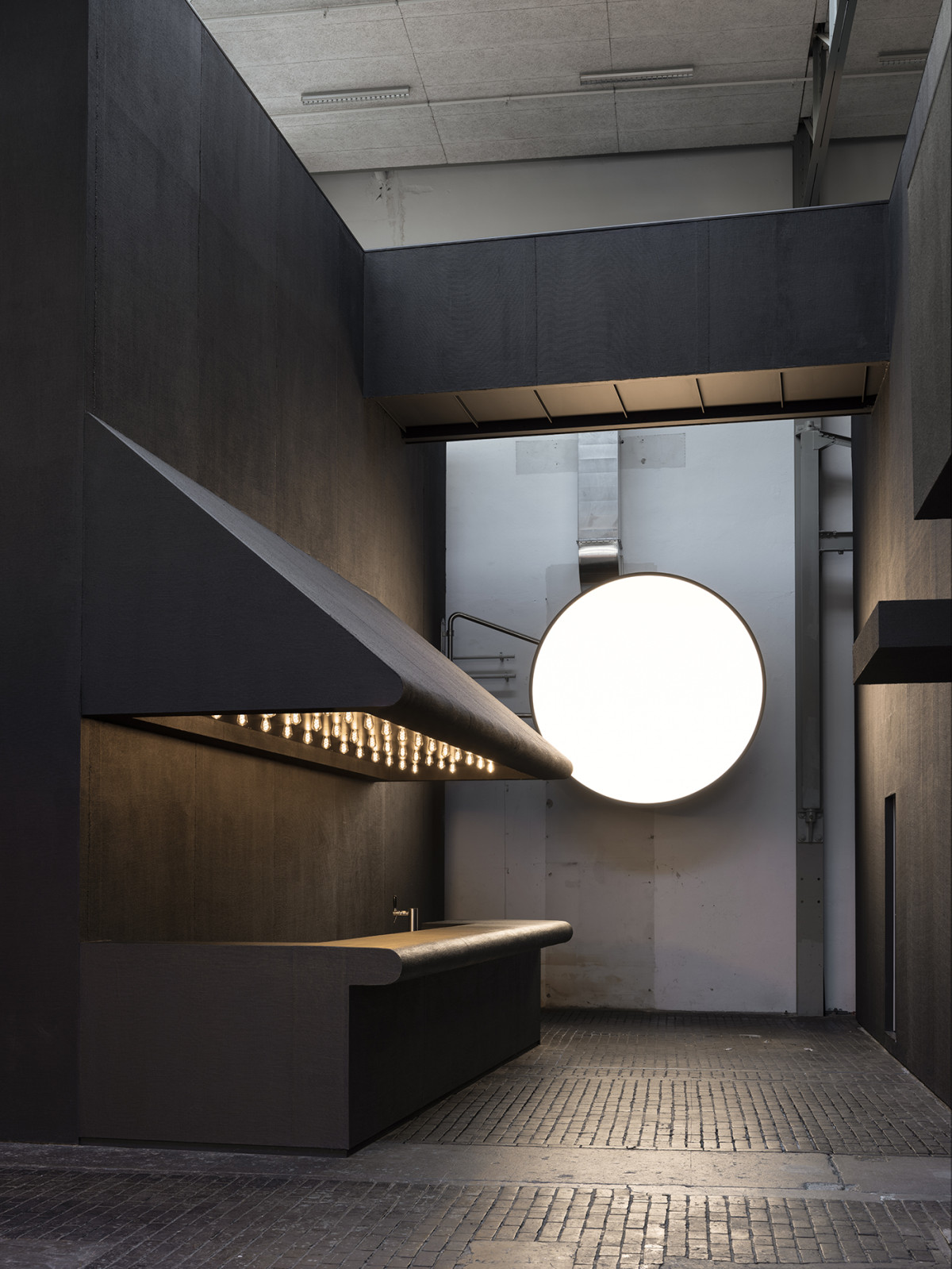 Studio produkcyjne w Genewie inspirowane atmosferą kina noir Banchini zaprojektował z Gioną Bierens de Haan (2023). W poprzemysłowej hali dominują odcienie czerni i geometryczne kształty podkreślone przez sztuczne oświetlenie. Zdjęcie: Dylan Perrenoud