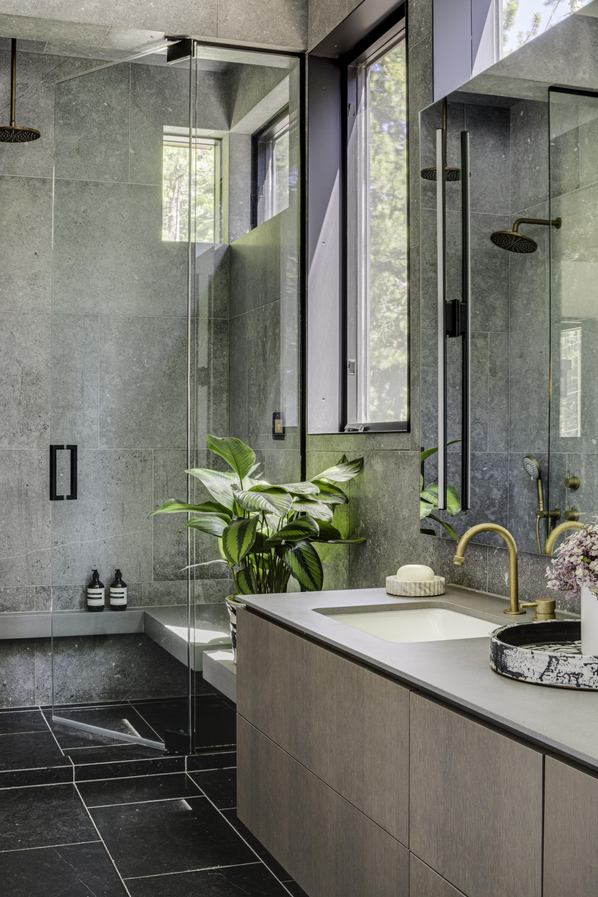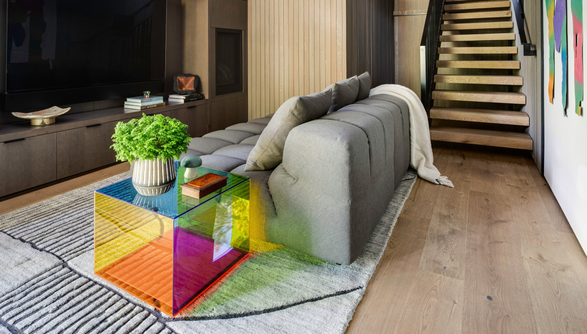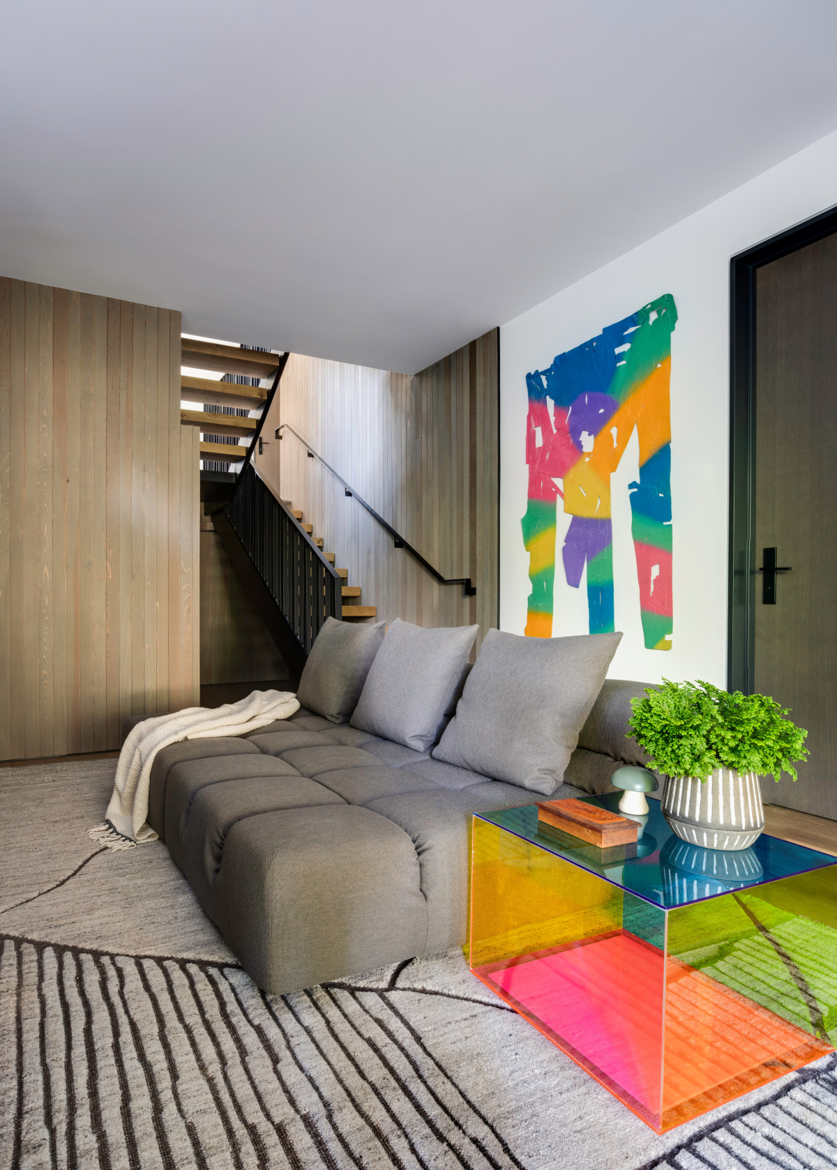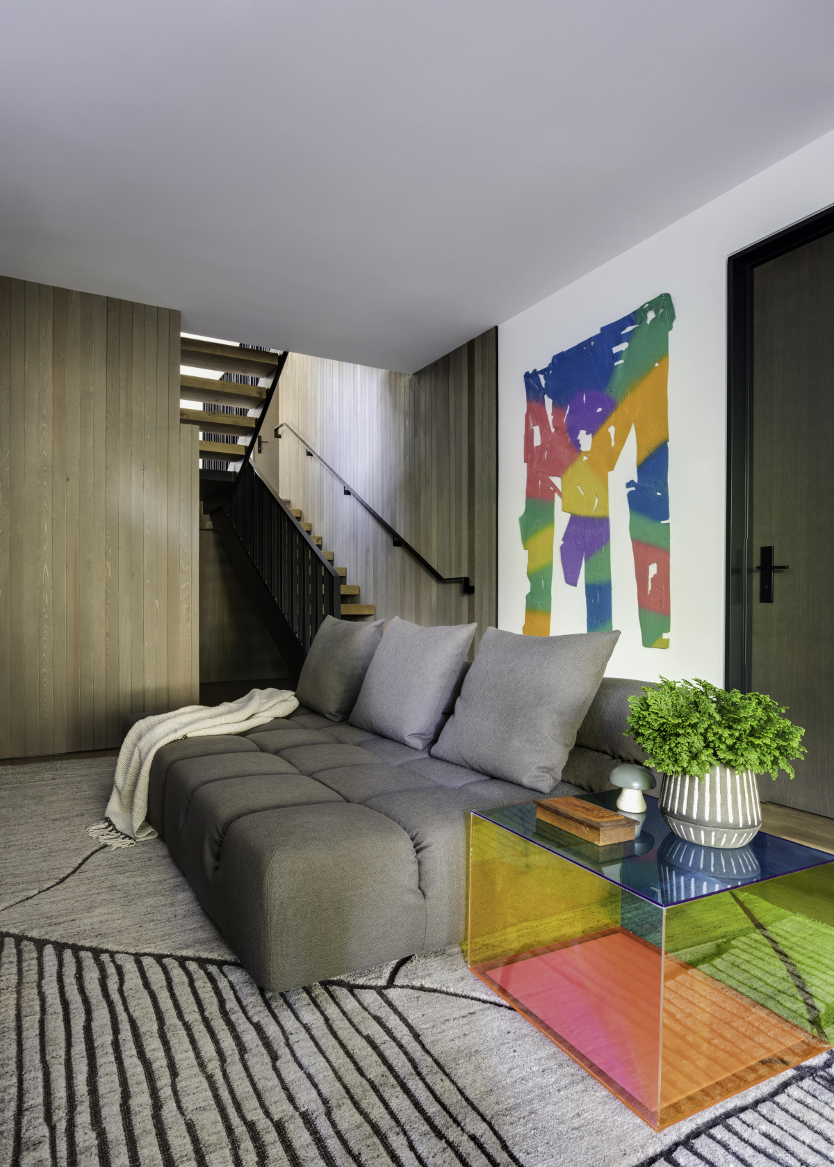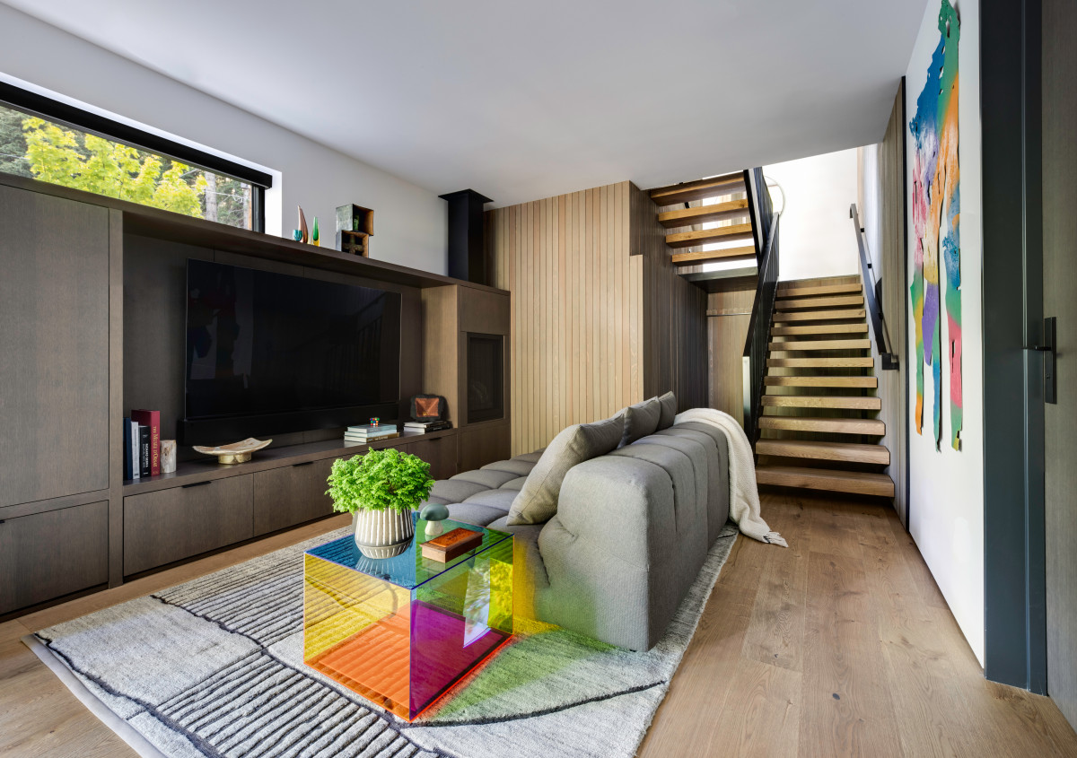 We wnętrzu królują naturalne materiały, jak drewno i kamień, a kojąca paleta barwna płynnie łączy się z otaczającym dom krajobrazem. Mocniejszy kolor pojawia się sporadycznie, jako detal subtelnie ożywiający przestrzeń. Dobrym przykładem jest pokój telewizyjny, gdzie drewno i szarości przełamano neonowymi kolorami stolika kawowego i wielkoformatowym dziełem sztuki o podobnej kolorystyce.