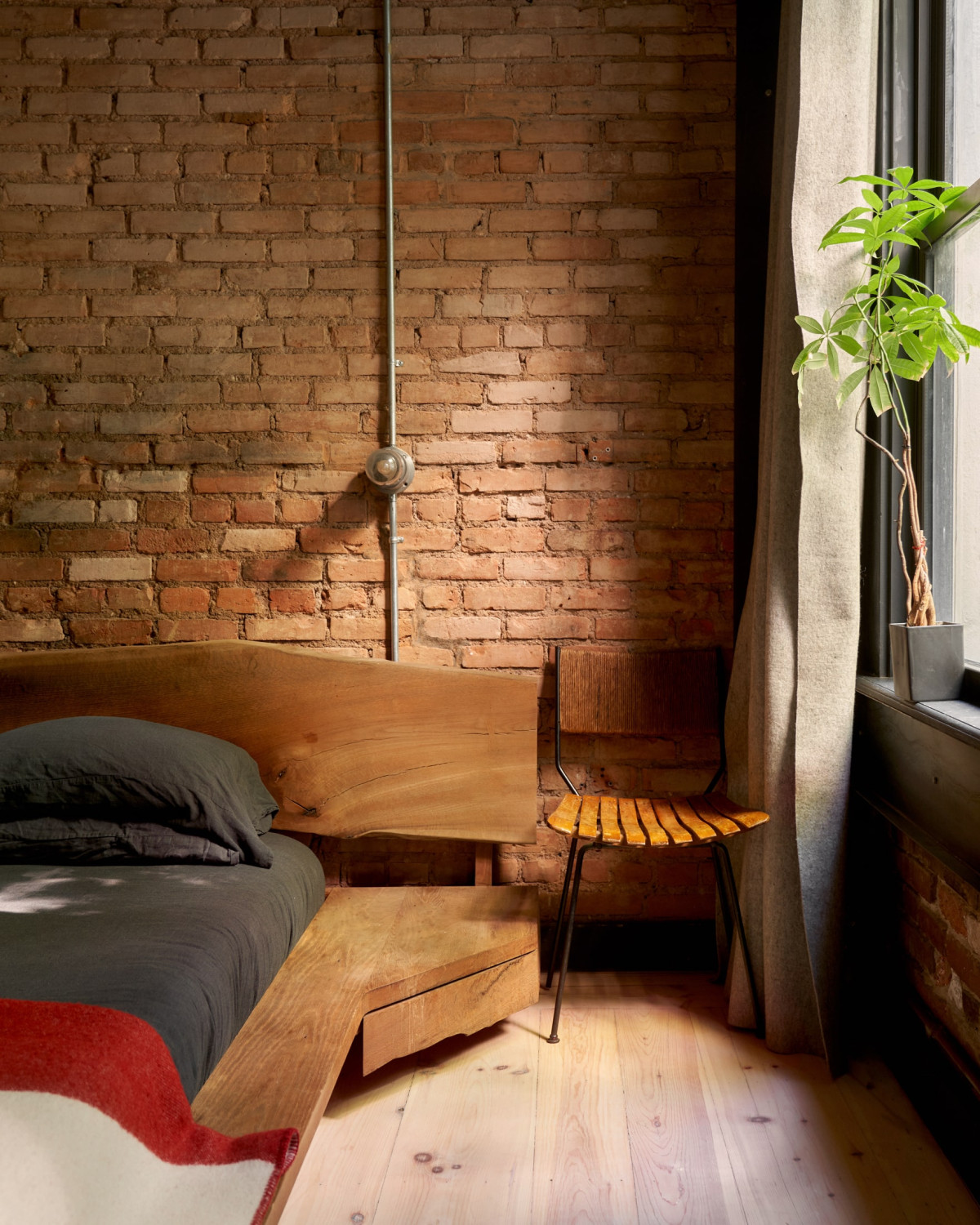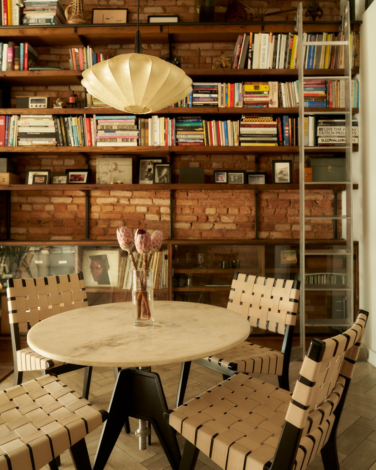 Wpływ babci Gabriela nie skończył się tylko na witrażu. Jej ulubiony kolor, czerwień, również wpłynął na kolorystykę wnętrz, podobnie jak jej pomysłowe półki z cegieł i desek, które projektant odtworzył w sypialni. W spadku po babci Gabriel otrzymał też jej kolekcję mebli vintage. W lofcie znalazły swoje miejsce m.in. krzesła Jens Risom, krzesła Arthura Umanoffa czy fotel Hansa Wegnera.